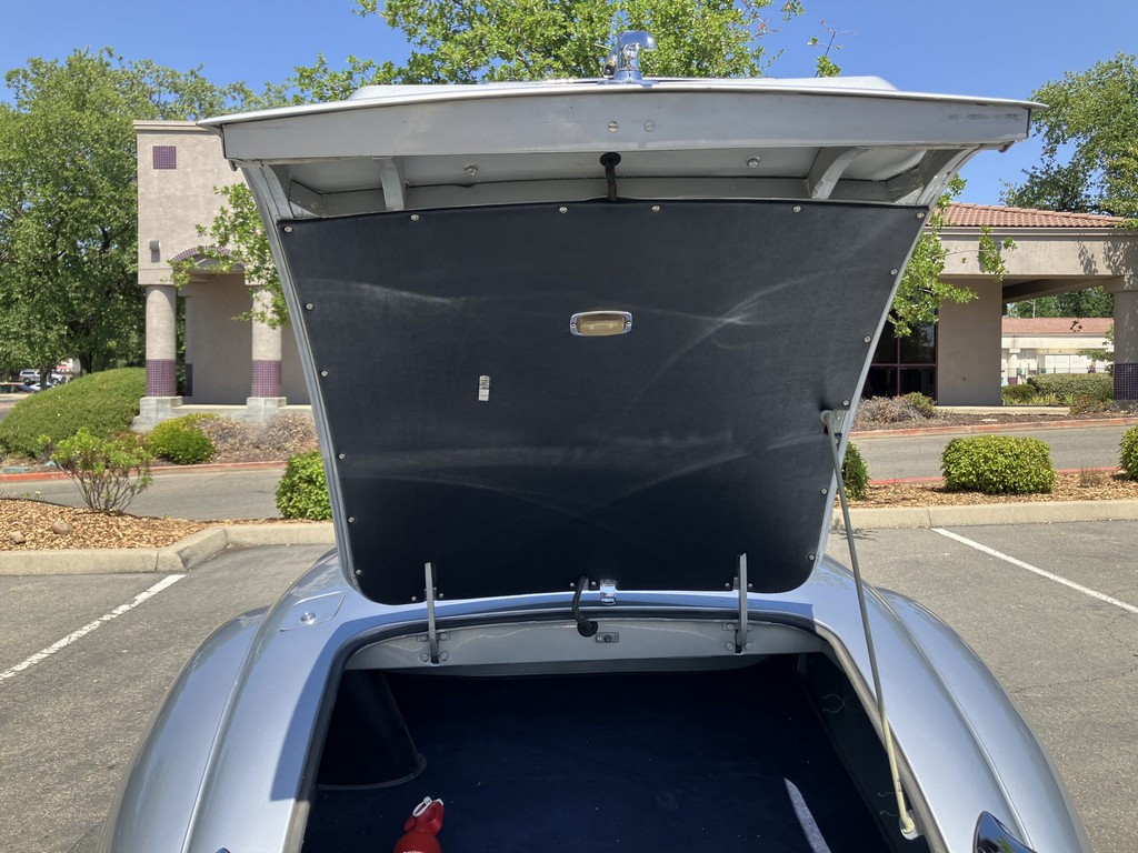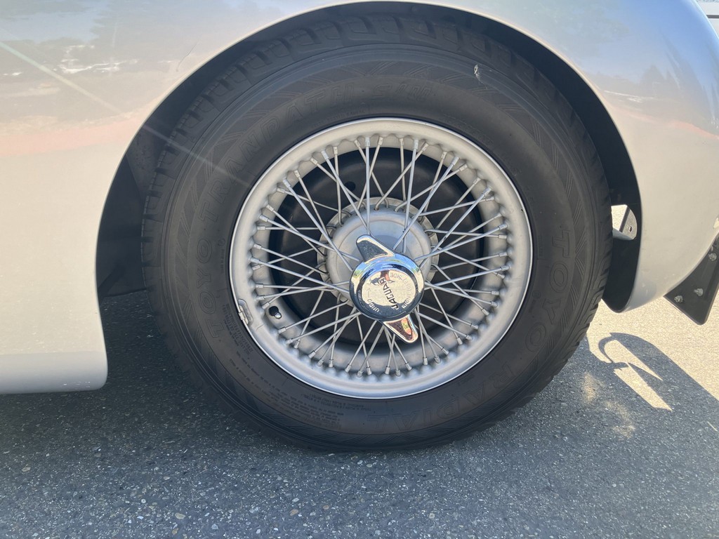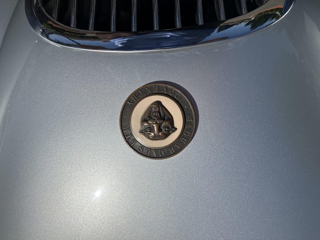 Finished in silver with a two-tone blue leather interior, this XK120 exudes timeless British elegance. The body retains signature features such as the split front windshield, chrome bumpers with bumperettes, and 16-inch chrome wire wheels with knock-off hubs. The interior has been reupholstered in blue leather with matching carpets and door panels, complemented by Smiths gauges, a dashboard-mounted rearview mirror, and lap belts. A blue soft top accompanies the car, though it has rarely been raised in recent years.