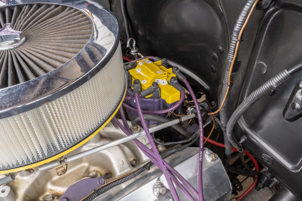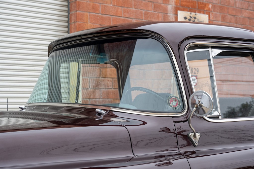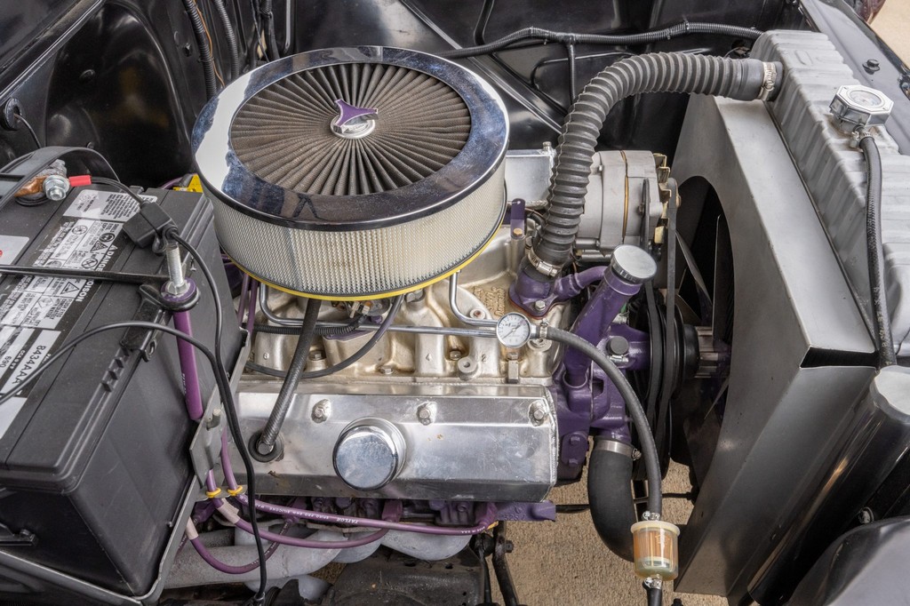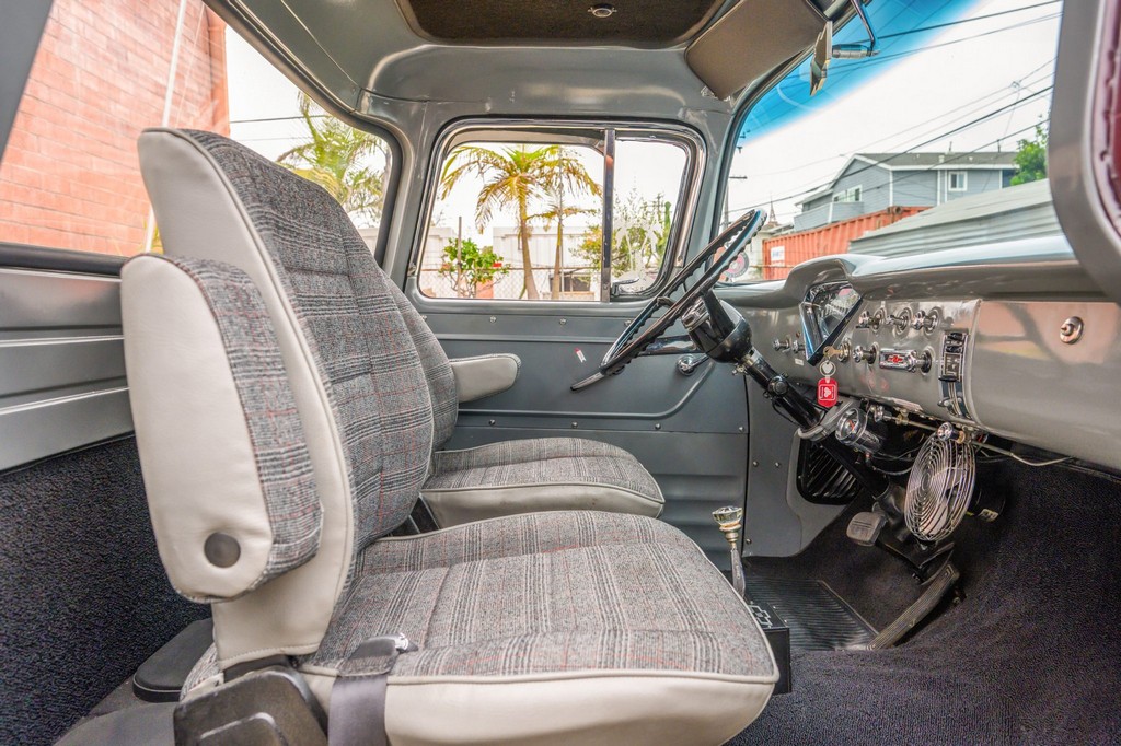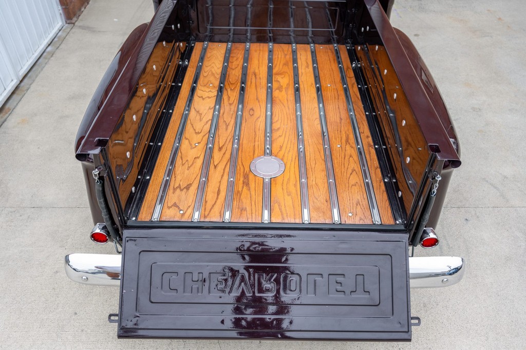 Finished in striking maroon with plaid-trimmed bucket seats and a wood-plank bed, it retains vintage charm while offering hot rod flair.