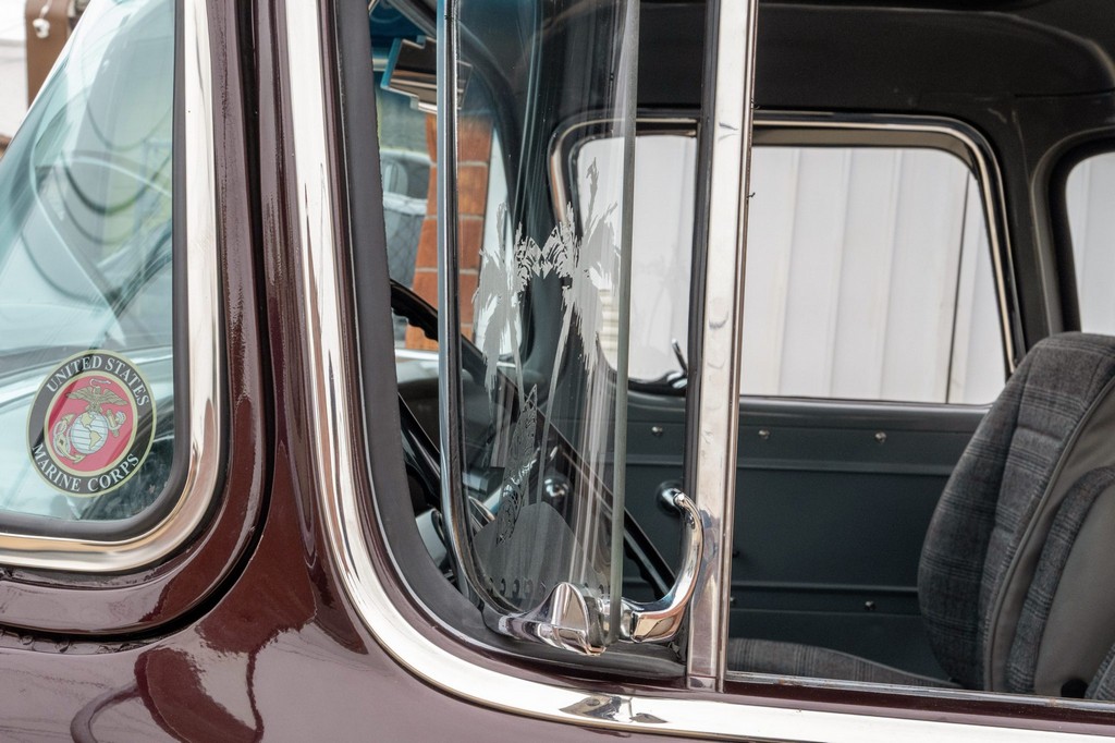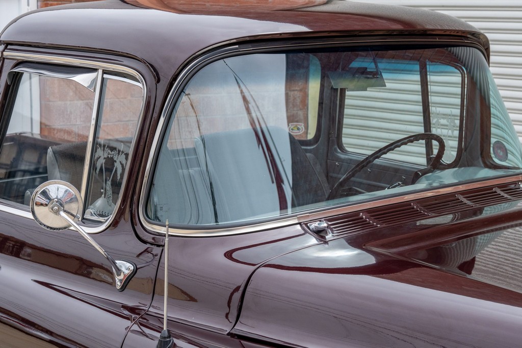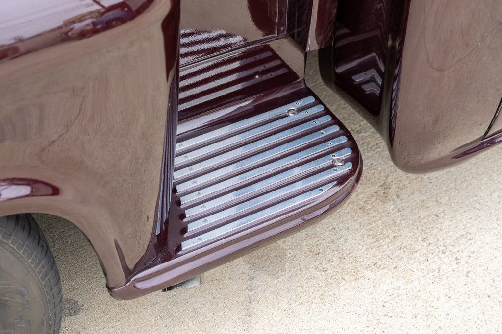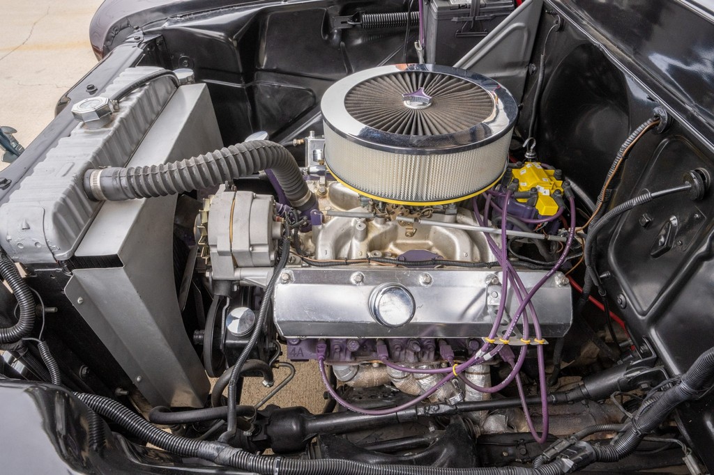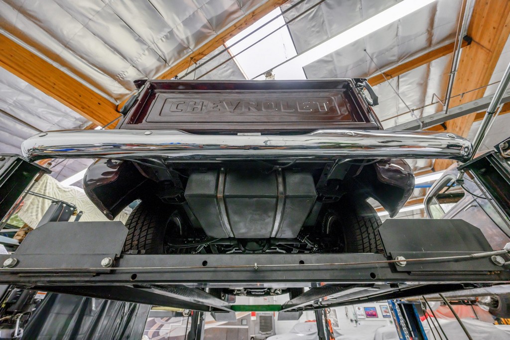Finished in striking maroon with plaid-trimmed bucket seats and a wood-plank bed, it retains vintage charm while offering hot rod flair.
