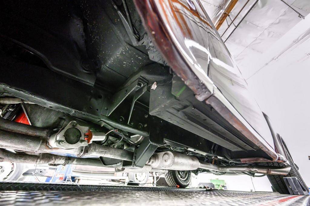 Dual exhaust outlets exiting ahead of the rear tires