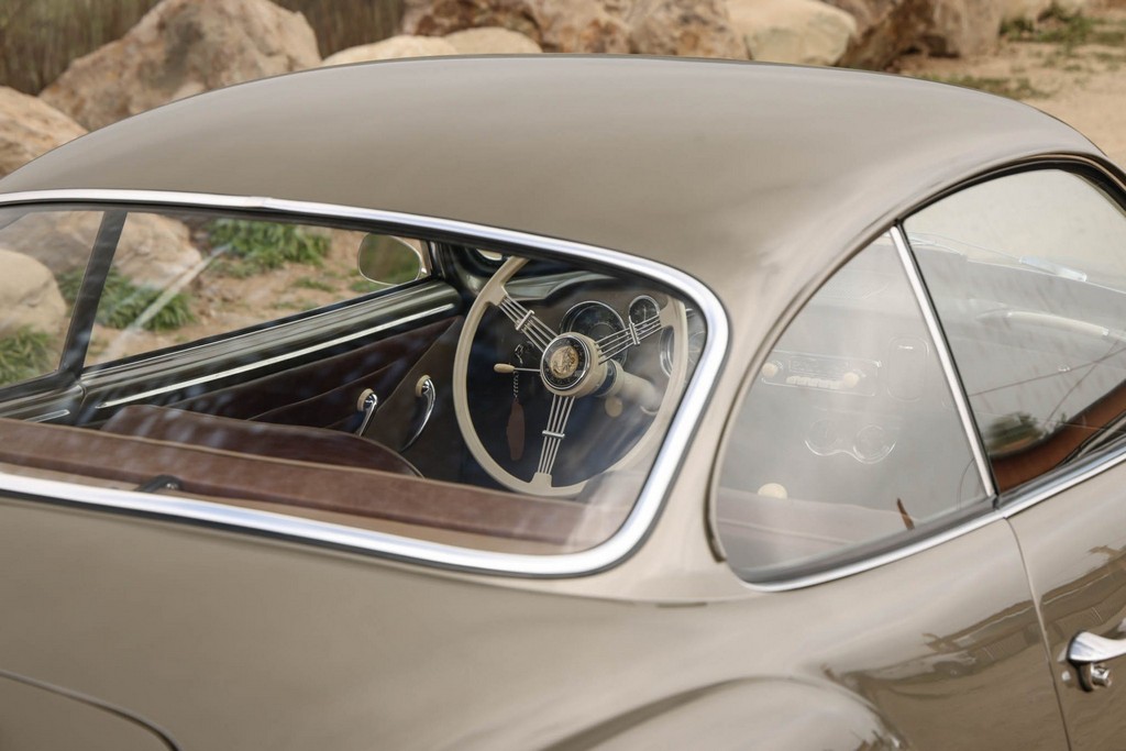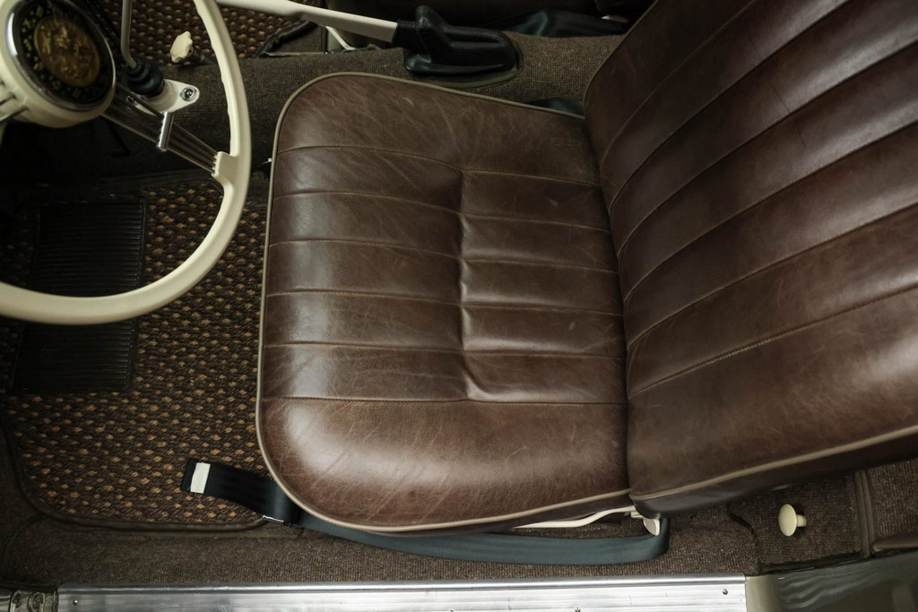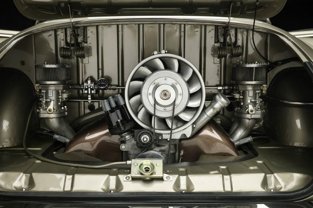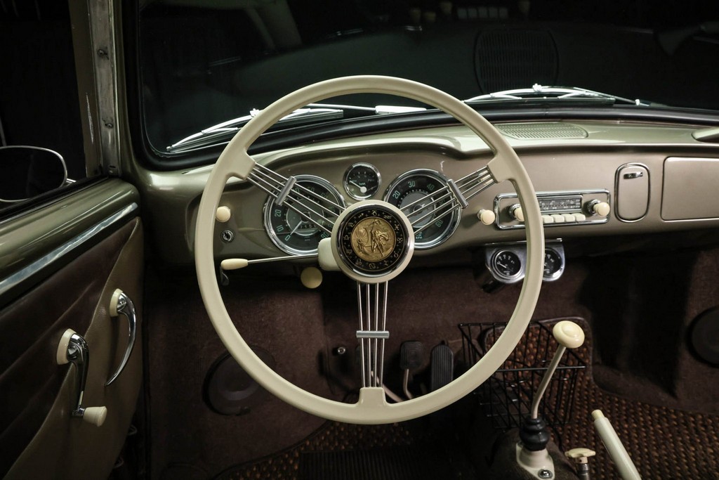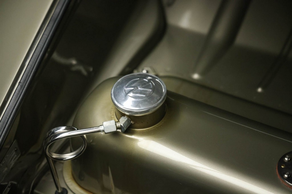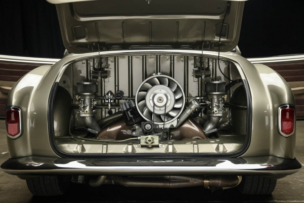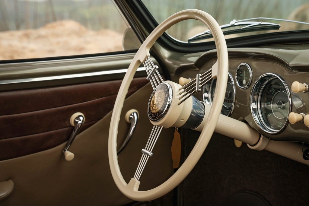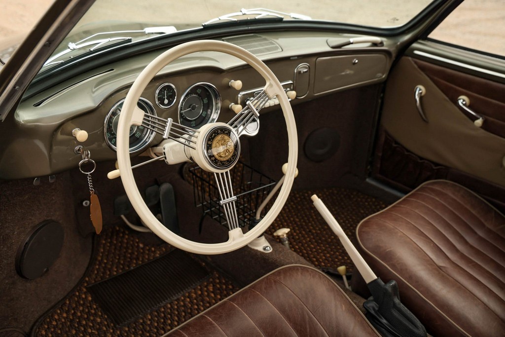 The interior has been reupholstered in a rich two-tone tan and brown scheme, pairing clean stitching and updated materials with the simplicity of mid-century Volkswagen design. The dashboard remains elegant and minimalist, now accented by a banjo-style steering wheel that adds a touch of classic sportiness.