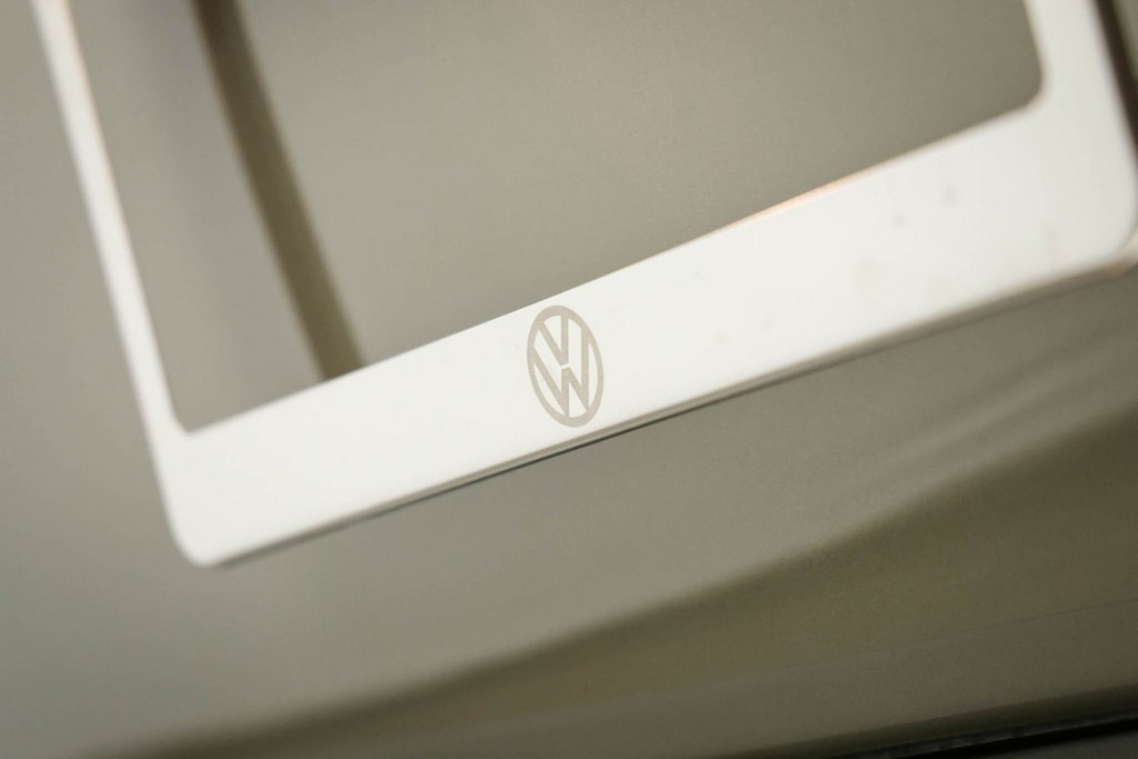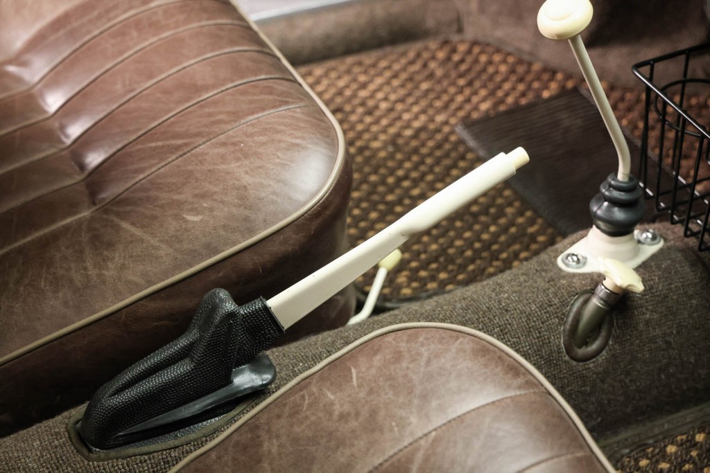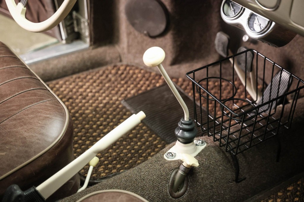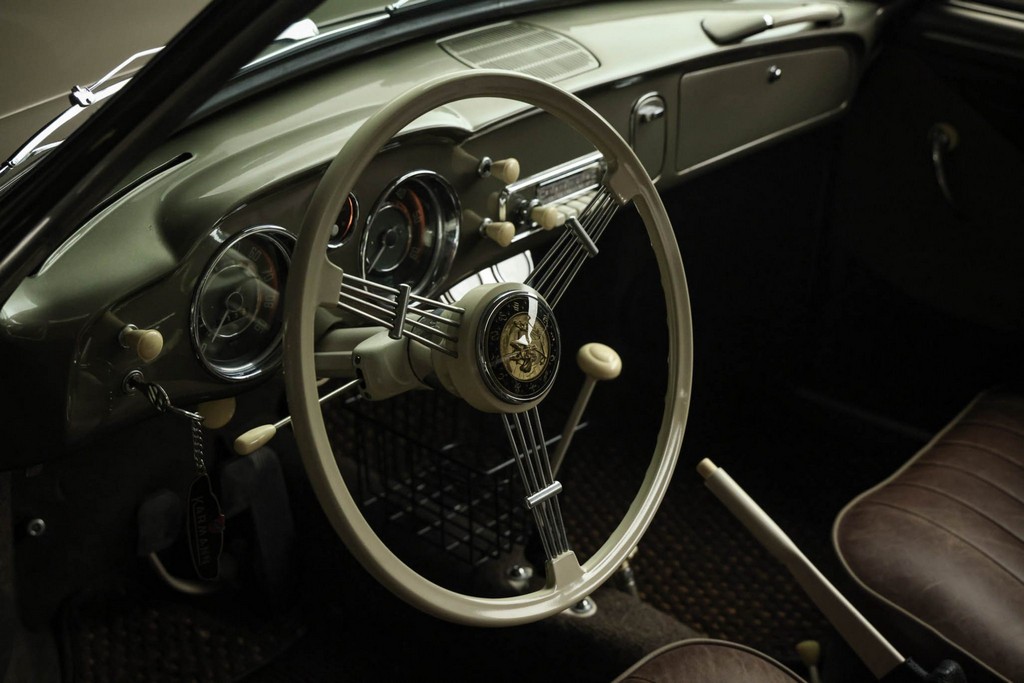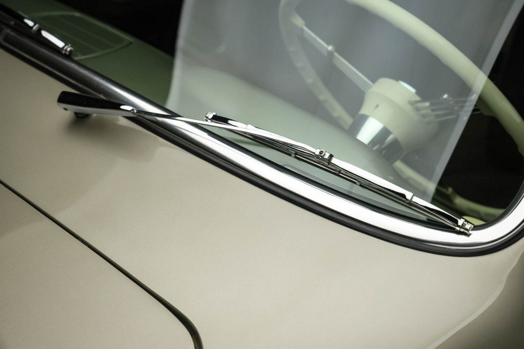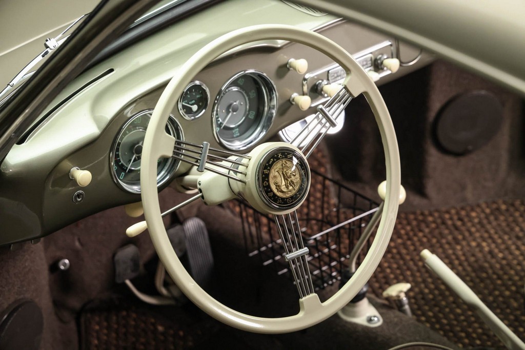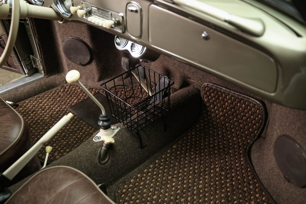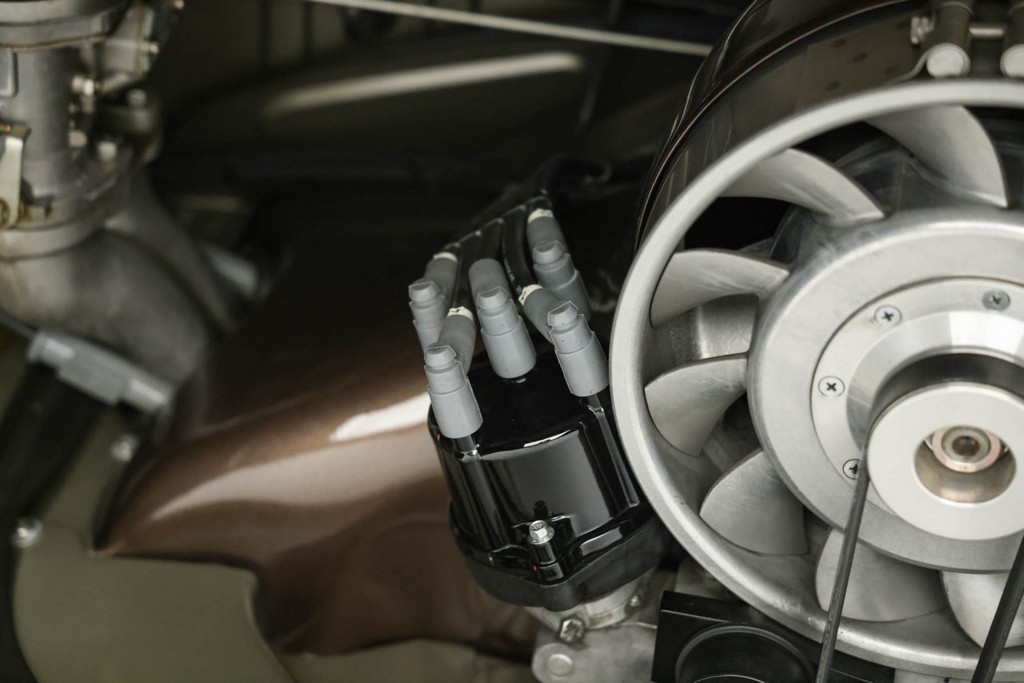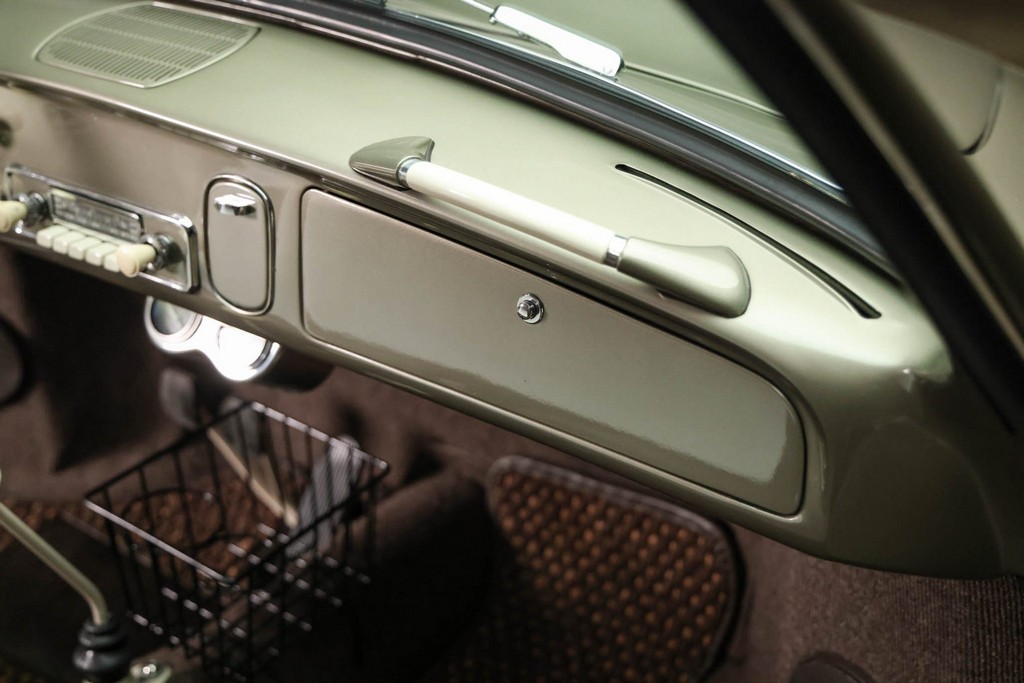The interior has been reupholstered in a rich two-tone tan and brown scheme, pairing clean stitching and updated materials with the simplicity of mid-century Volkswagen design. The dashboard remains elegant and minimalist, now accented by a banjo-style steering wheel that adds a touch of classic sportiness.