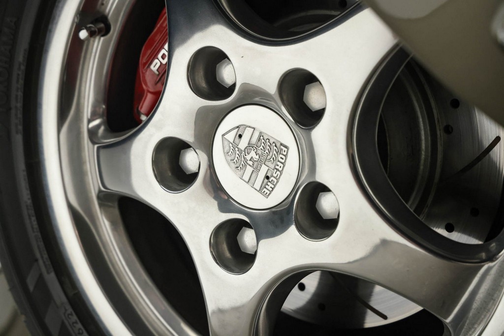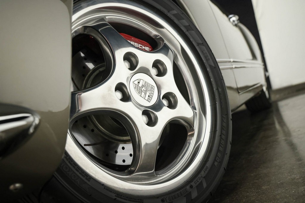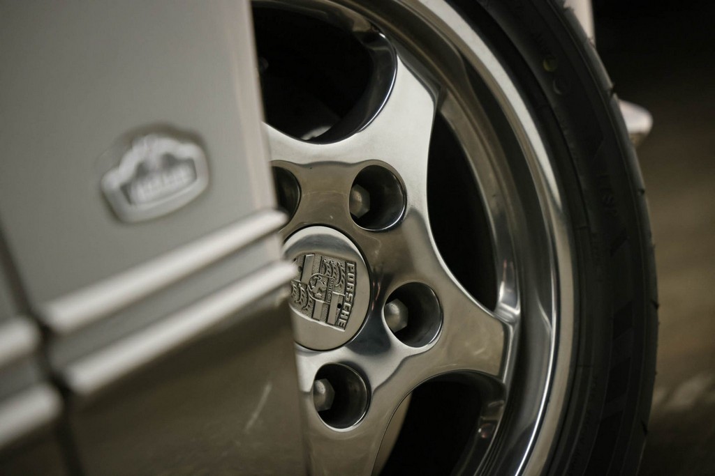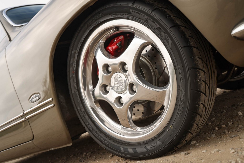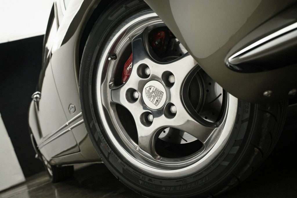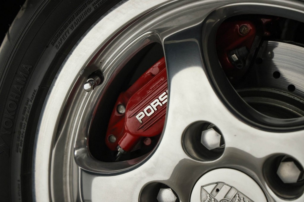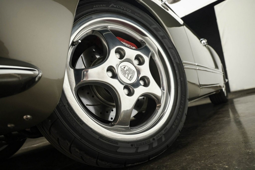 At each corner sit 16″ Porsche Cup-style alloy wheels, wrapped in performance rubber, giving the car a purposeful stance while preserving a cohesive German sports car aesthetic. The lowered and modified suspension tucks the wheels neatly into the arches, contributing to a planted, aggressive look. Lighting and glass all present cleanly, and panel alignment is tight for a car of this vintage.
