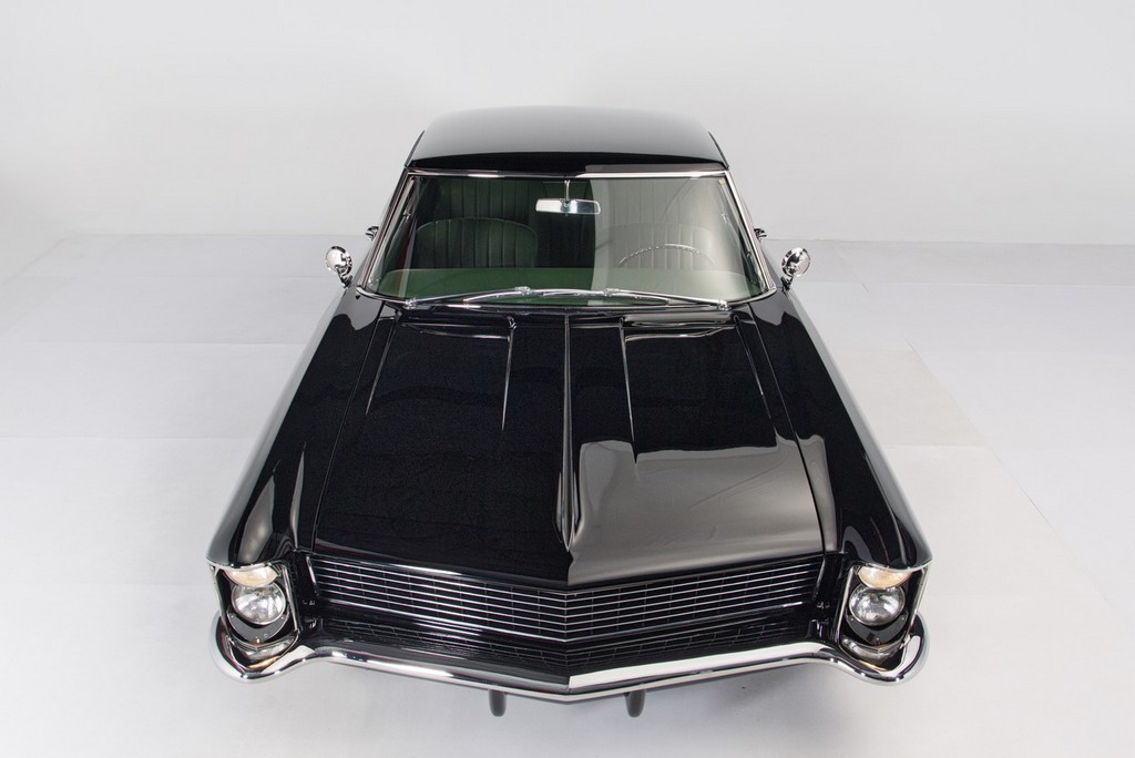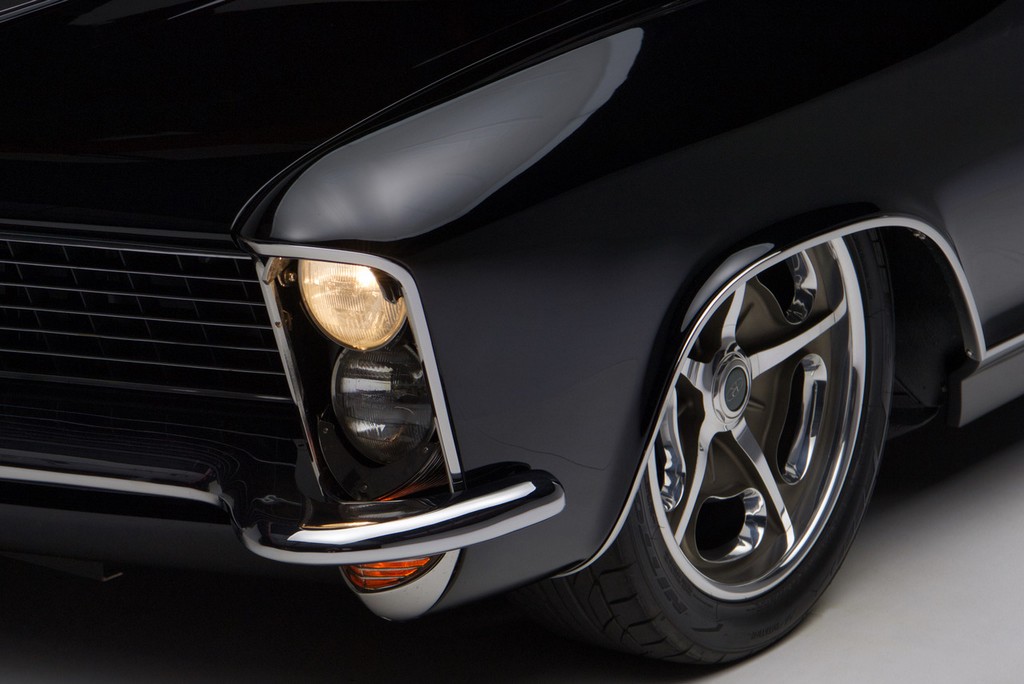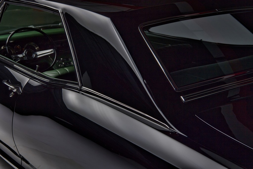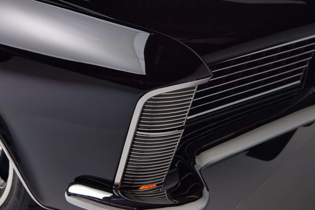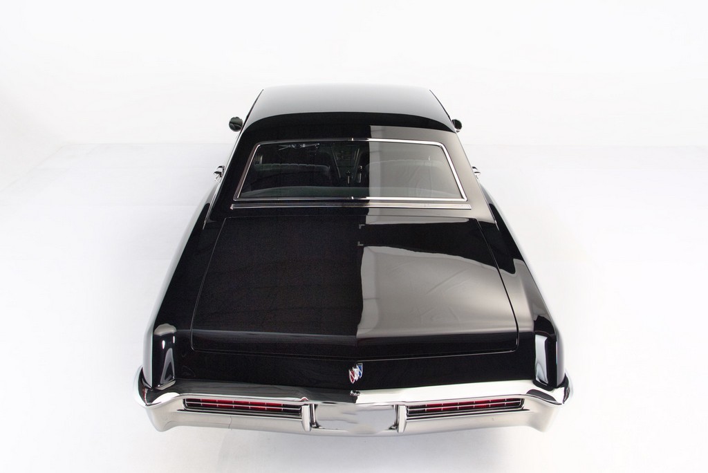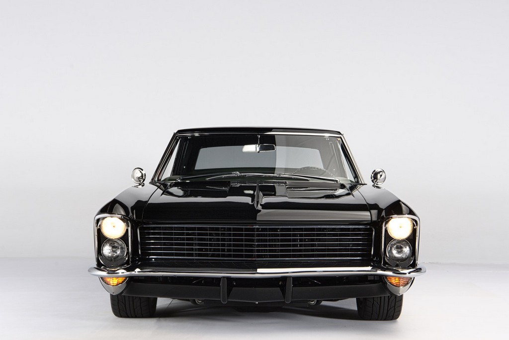 The Riviera’s body was smoothed and refinished in deep black, with the front cowl filled and the antenna, emblems, rocker trim, and lower grille trim deleted for a cleaner, modernized look. The vertical grille elements were refinished in black, further accentuating the car’s aggressive, monochromatic aesthetic. The result is a sleek, minimalist silhouette that honors the original design while adding contemporary flair.