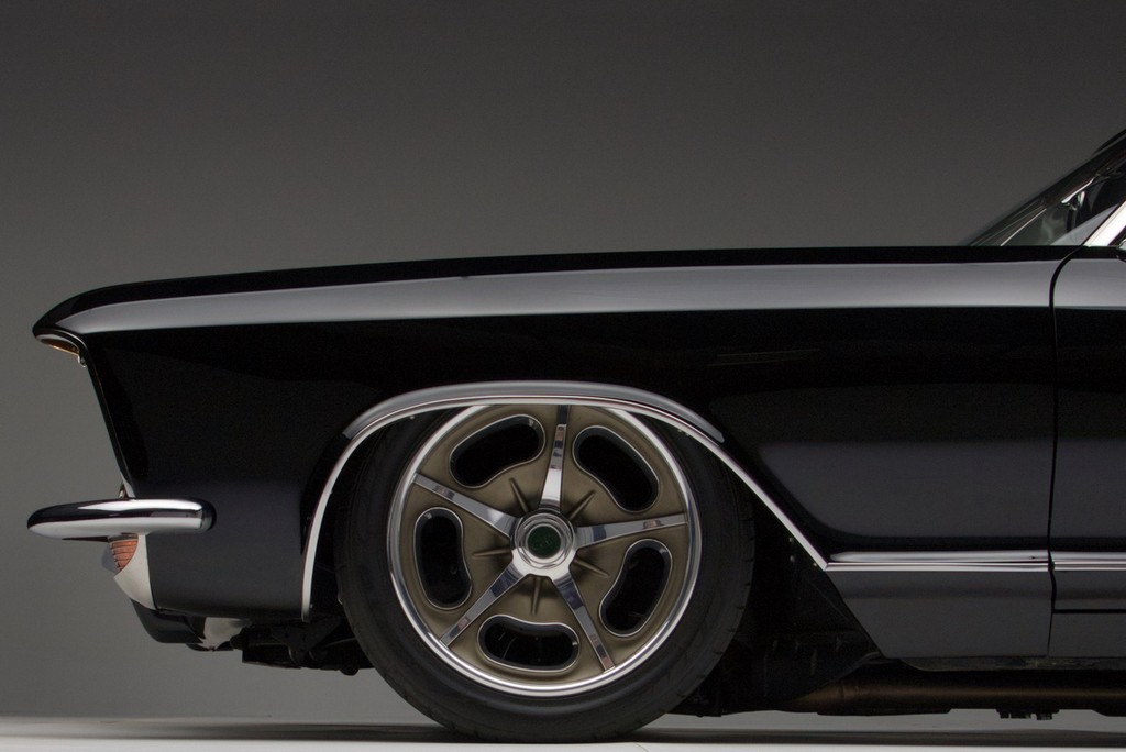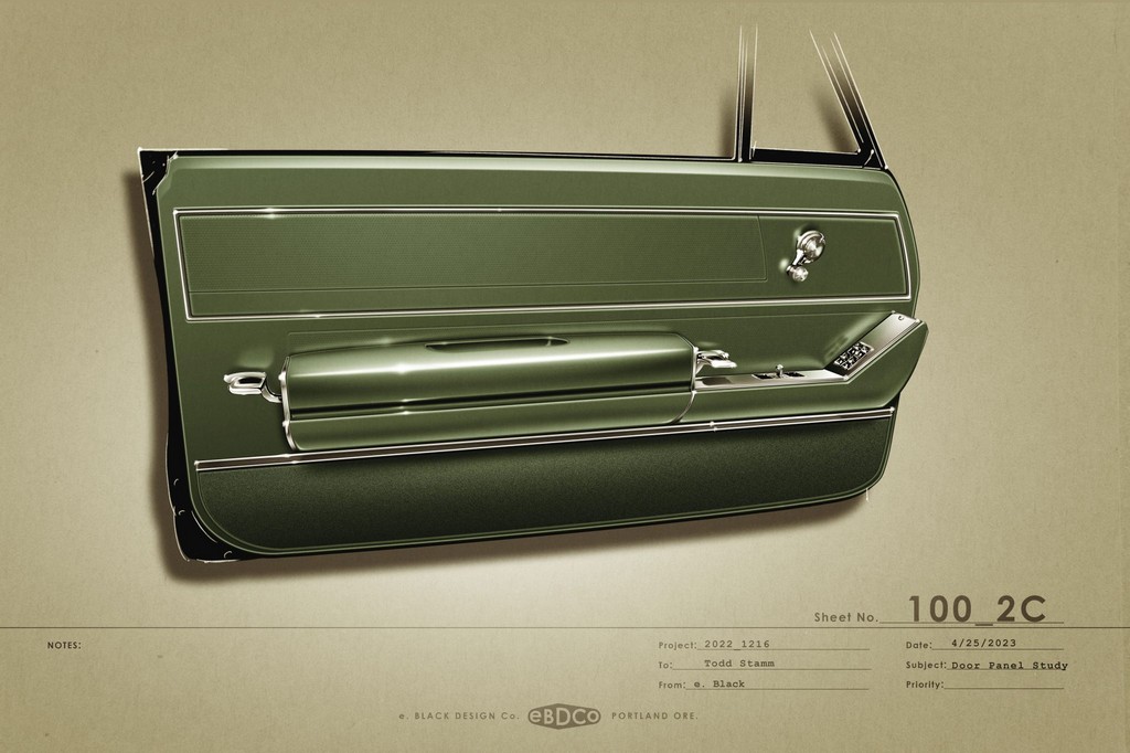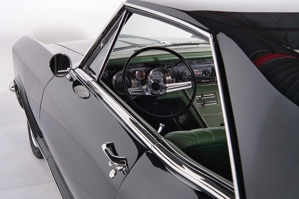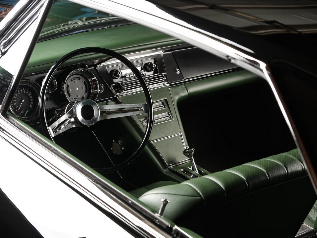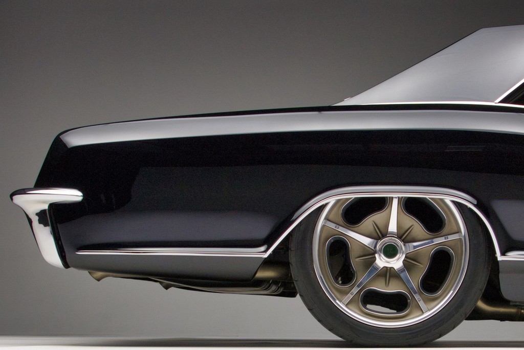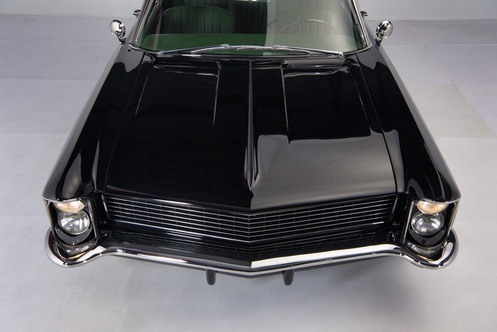 The Riviera’s body was smoothed and refinished in deep black, with the front cowl filled and the antenna, emblems, rocker trim, and lower grille trim deleted for a cleaner, modernized look. The vertical grille elements were refinished in black, further accentuating the car’s aggressive, monochromatic aesthetic. The result is a sleek, minimalist silhouette that honors the original design while adding contemporary flair.