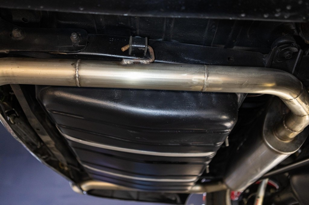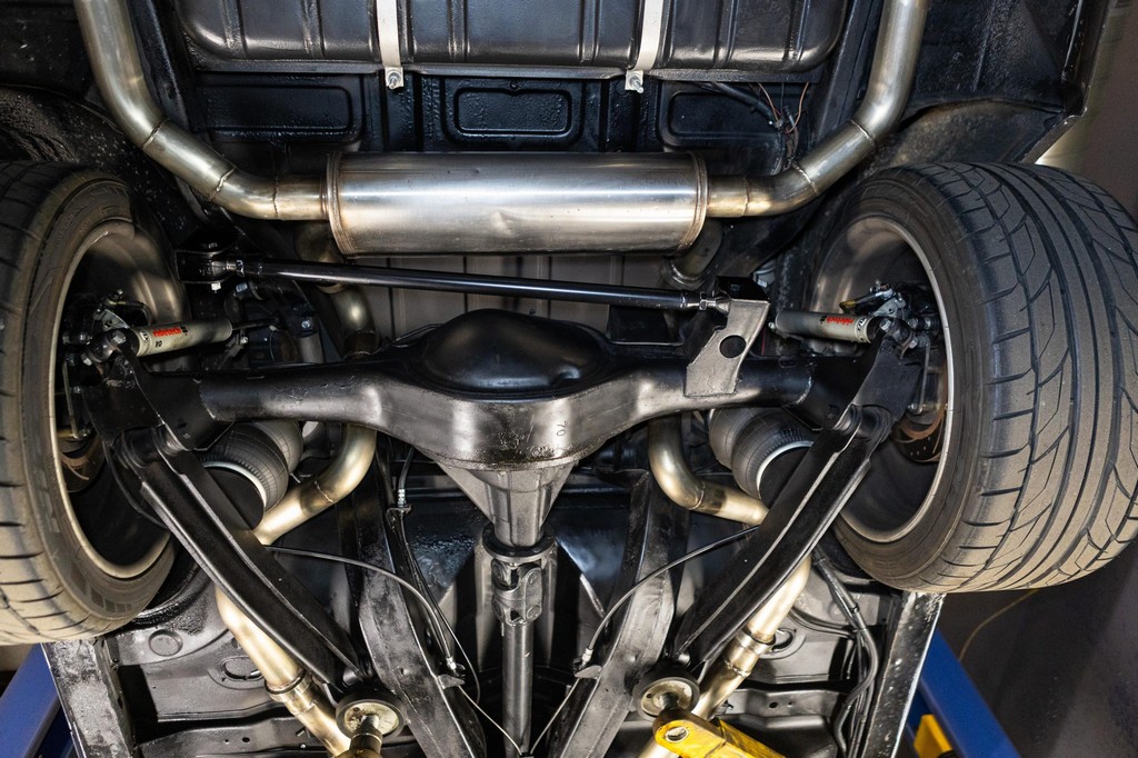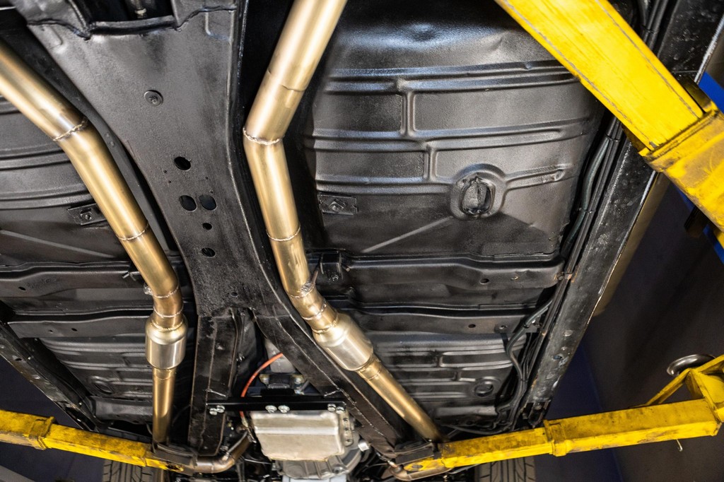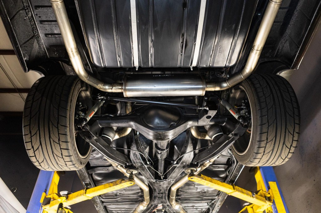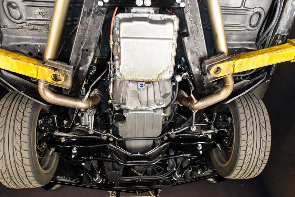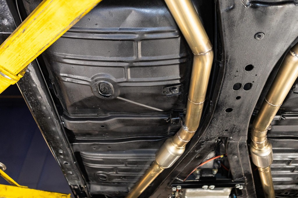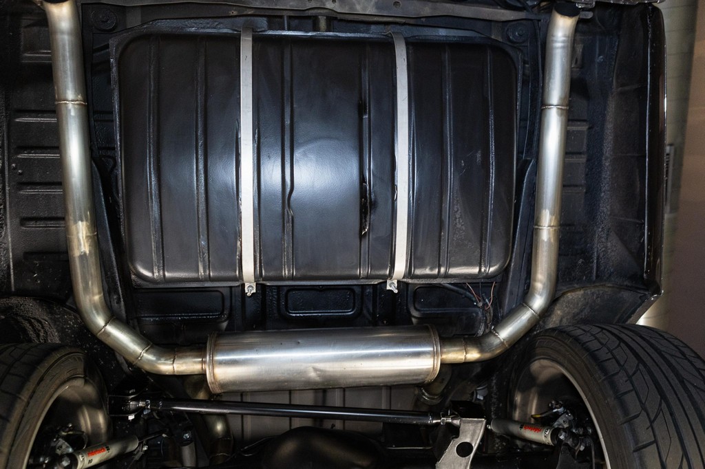The build includes a custom stainless-steel exhaust system with 2.5″ headers and Stainless Works mufflers, along with a Walbro fuel pump, Billet Specialties water pump, and MSD ignition components. The valve covers are finished in gray Cerakote, while an Optima battery sits beneath a custom enclosure for a clean presentation.