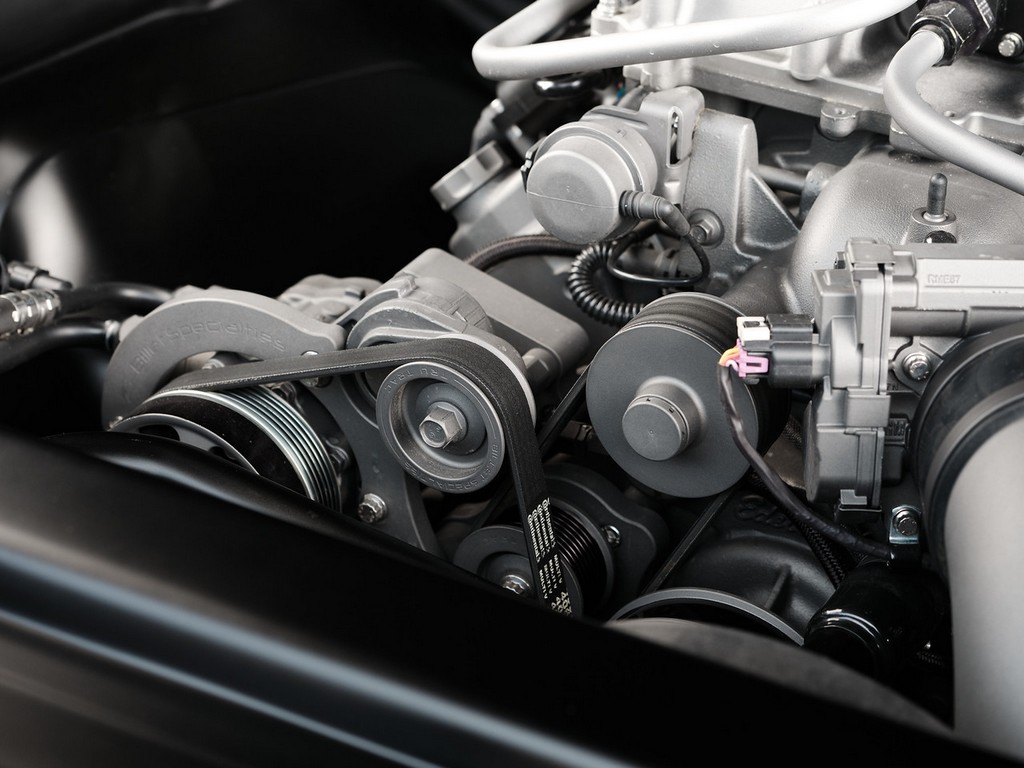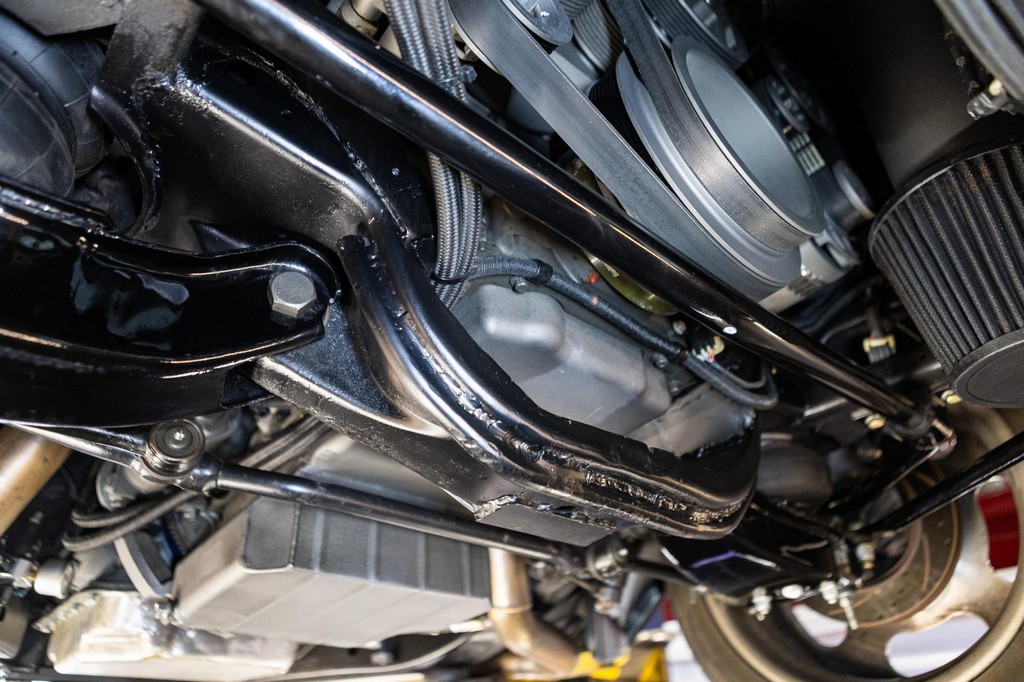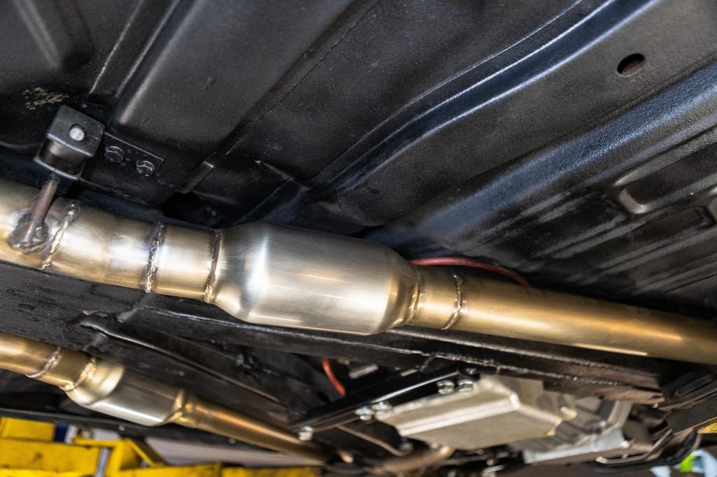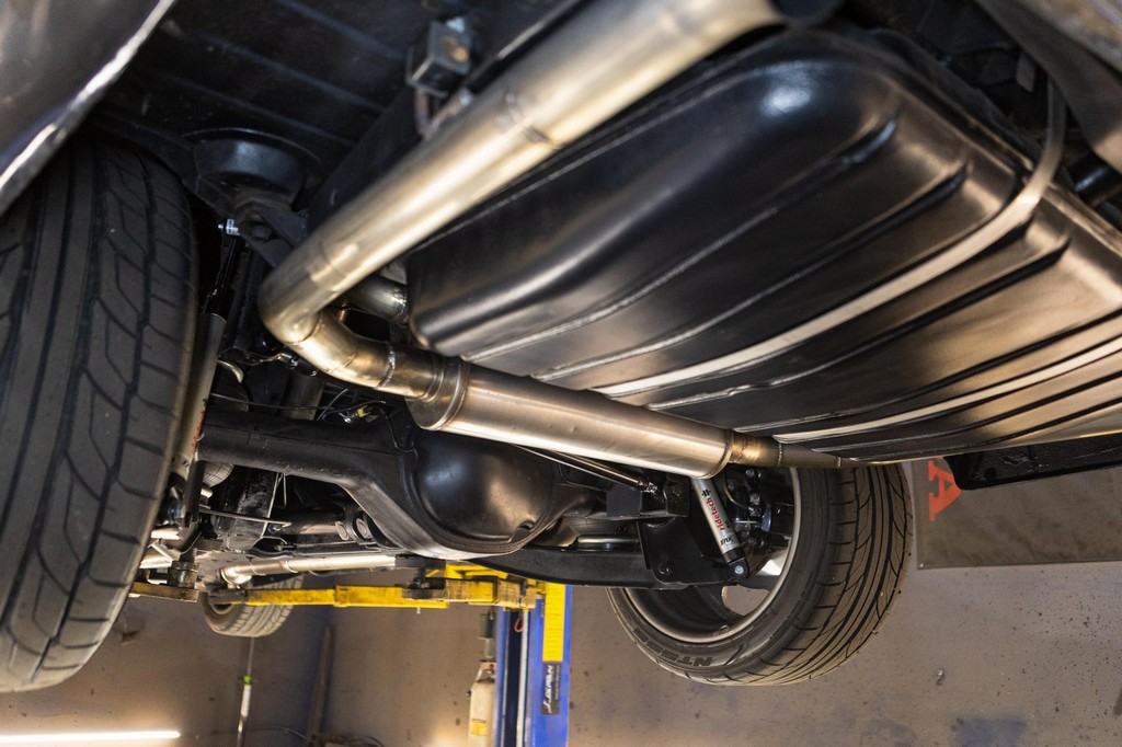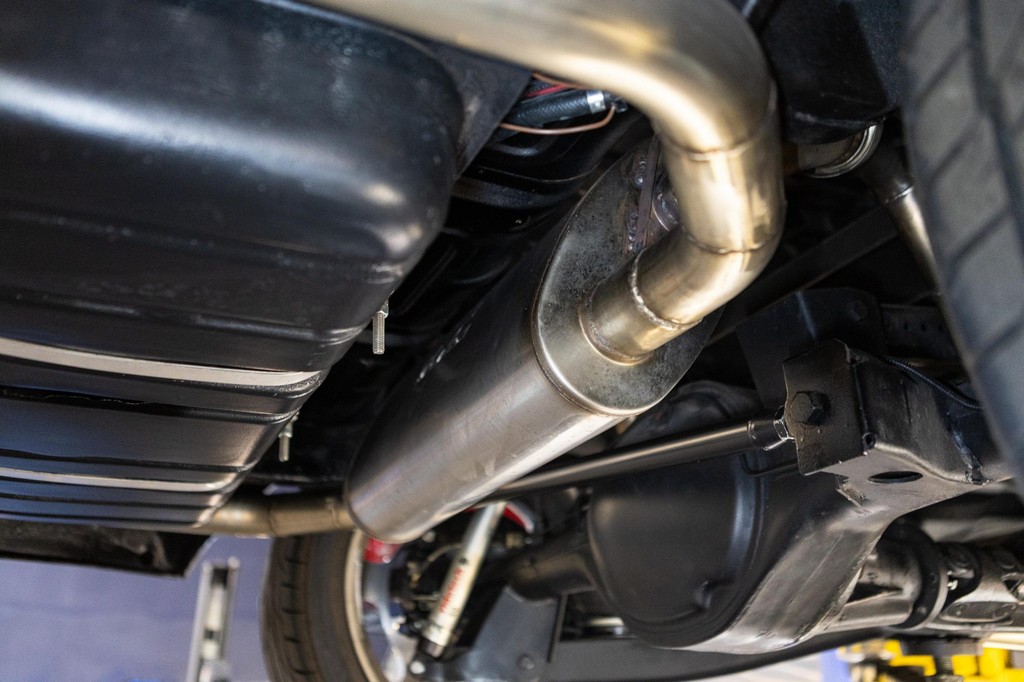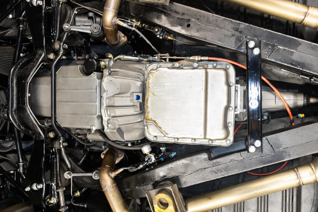 The build includes a custom stainless-steel exhaust system with 2.5″ headers and Stainless Works mufflers, along with a Walbro fuel pump, Billet Specialties water pump, and MSD ignition components. The valve covers are finished in gray Cerakote, while an Optima battery sits beneath a custom enclosure for a clean presentation.
