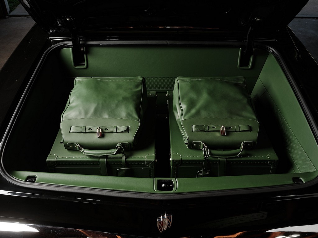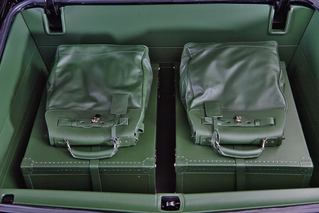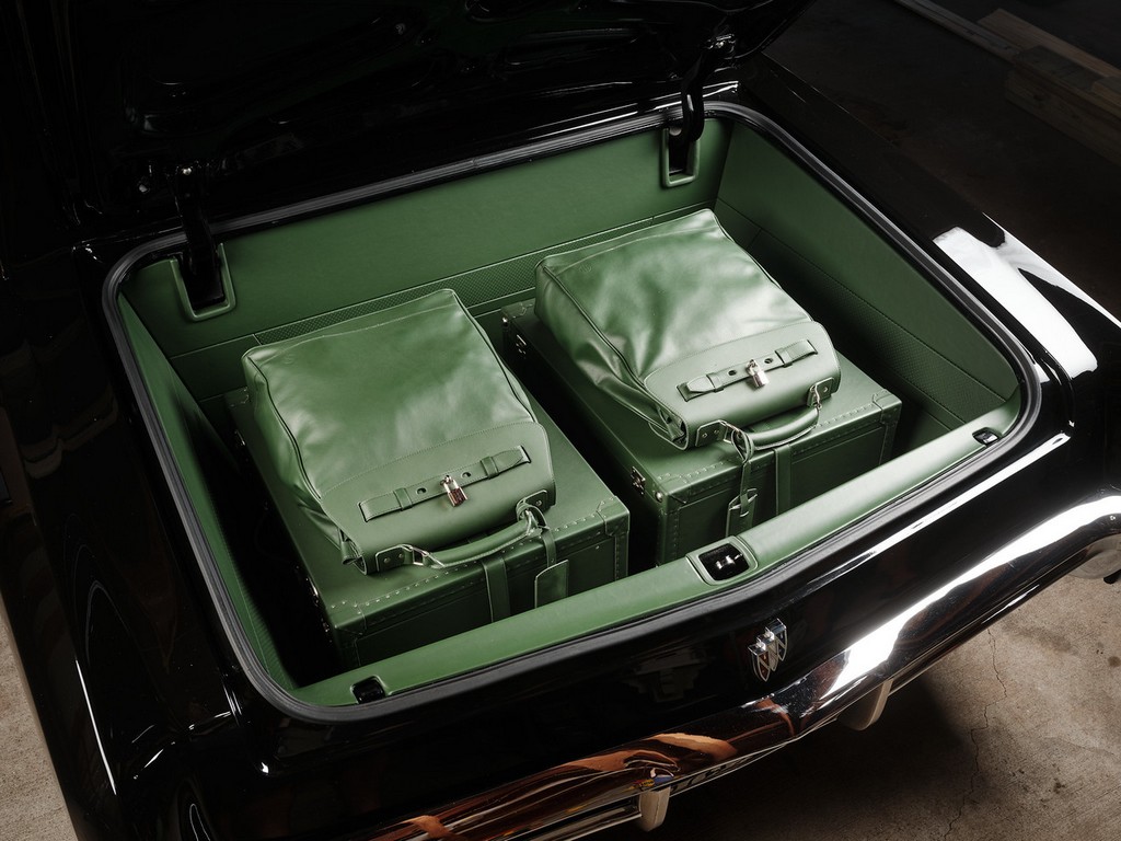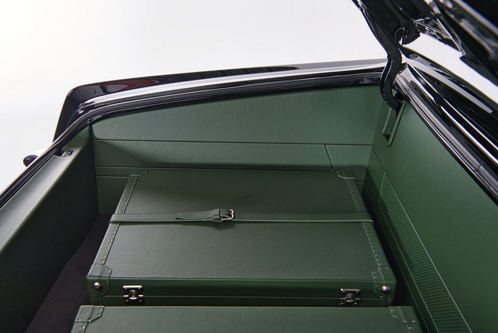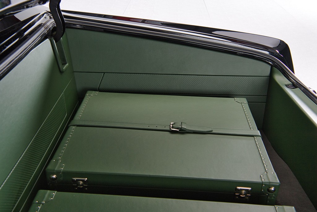 The trunk compartment is fully upholstered in matching green leather and includes a four-piece custom luggage set by Laurent Nay of Broût-Vernet, France, inspired by the Mercedes-Benz 300SL, adding a bespoke finishing touch.