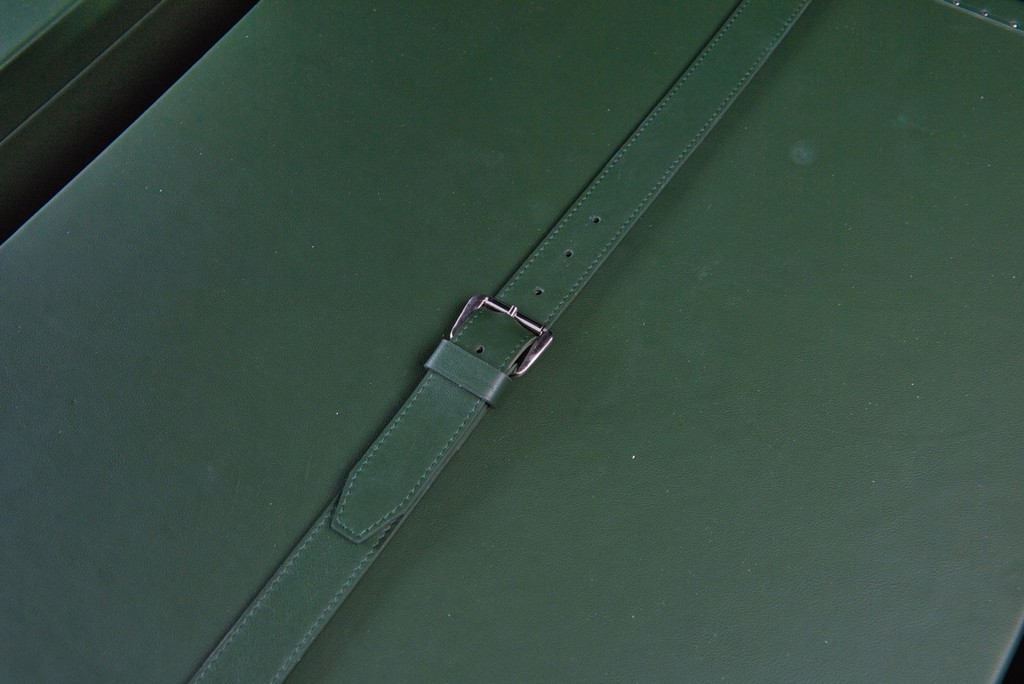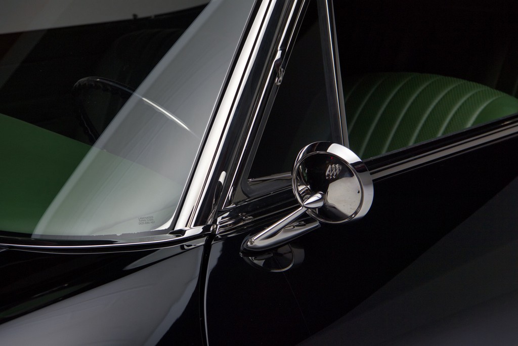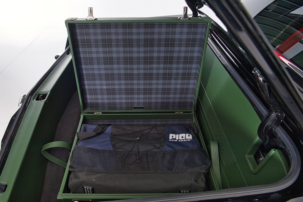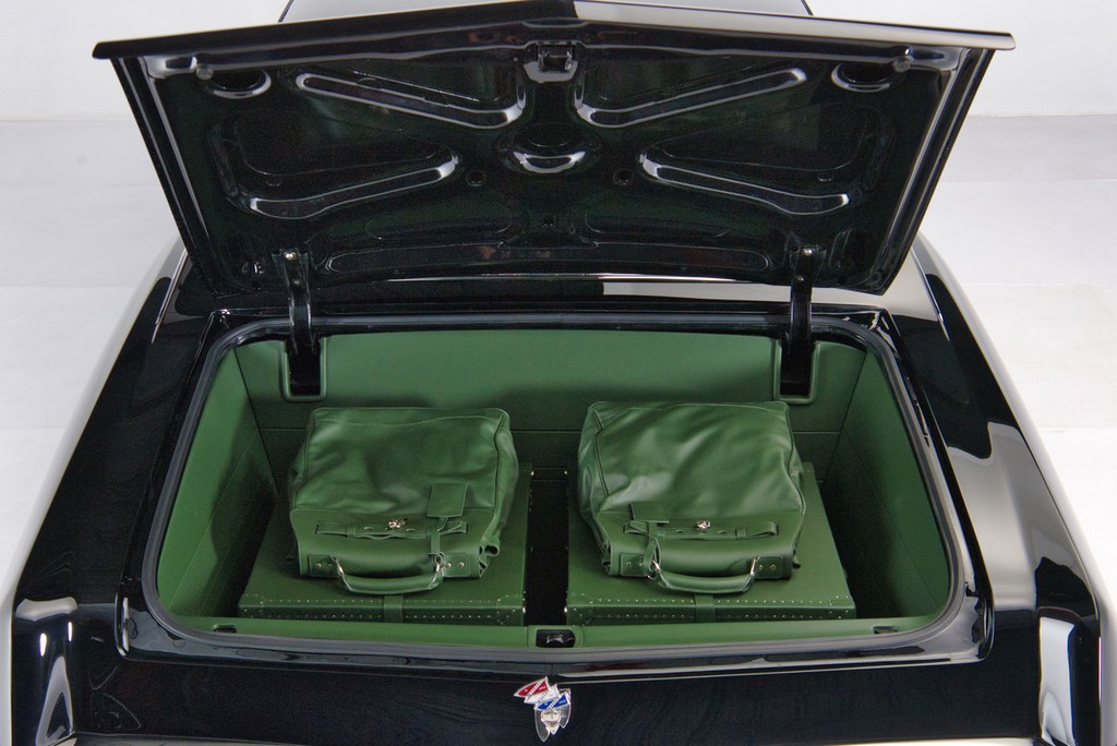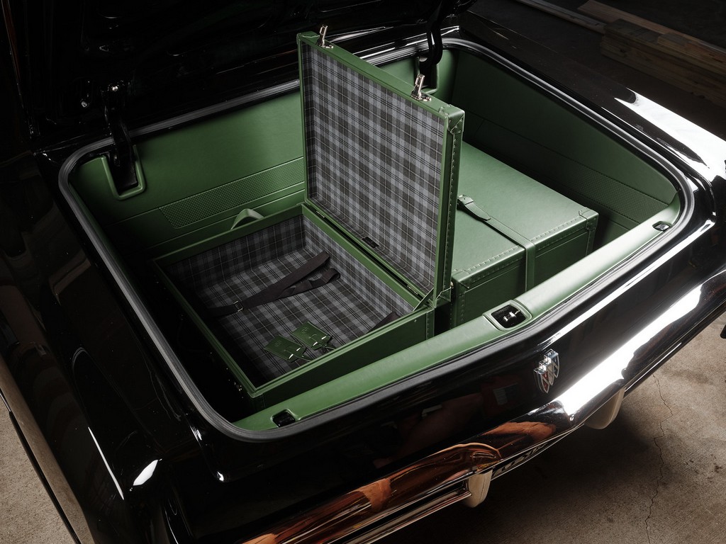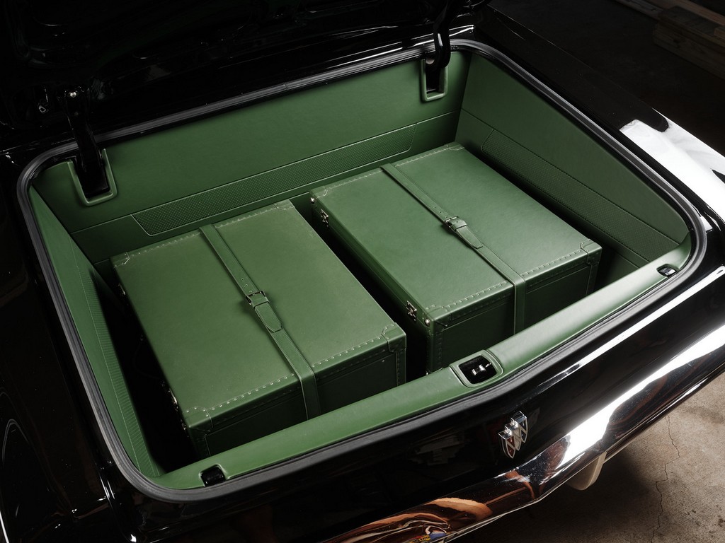 The trunk compartment is fully upholstered in matching green leather and includes a four-piece custom luggage set by Laurent Nay of Broût-Vernet, France, inspired by the Mercedes-Benz 300SL, adding a bespoke finishing touch.