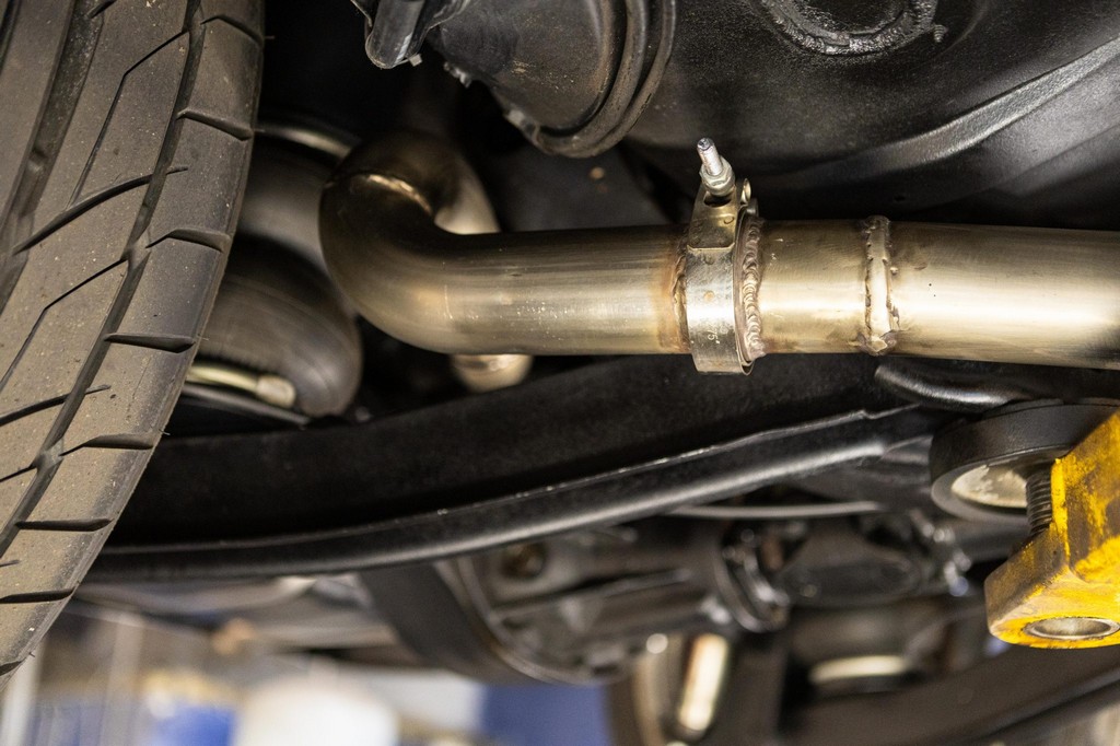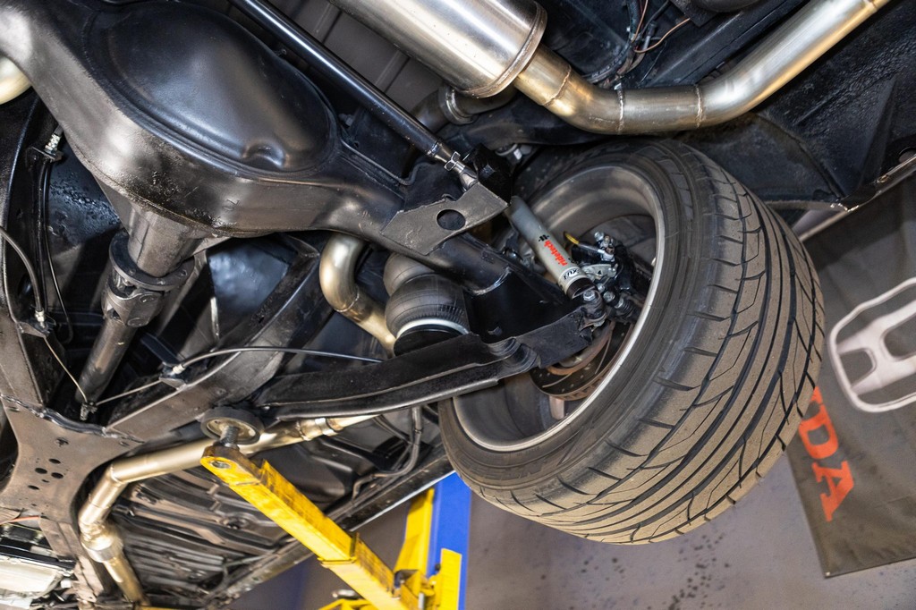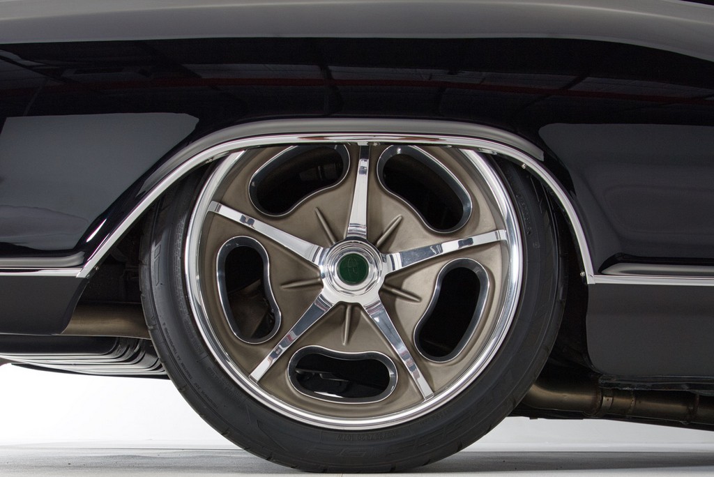 The car sits on staggered Schott Cover-Loc “Accelerator” billet wheels—18″ in front and 20″ at the rear—finished in titanium with polished accents and wrapped in Nitto NT555 G2 performance tires (245/40 front, 305/35 rear).