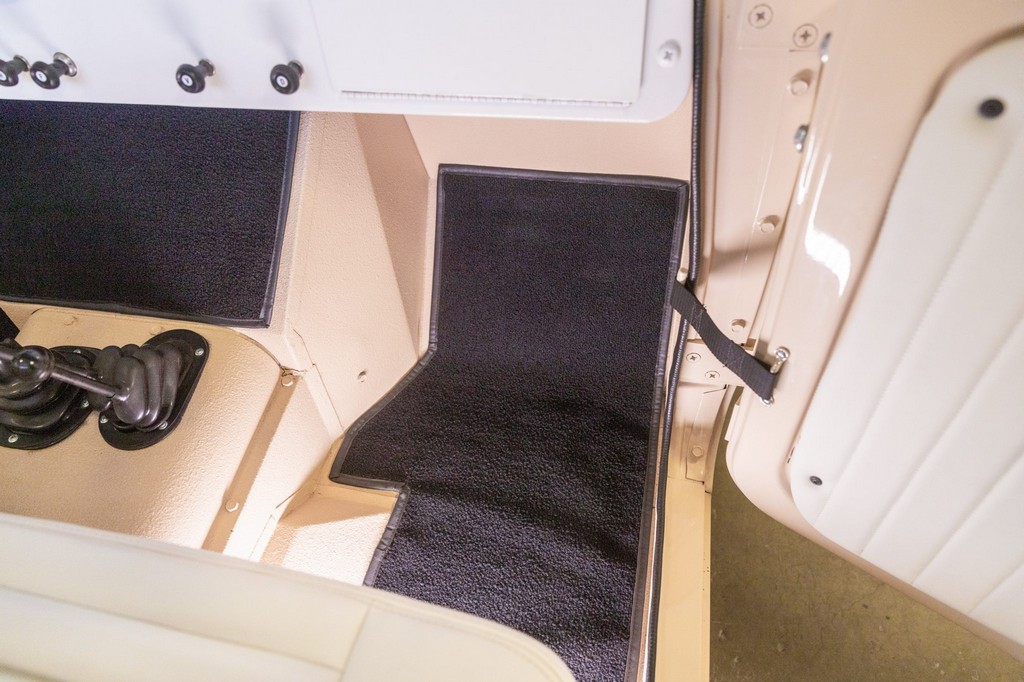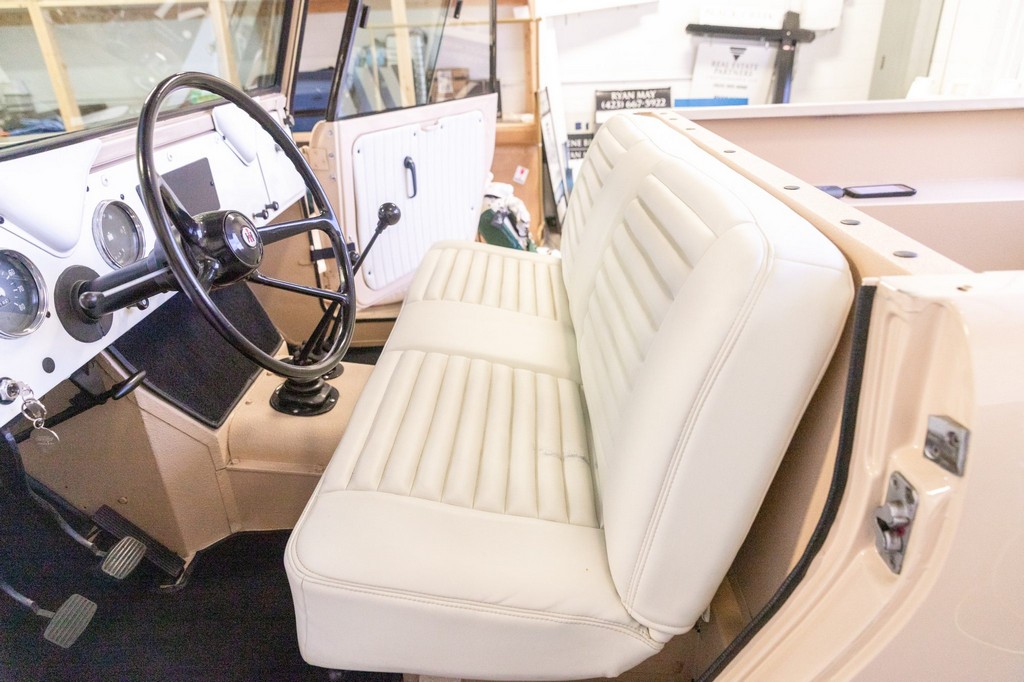 Interior: Refurbished with fresh white vinyl upholstery and durable bedliner flooring