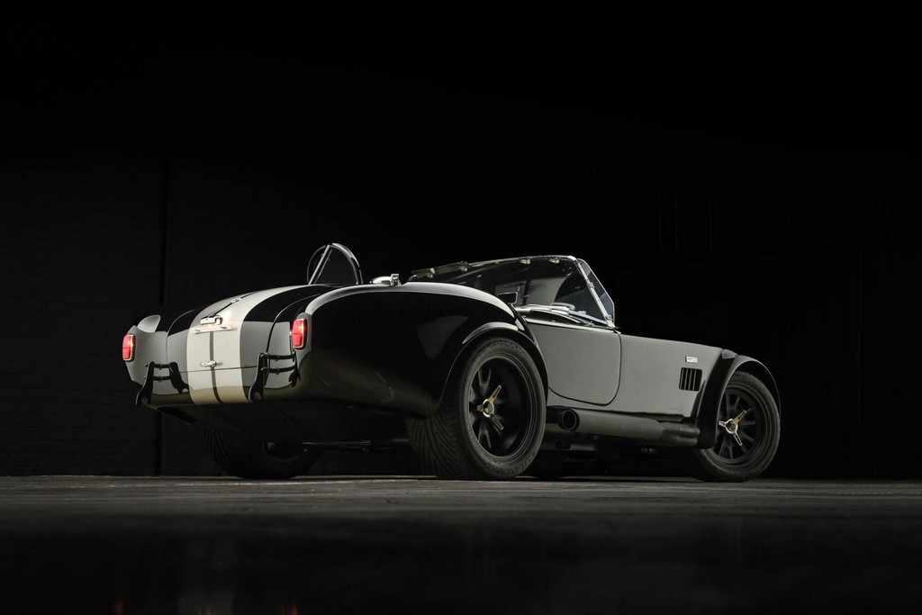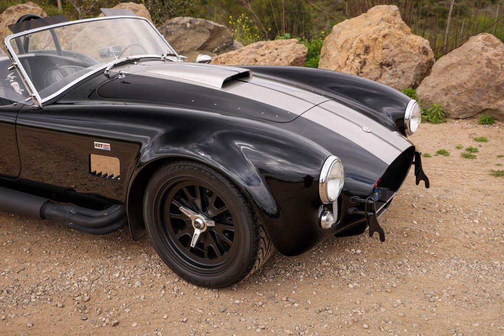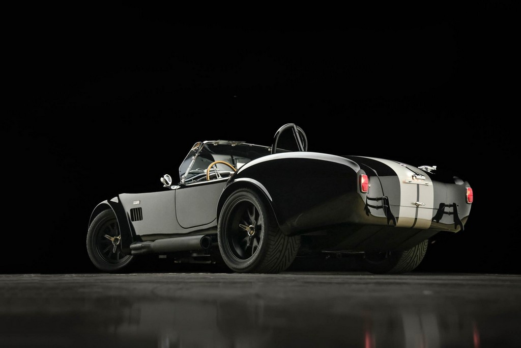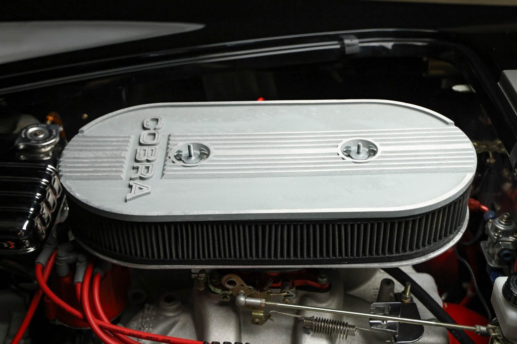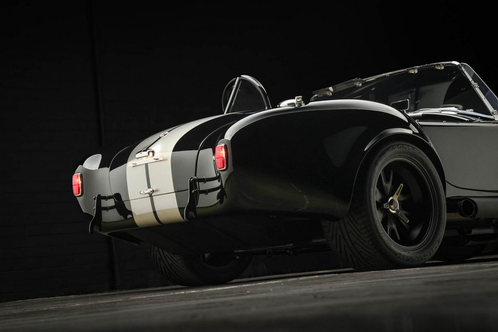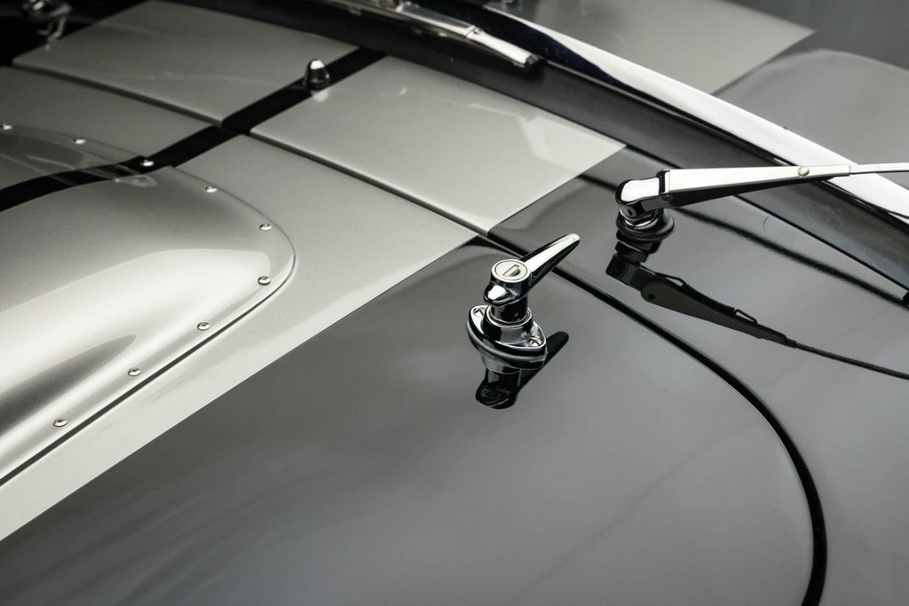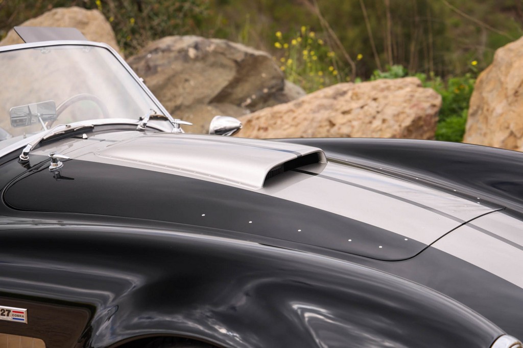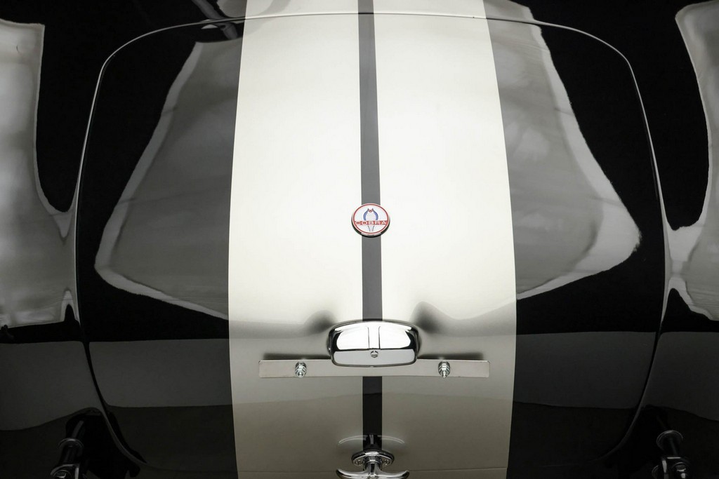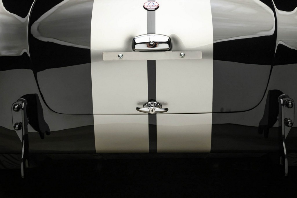 The body is finished in a deep gloss black with bold twin Titanium racing stripes, giving the car a menacing and timeless stance. Built in the 289 FIA style, the fiberglass body features: