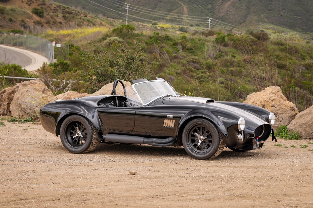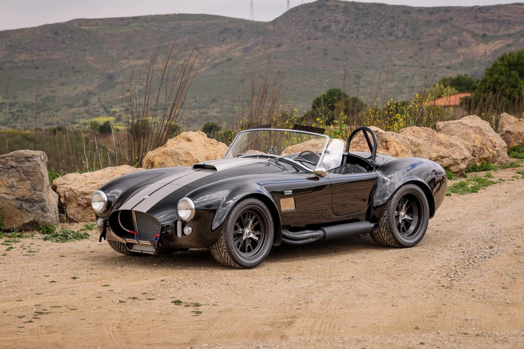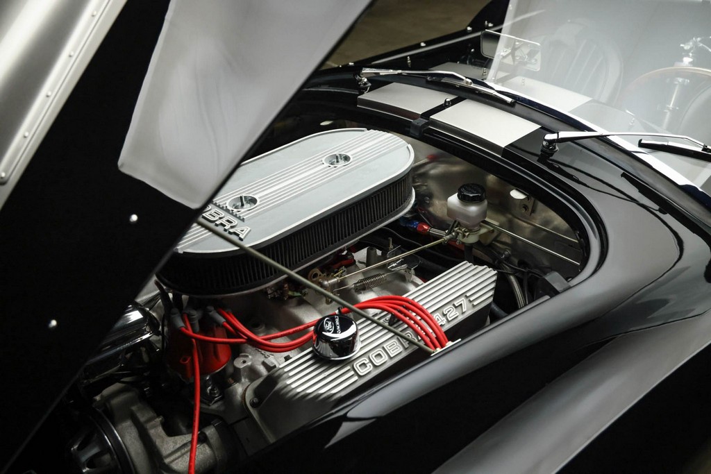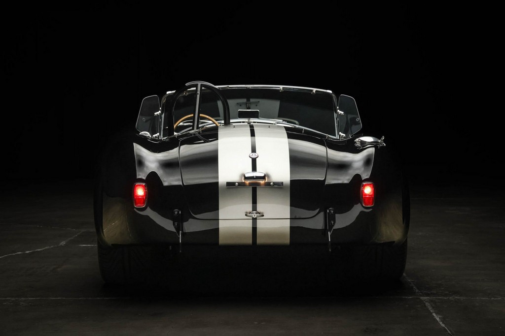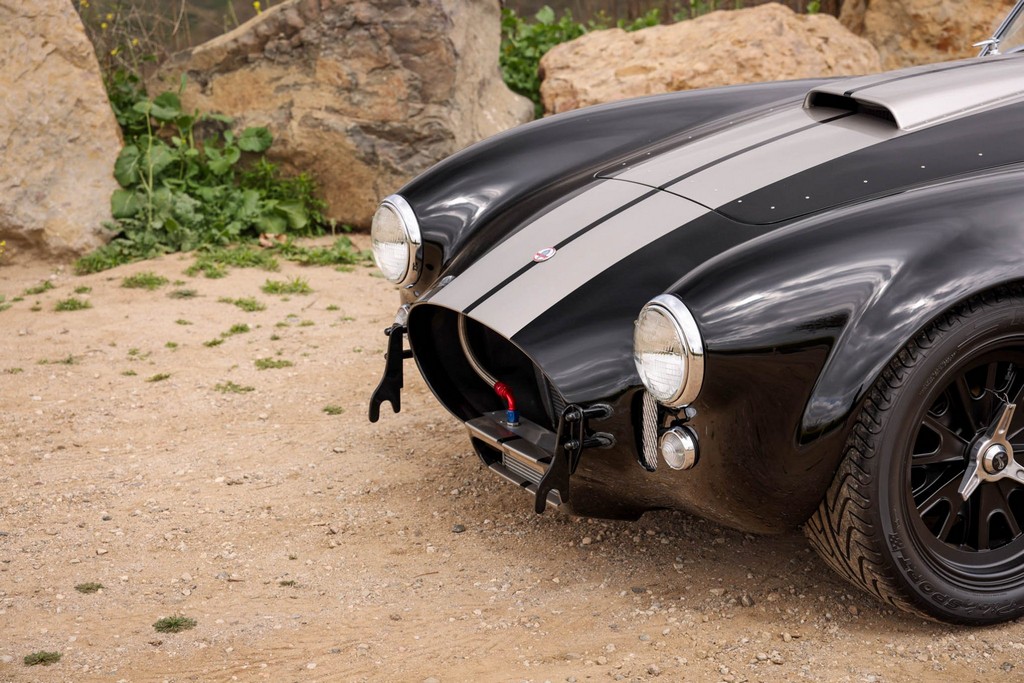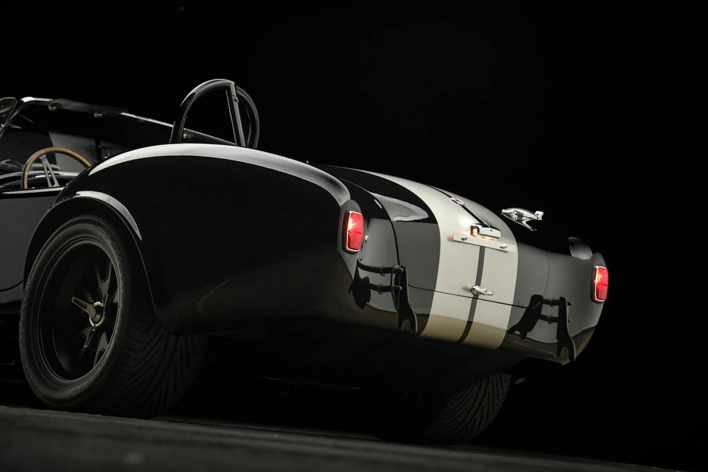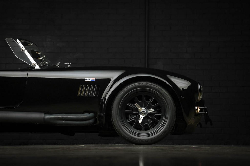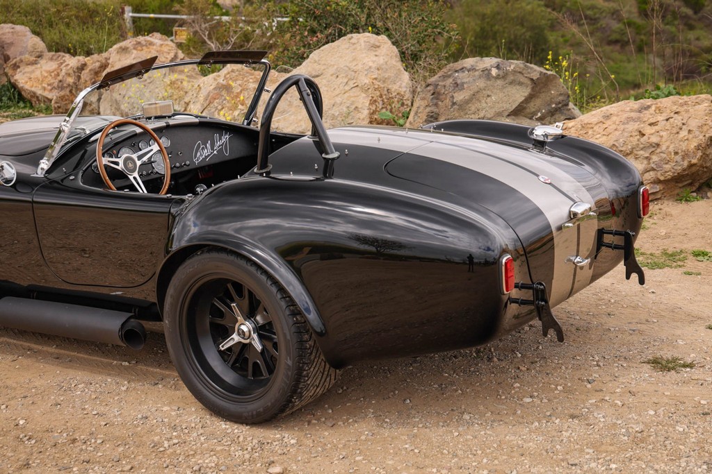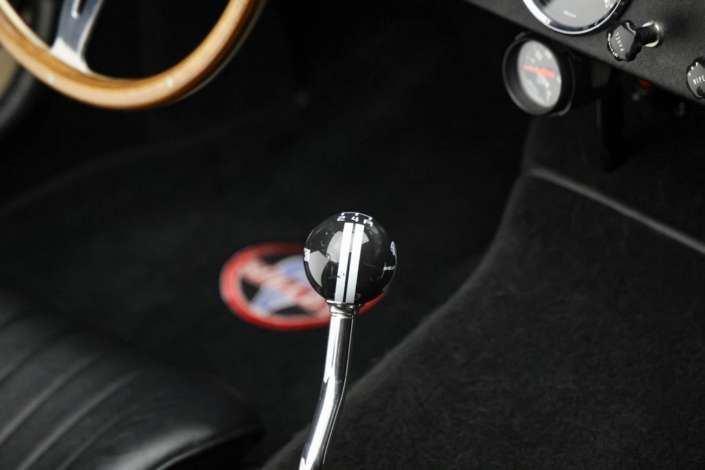 The body is finished in a deep gloss black with bold twin Titanium racing stripes, giving the car a menacing and timeless stance. Built in the 289 FIA style, the fiberglass body features: