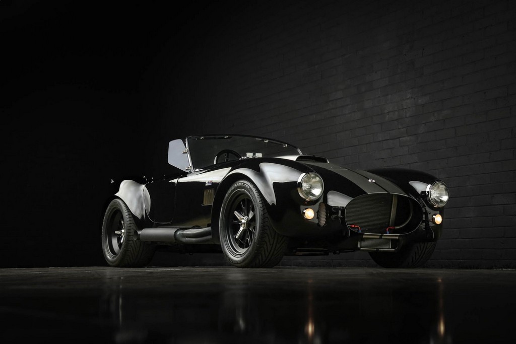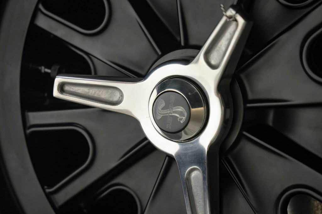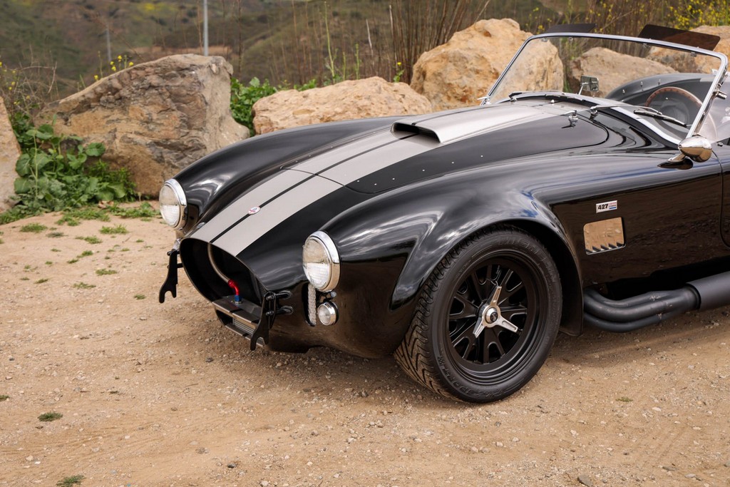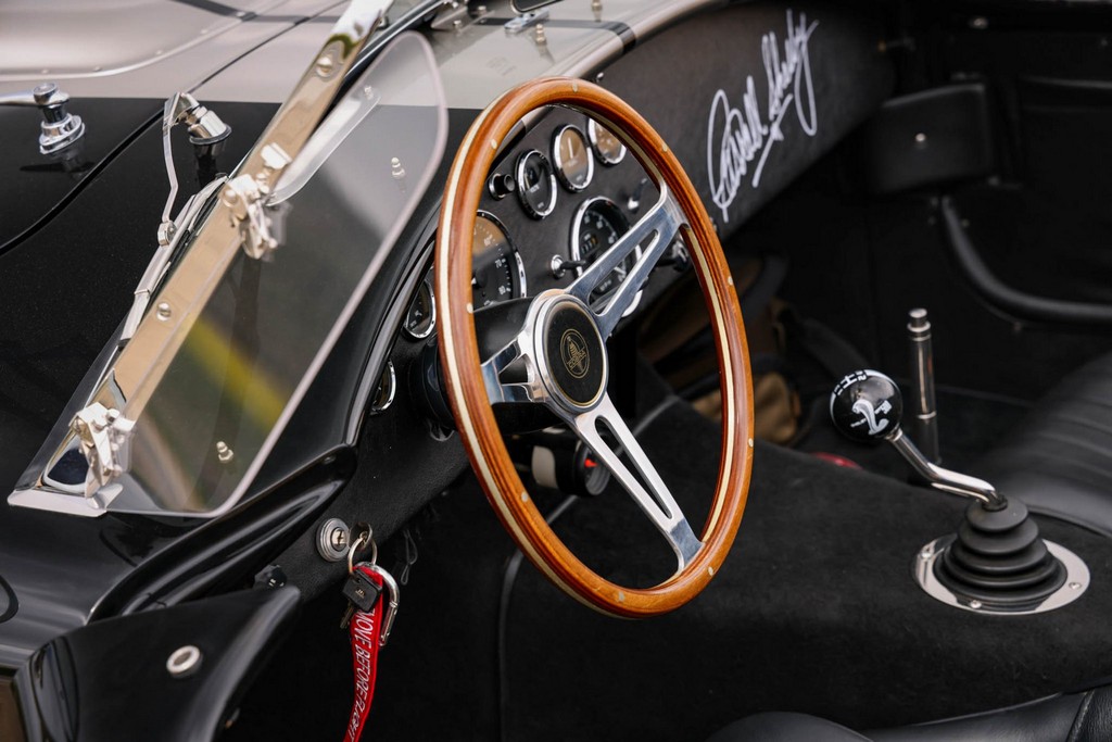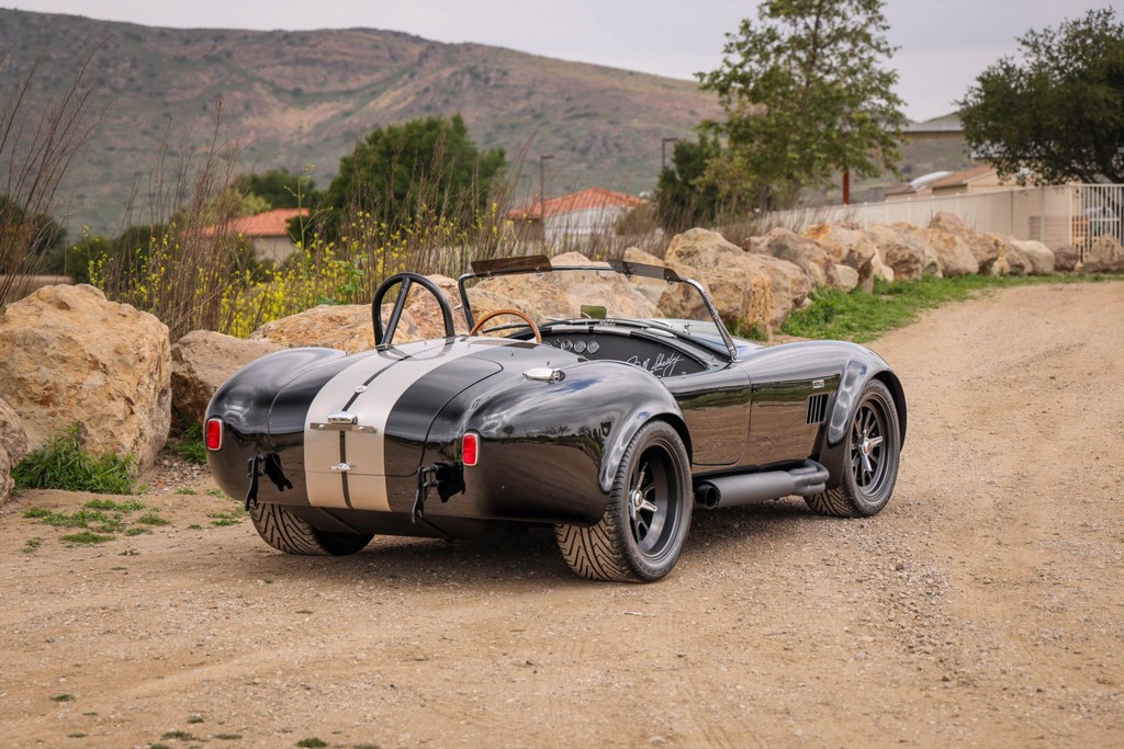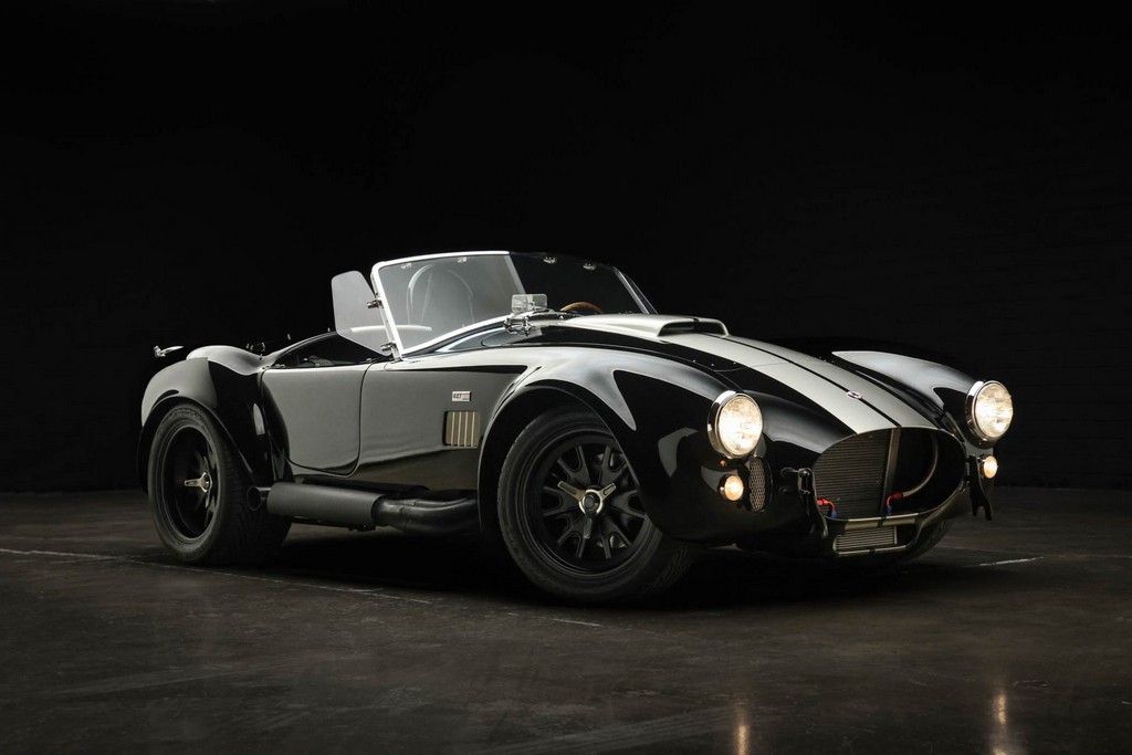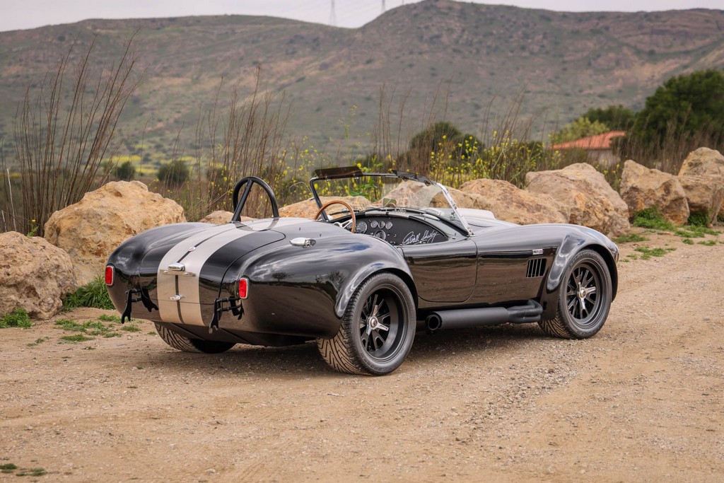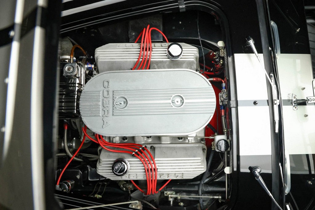The body is finished in a deep gloss black with bold twin Titanium racing stripes, giving the car a menacing and timeless stance. Built in the 289 FIA style, the fiberglass body features: