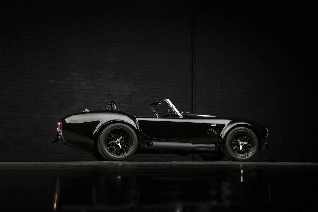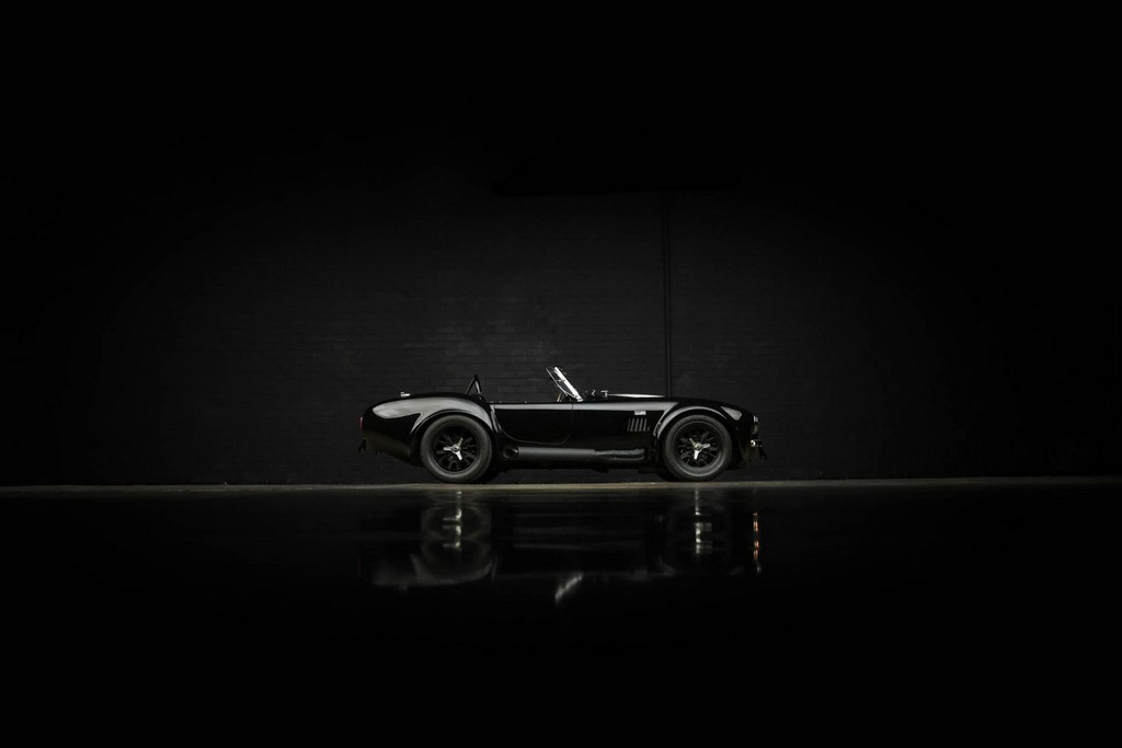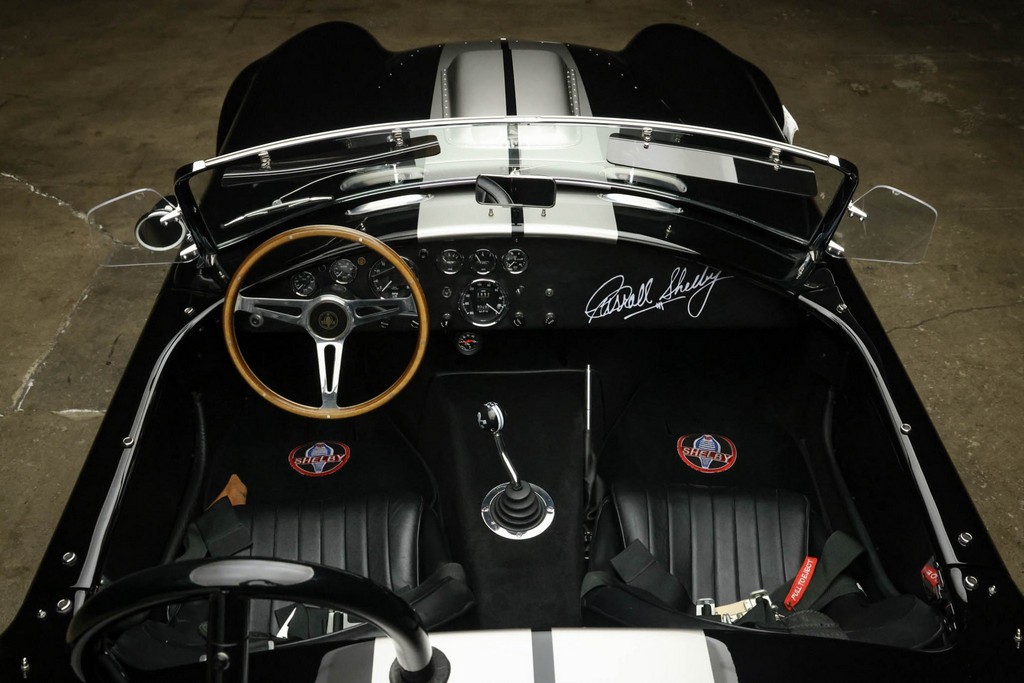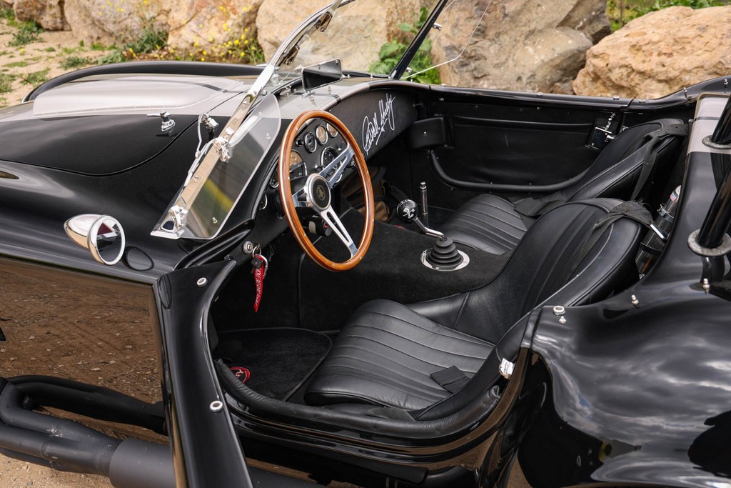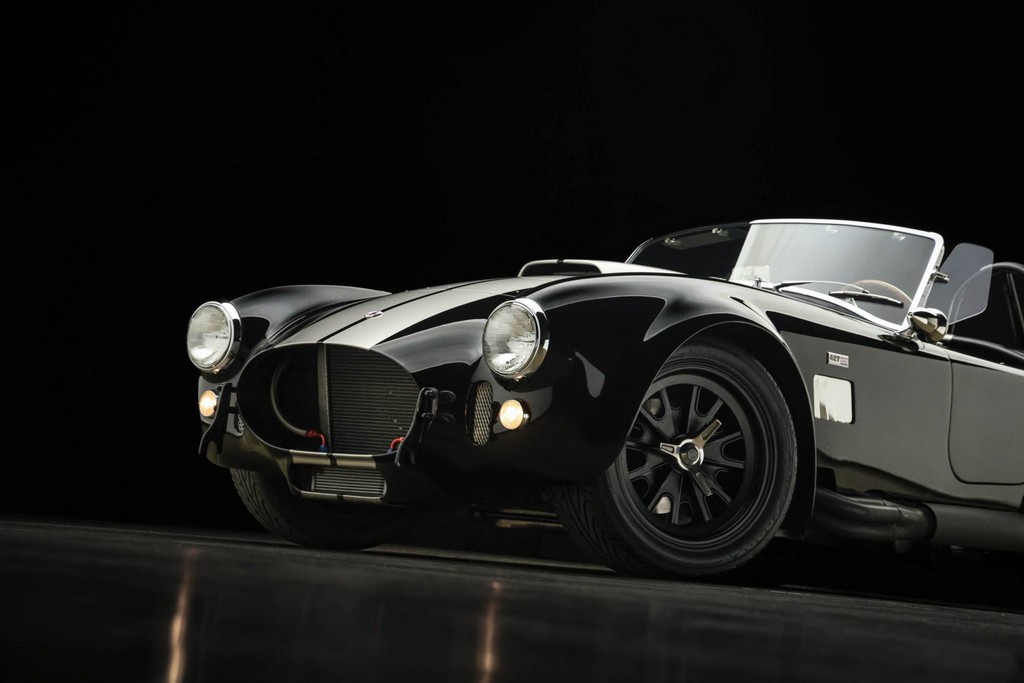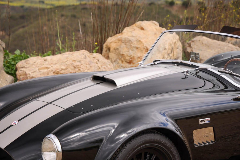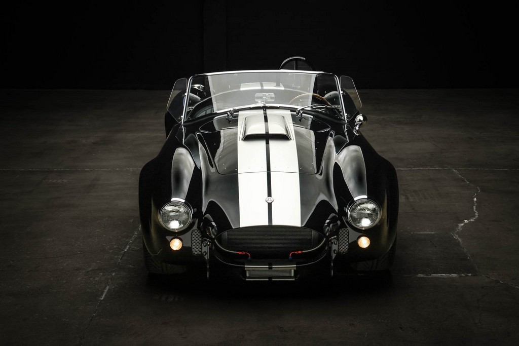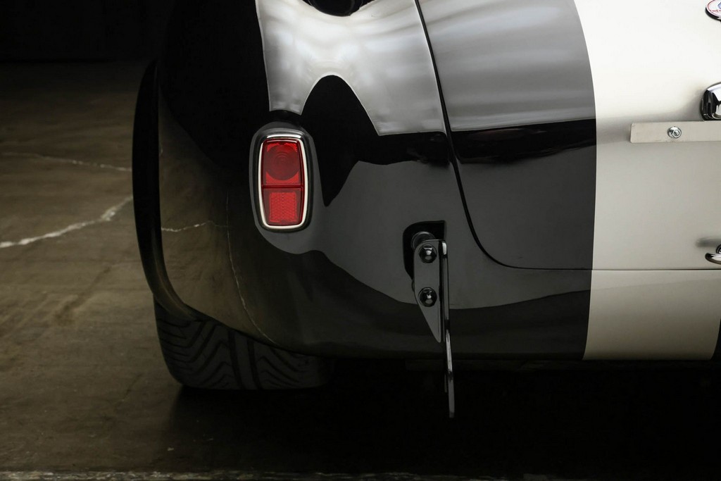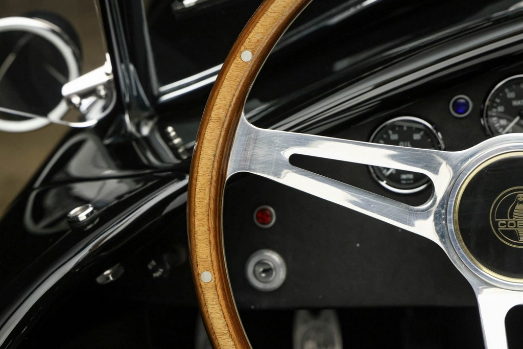 The body is finished in a deep gloss black with bold twin Titanium racing stripes, giving the car a menacing and timeless stance. Built in the 289 FIA style, the fiberglass body features: