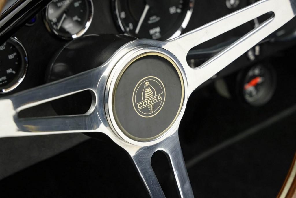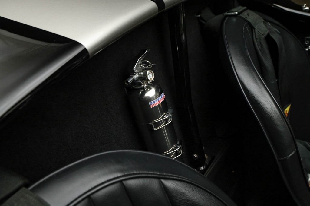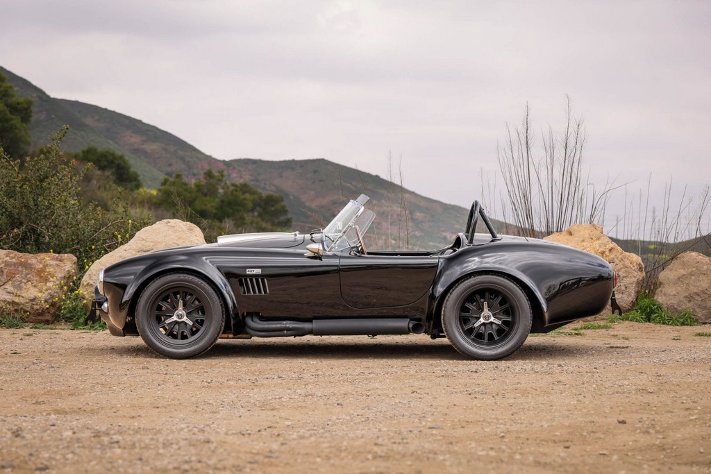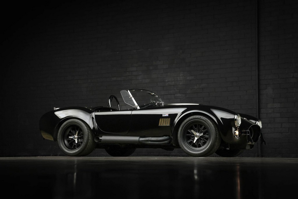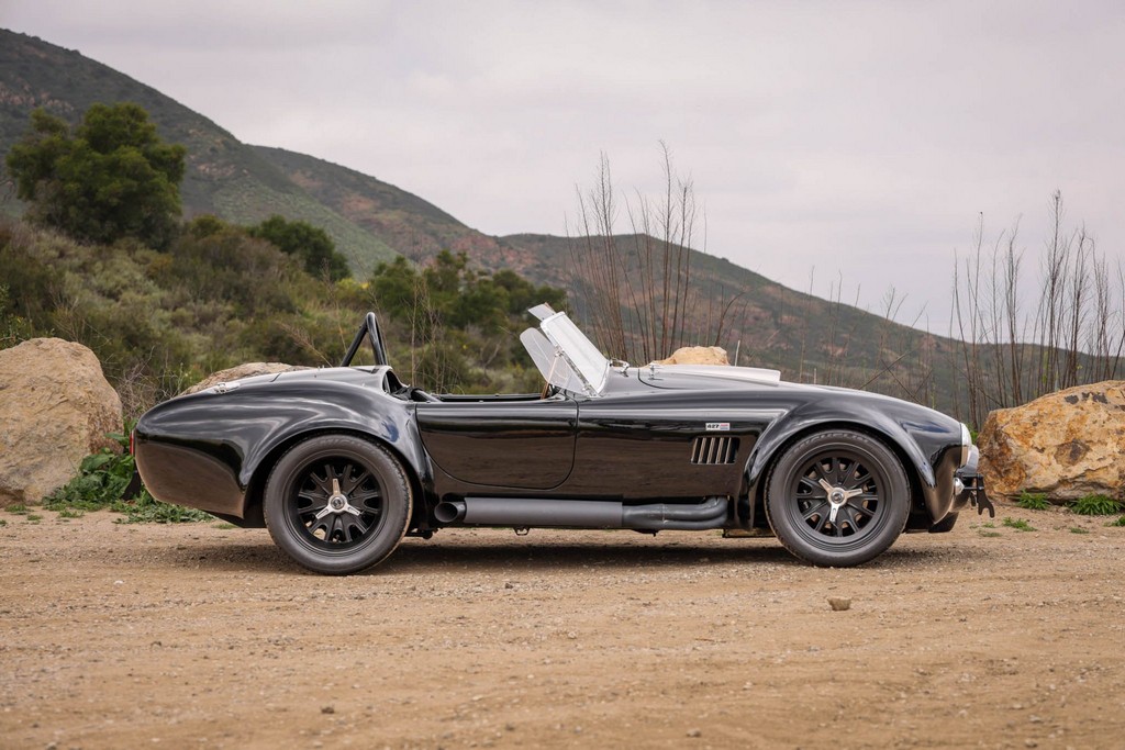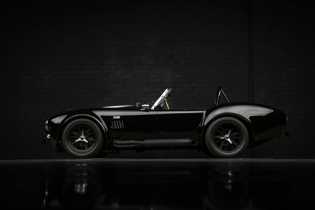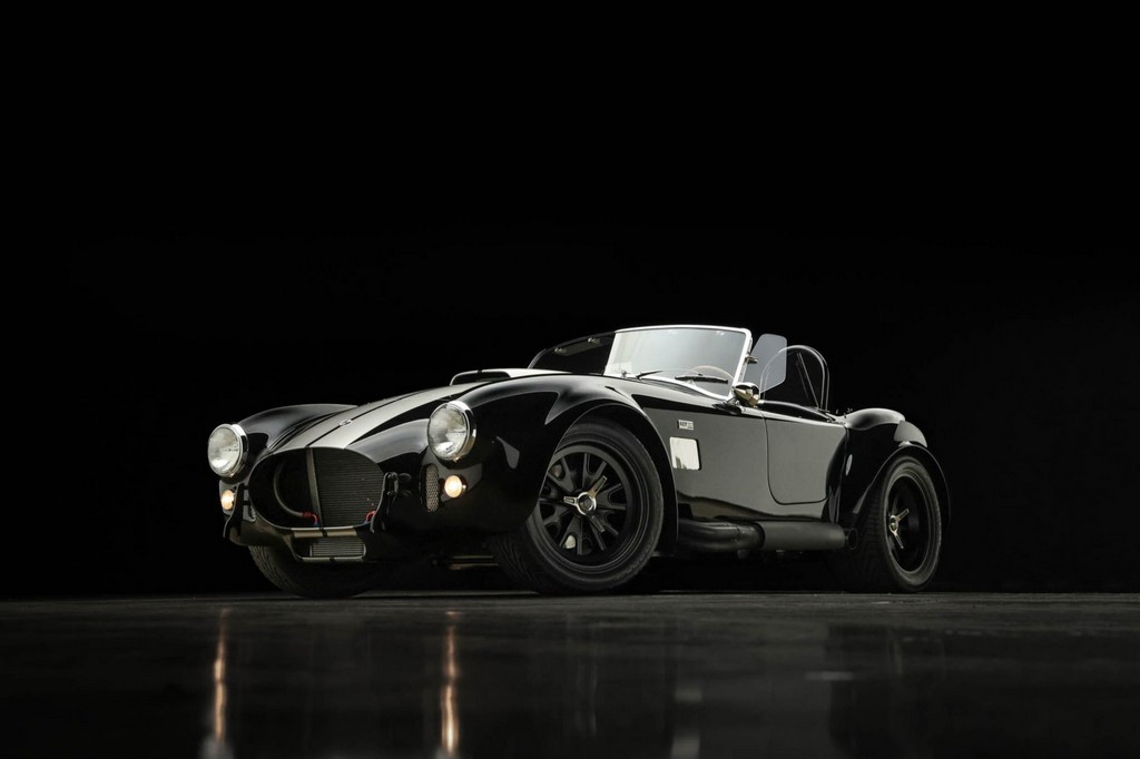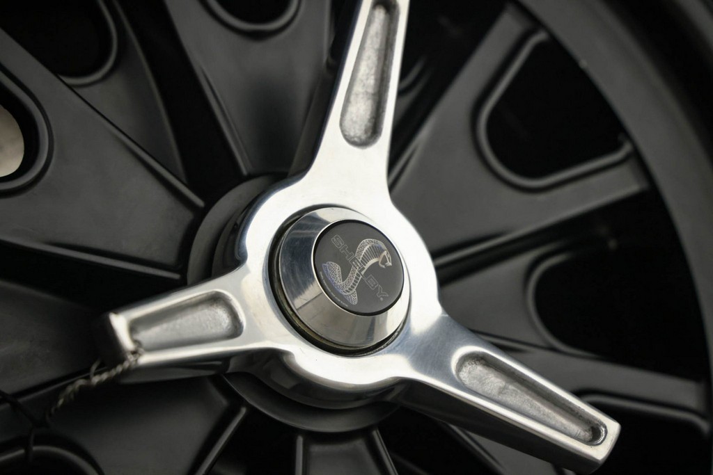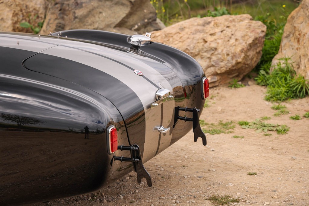 The body is finished in a deep gloss black with bold twin Titanium racing stripes, giving the car a menacing and timeless stance. Built in the 289 FIA style, the fiberglass body features: