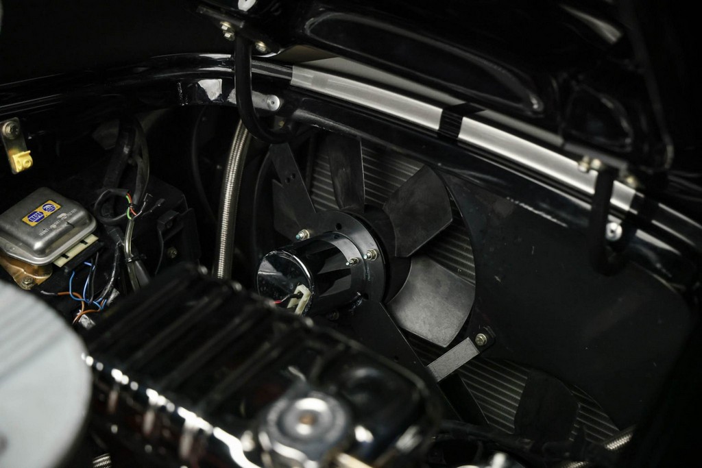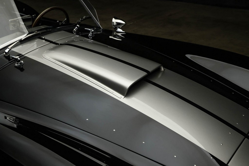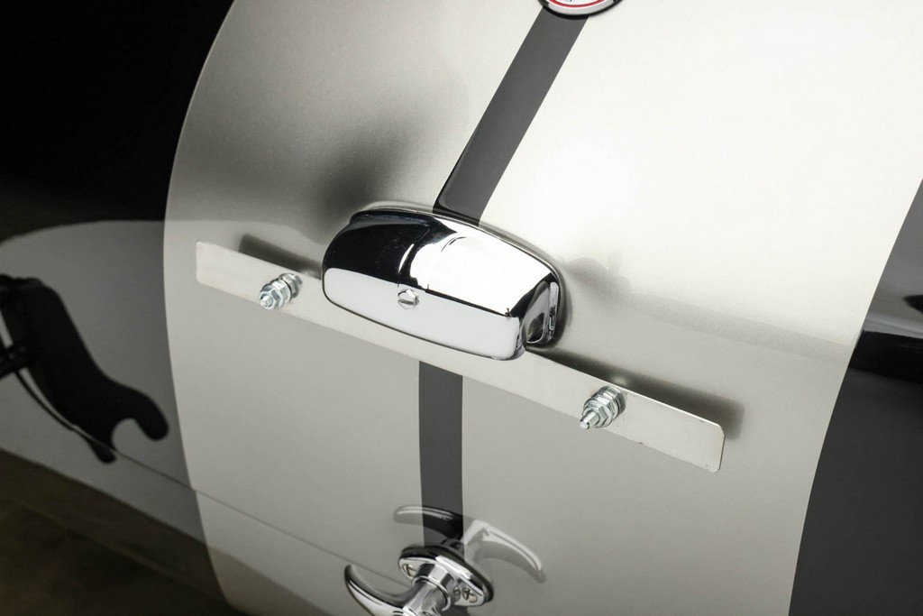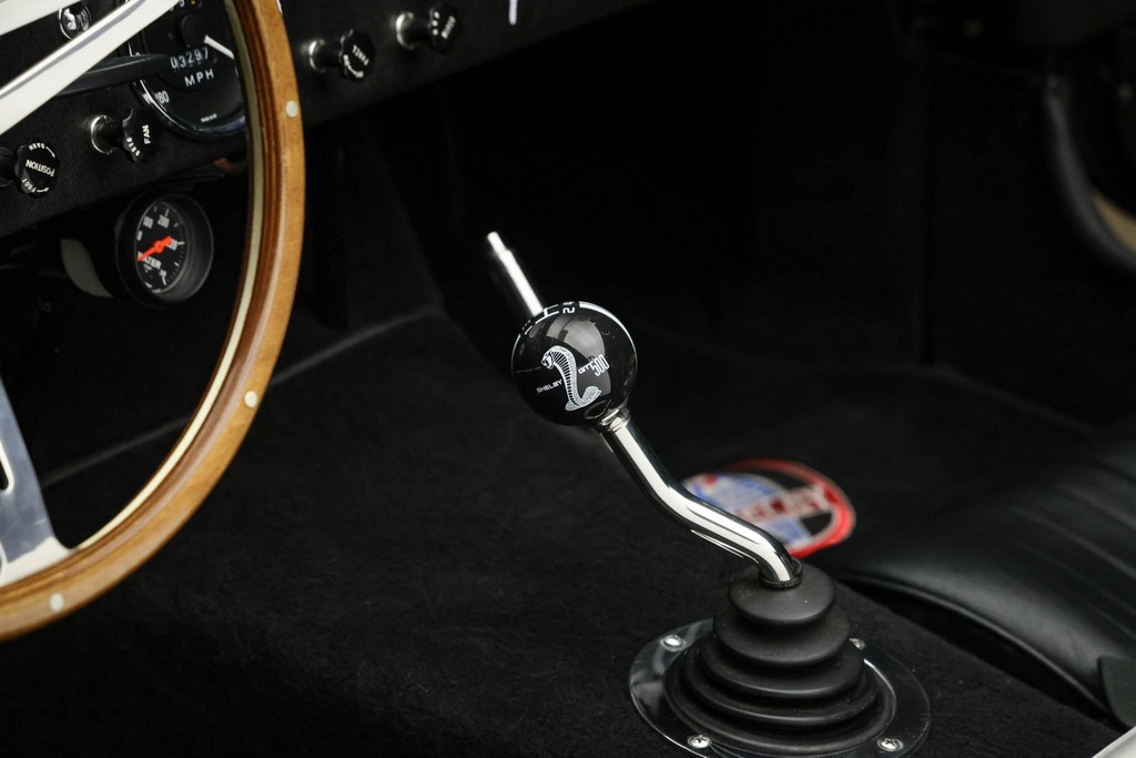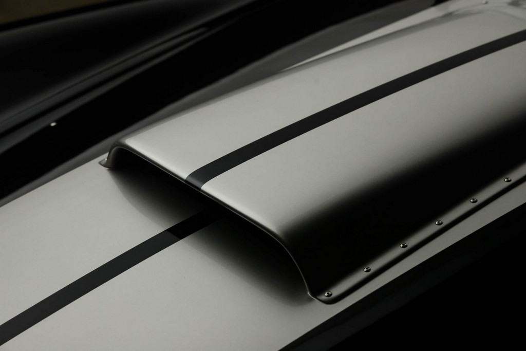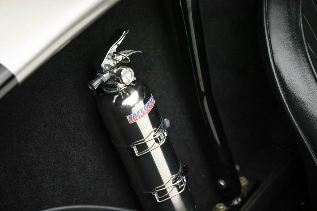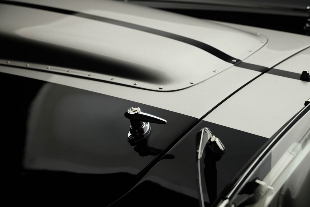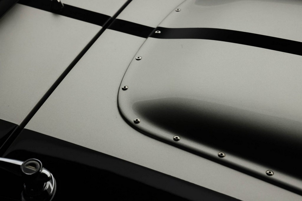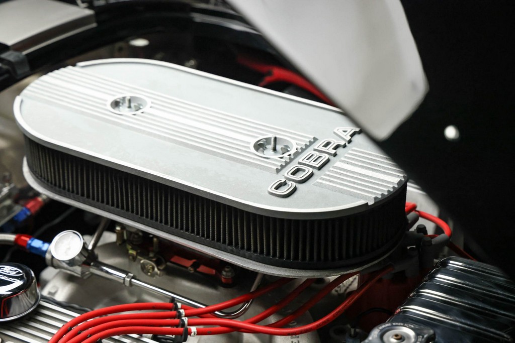 The body is finished in a deep gloss black with bold twin Titanium racing stripes, giving the car a menacing and timeless stance. Built in the 289 FIA style, the fiberglass body features: