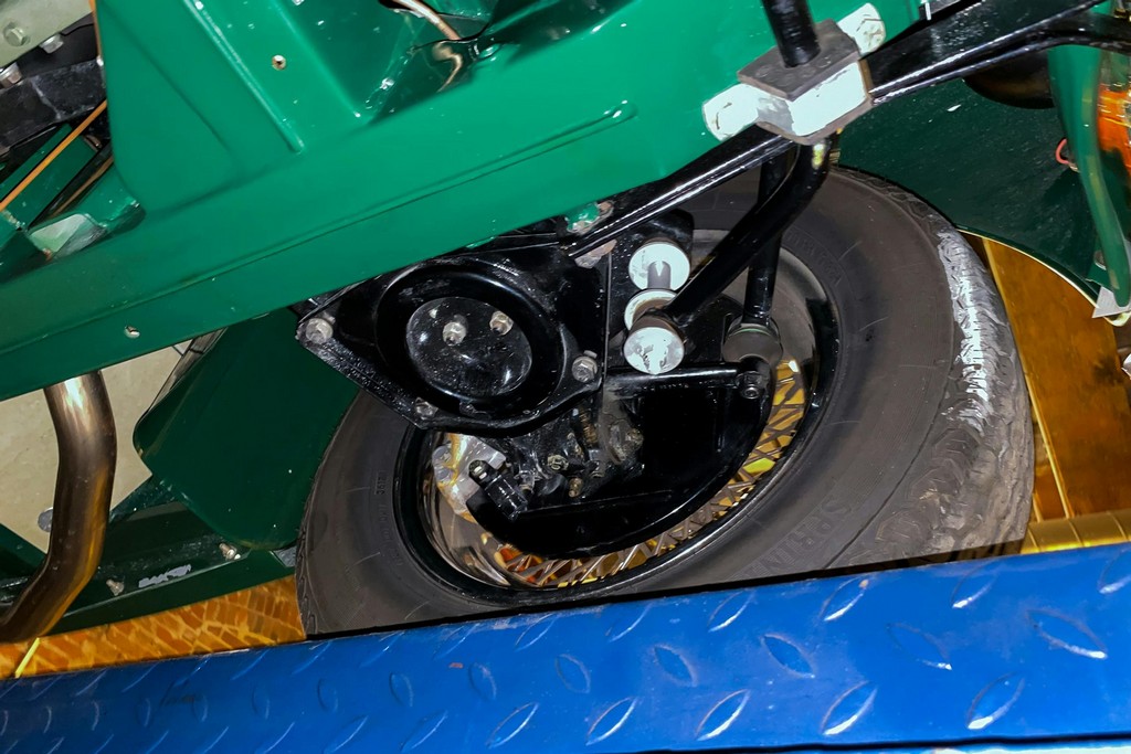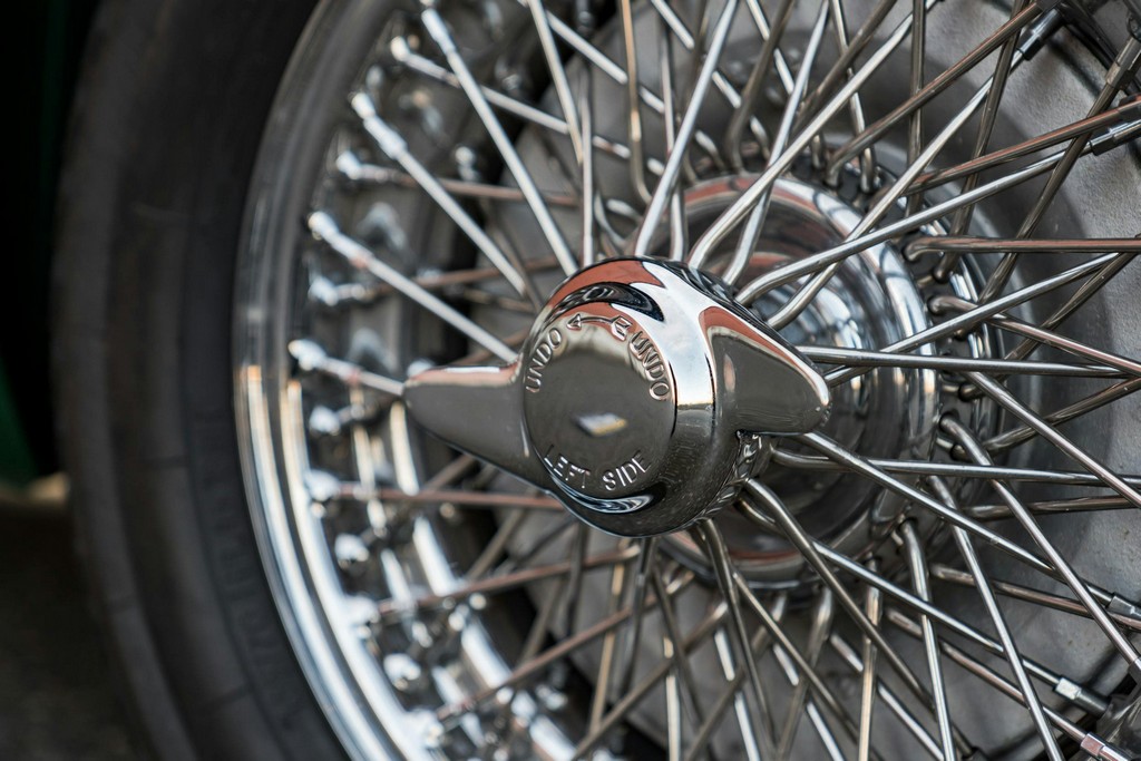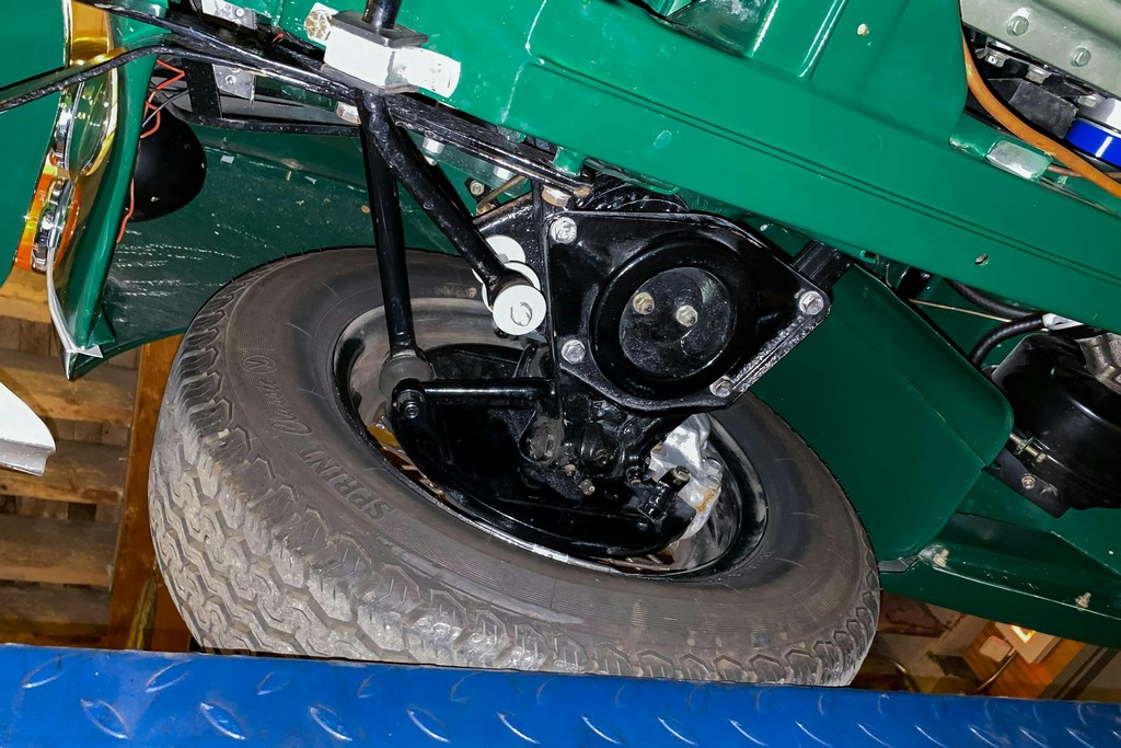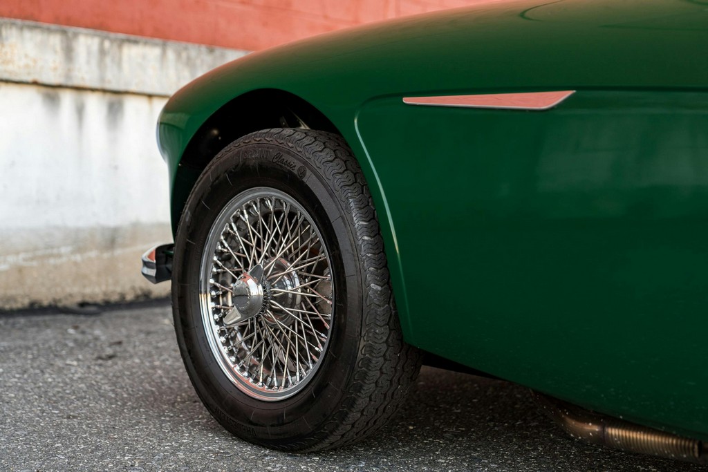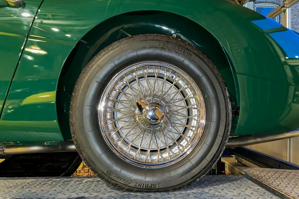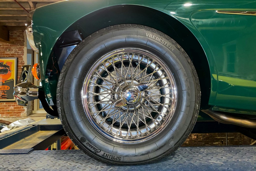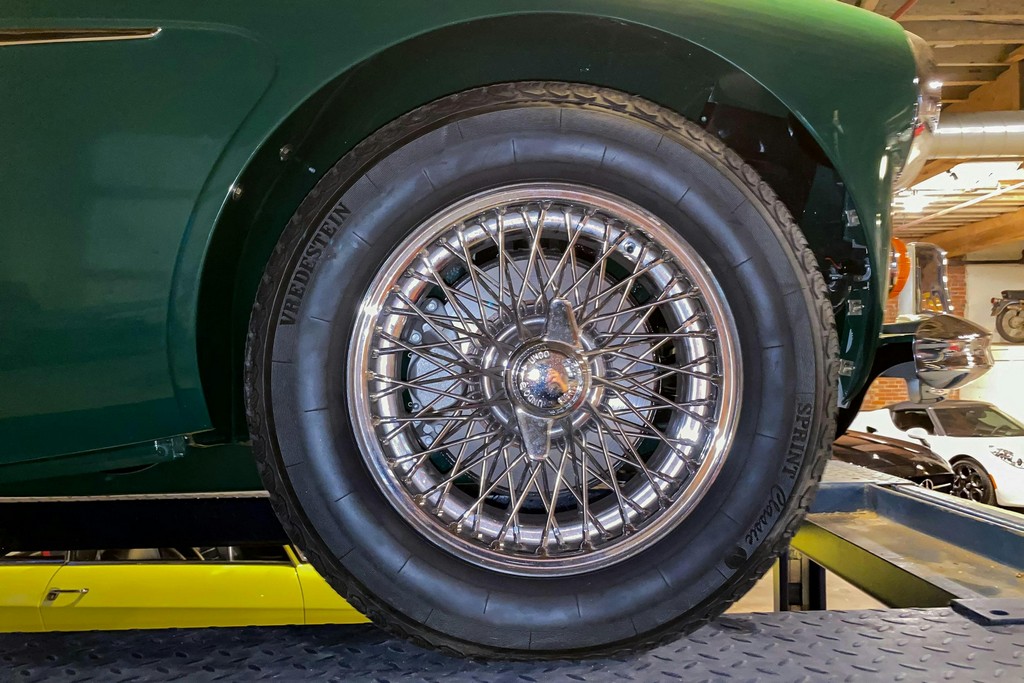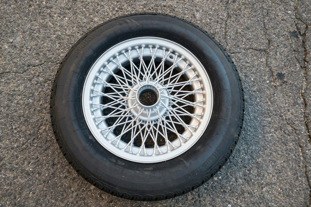 Newly installed and balanced wire wheels are wrapped in Vredestein 185/70HR15 tires, completing the classic stance.