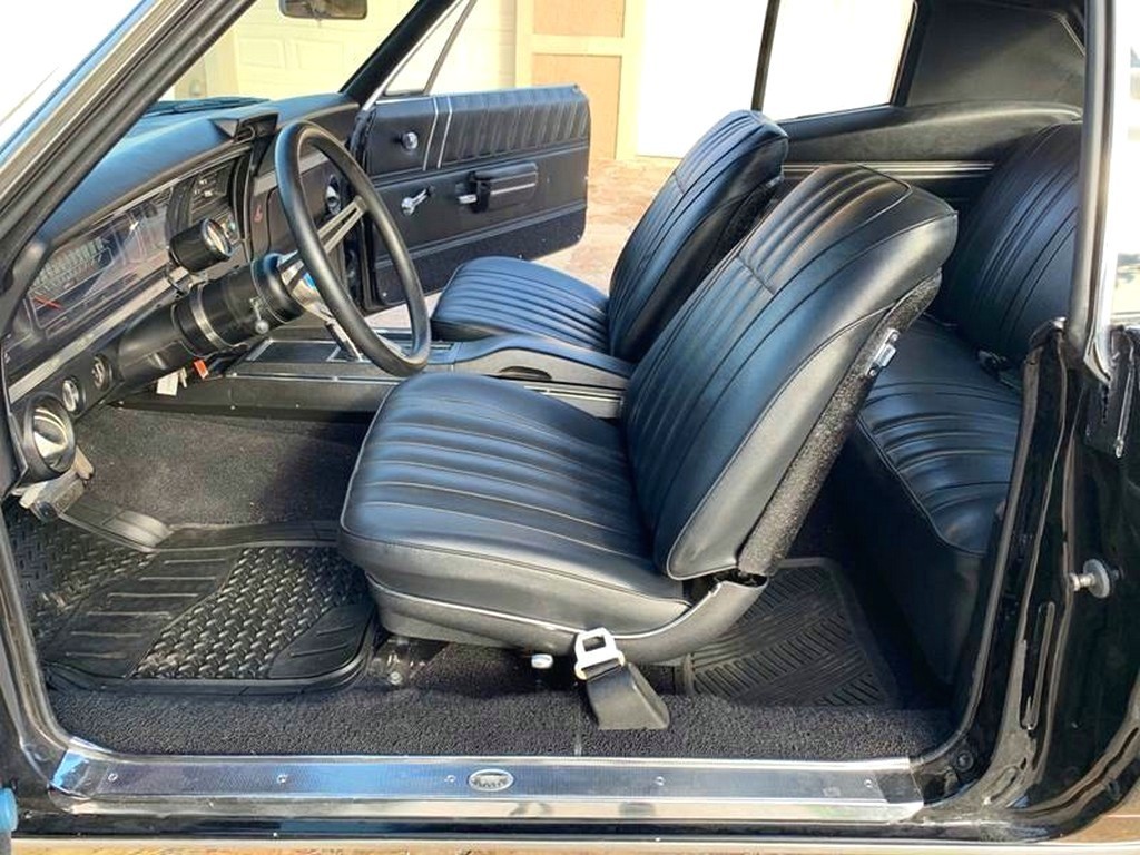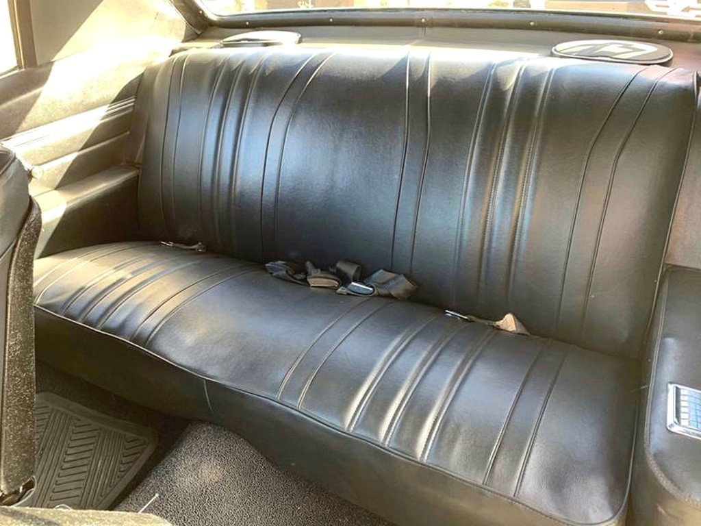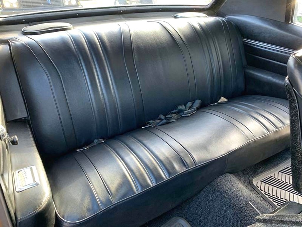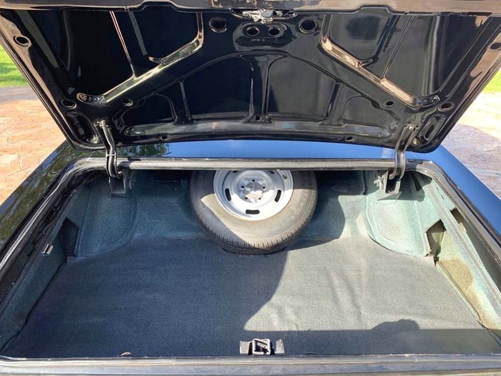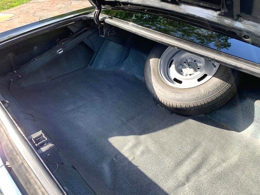 The body is solid throughout and presents beautifully in Tuxedo Black paint, complemented by excellent chrome and stainless trim. The car rides on 15″ Torque Thrust D wheels wrapped in BF Goodrich Radial T/A tires. Glass is in excellent condition, with a new front windshield and rear window installed during refurbishment.