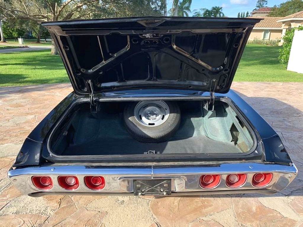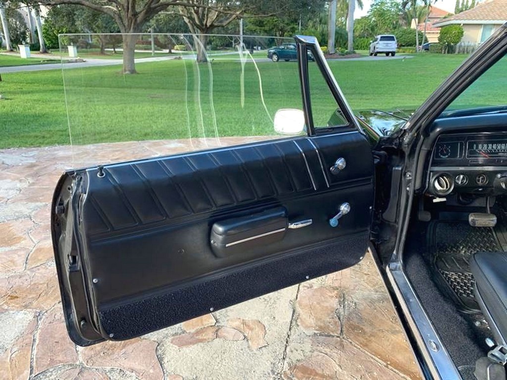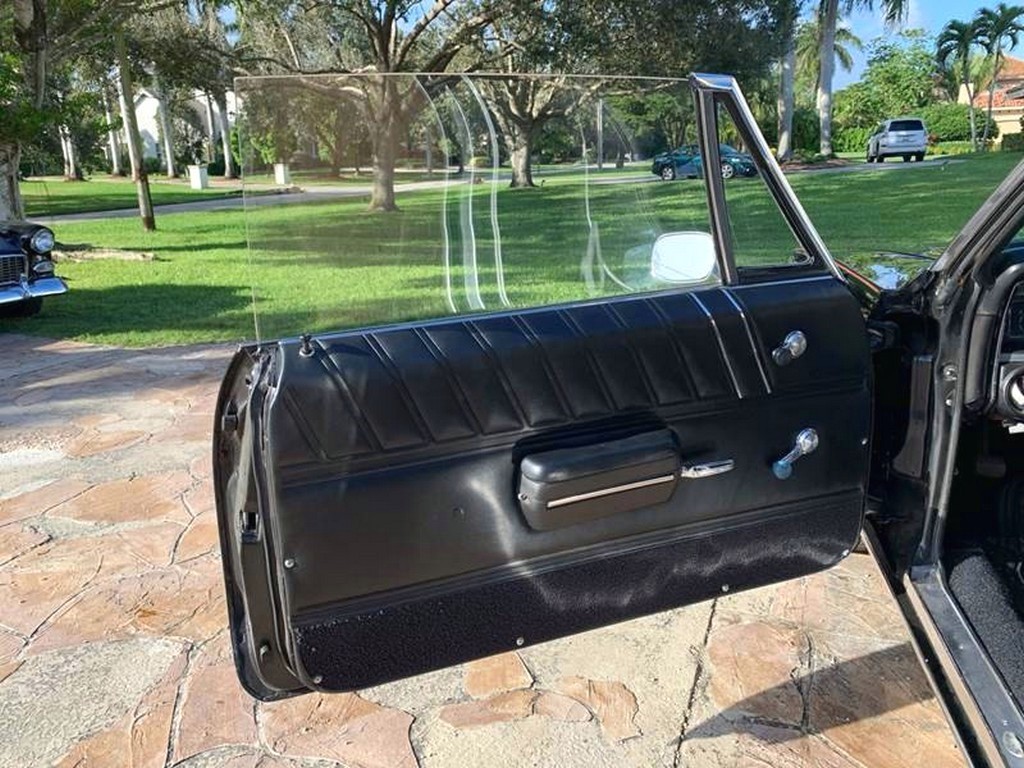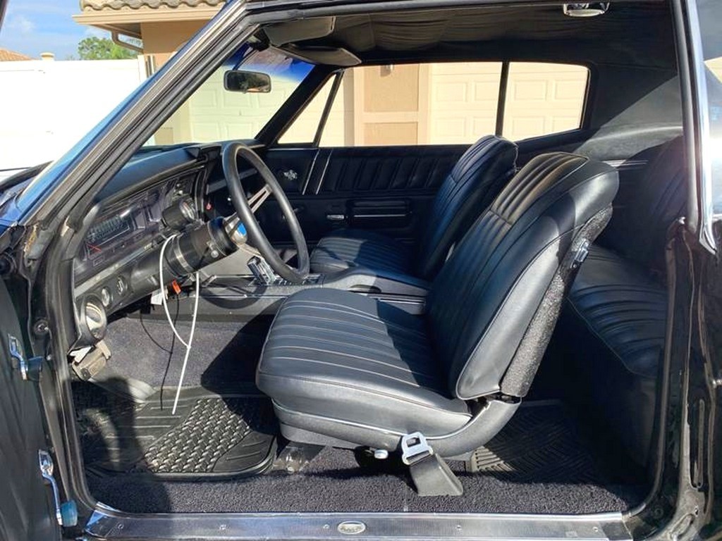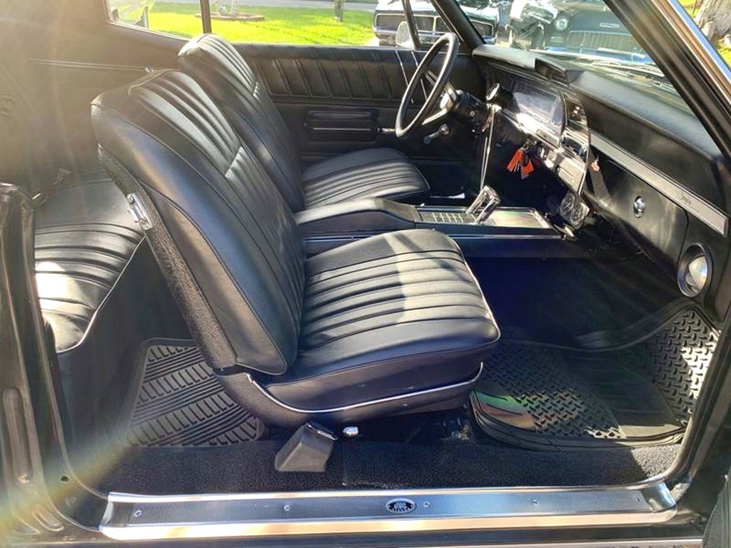 The body is solid throughout and presents beautifully in Tuxedo Black paint, complemented by excellent chrome and stainless trim. The car rides on 15″ Torque Thrust D wheels wrapped in BF Goodrich Radial T/A tires. Glass is in excellent condition, with a new front windshield and rear window installed during refurbishment.