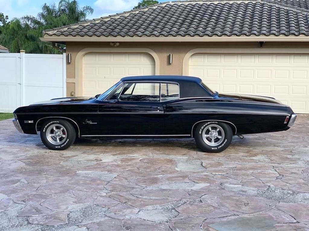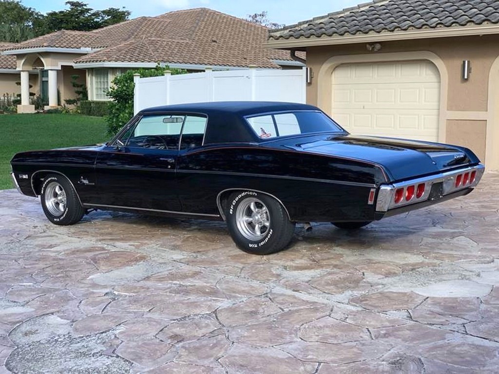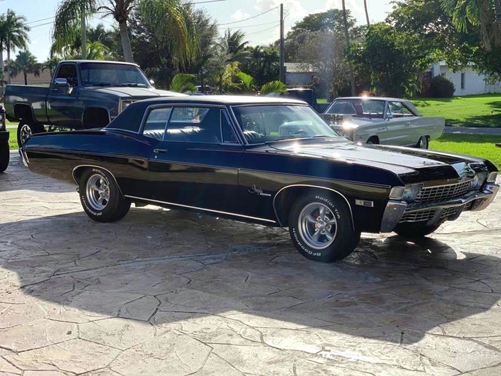 This 1968 Chevrolet Impala Custom Coupe is finished in Triple Tuxedo Black and powered by a G.M. aluminum-head 350ci V8 producing approximately 375 horsepower. The engine features a high-lift lopy camshaft, billet pushrods, and a 770 CFM Holley carburetor, producing an unmistakable muscle car sound. Power is delivered through an Overdrive Big Dog 700R automatic transmission for comfortable highway cruising.