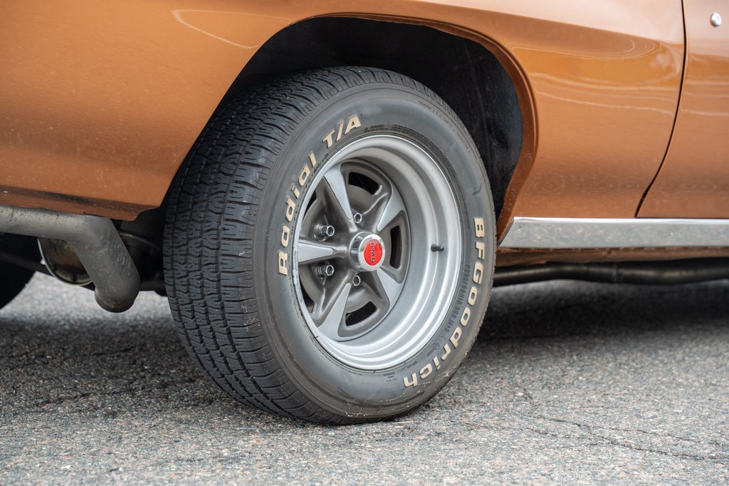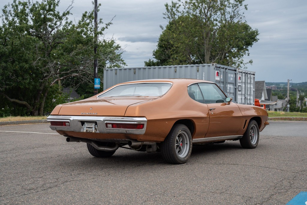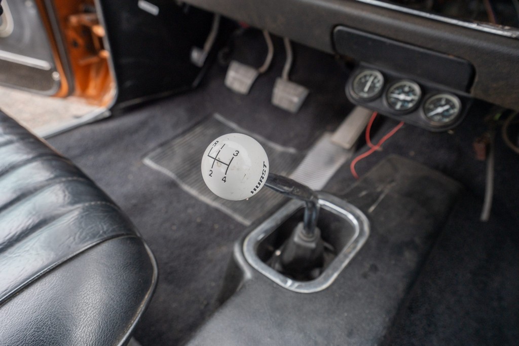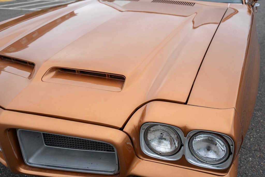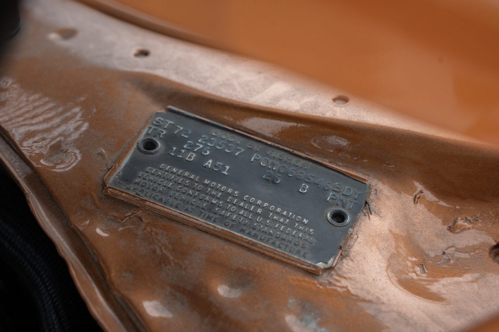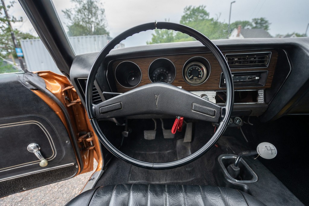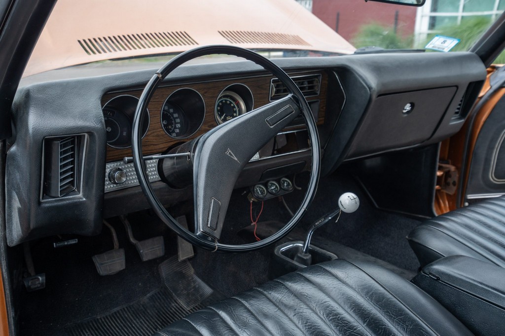 Power is delivered to the rear wheels through an overhauled Muncie four-speed manual transmission fitted with a Hurst shifter, providing a direct and engaging driving experience. The exterior was refinished in Anaconda Gold, complementing the car’s muscular lines and classic Pontiac styling.
