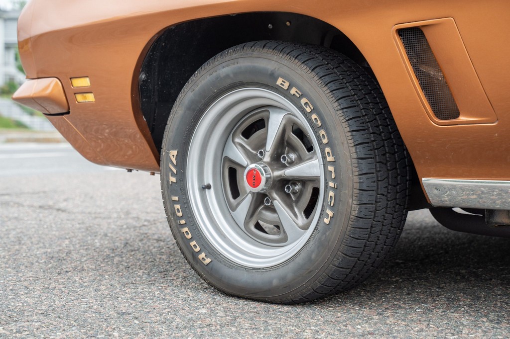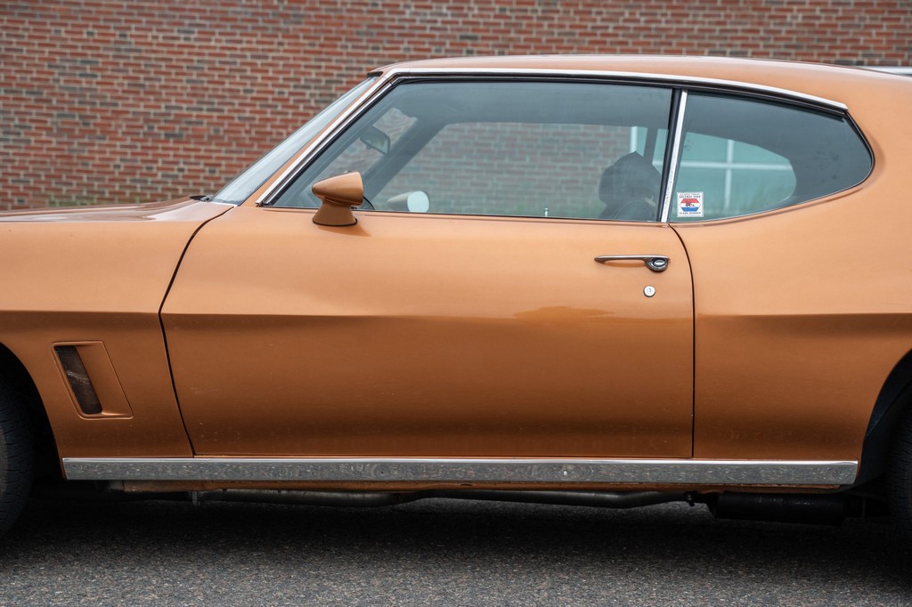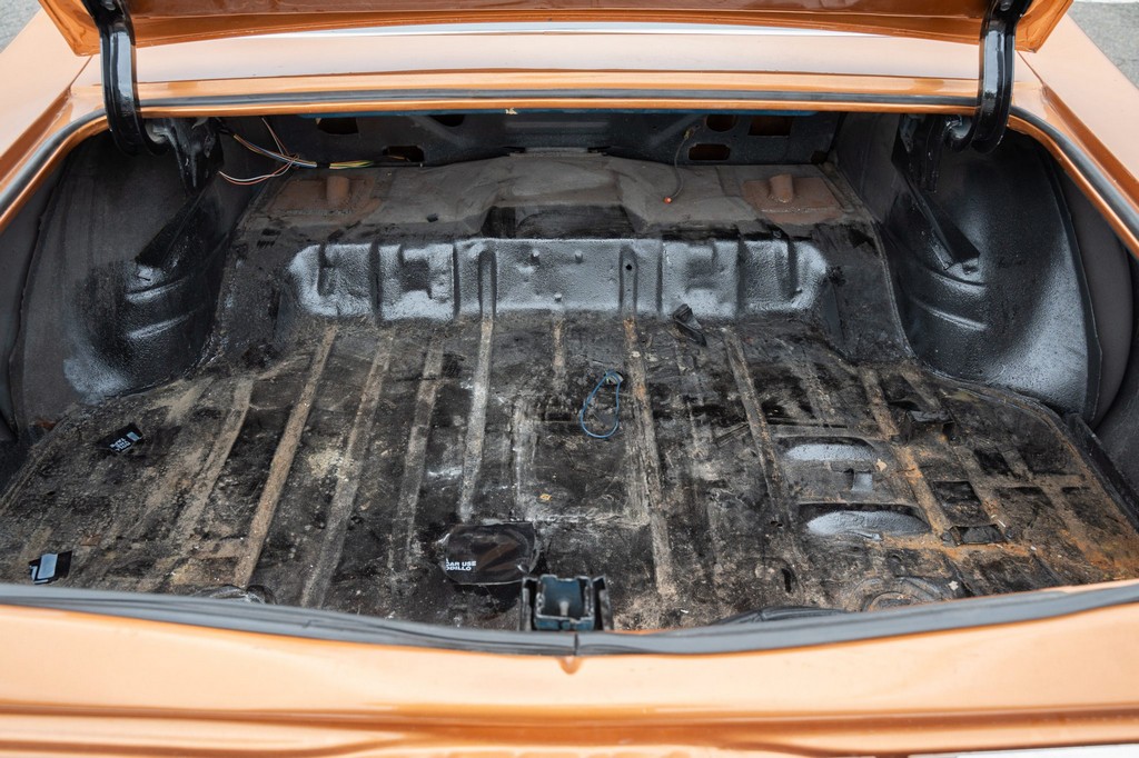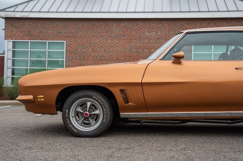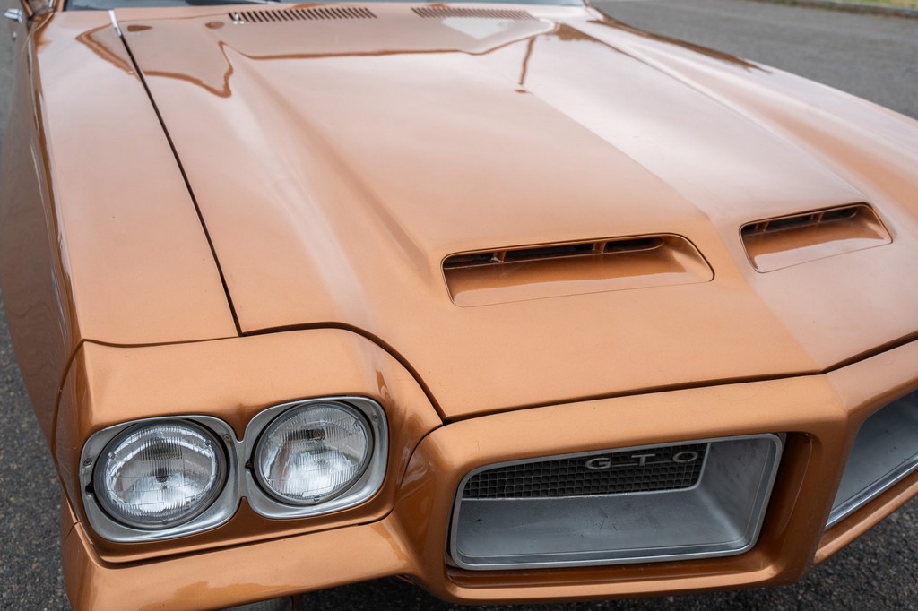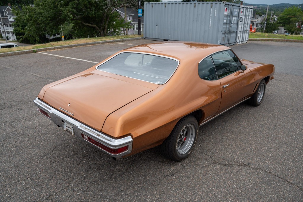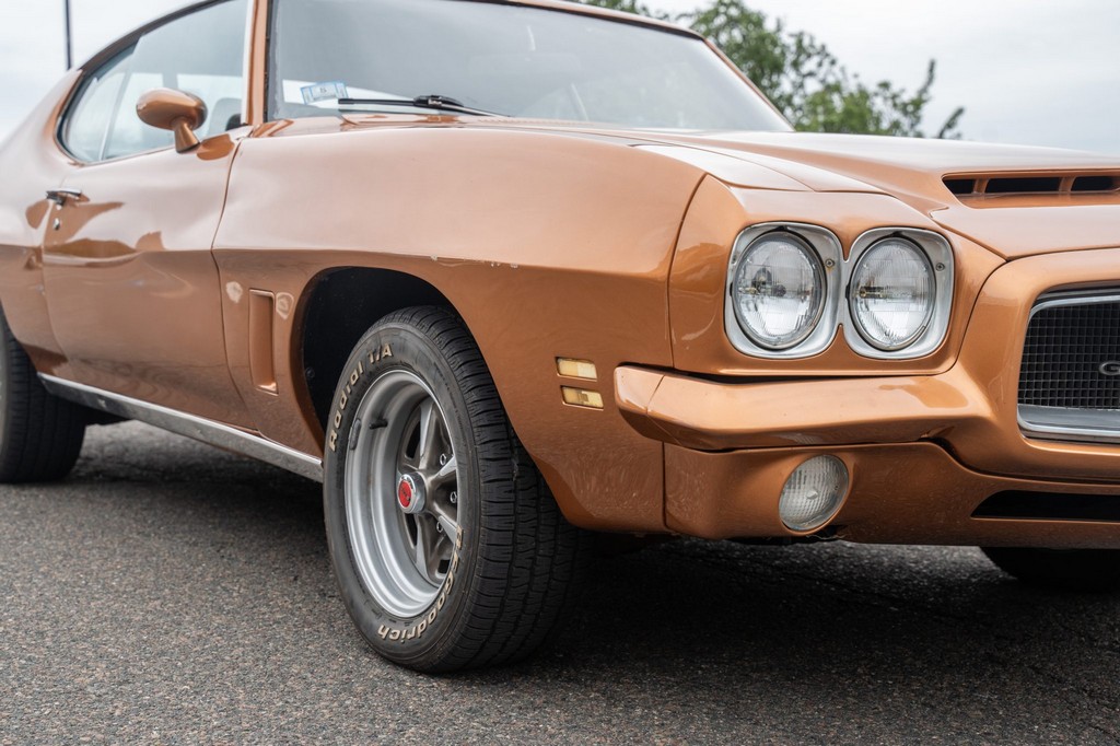 Power is delivered to the rear wheels through an overhauled Muncie four-speed manual transmission fitted with a Hurst shifter, providing a direct and engaging driving experience. The exterior was refinished in Anaconda Gold, complementing the car’s muscular lines and classic Pontiac styling.