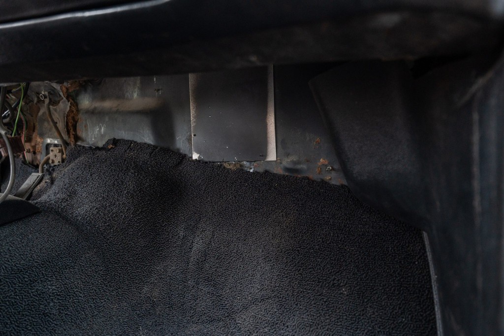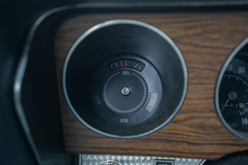 Inside, the cabin features black vinyl bucket seats, a center console, and woodgrain trim that maintain the period-correct look while offering comfort and driver focus. The car rides on 15-inch Rally II wheels and is equipped with four-wheel disc brakes, combining vintage appeal with improved stopping performance.