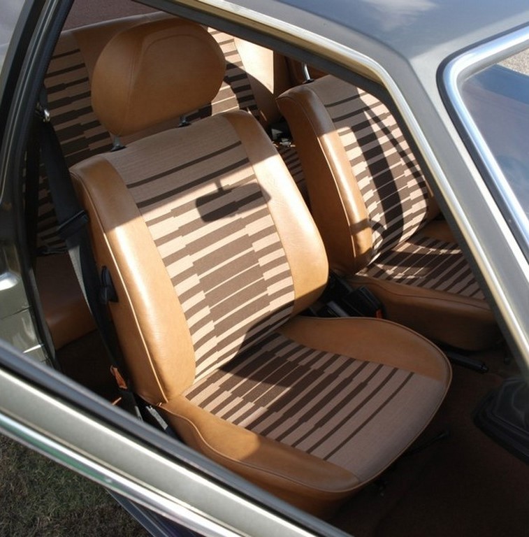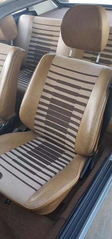 Original tan vinyl bucket seats with patterned cloth inserts remain in excellent condition.