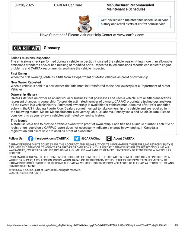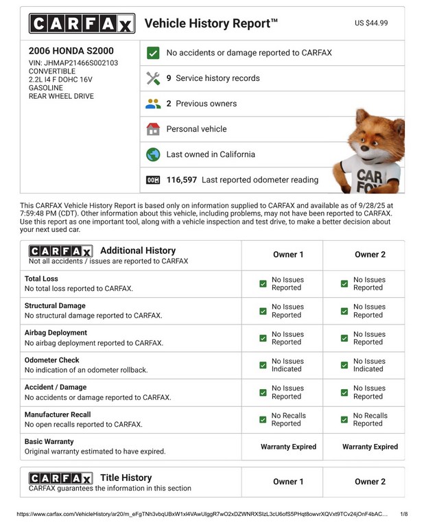 Clean Carfax report confirming no accidents or damage.