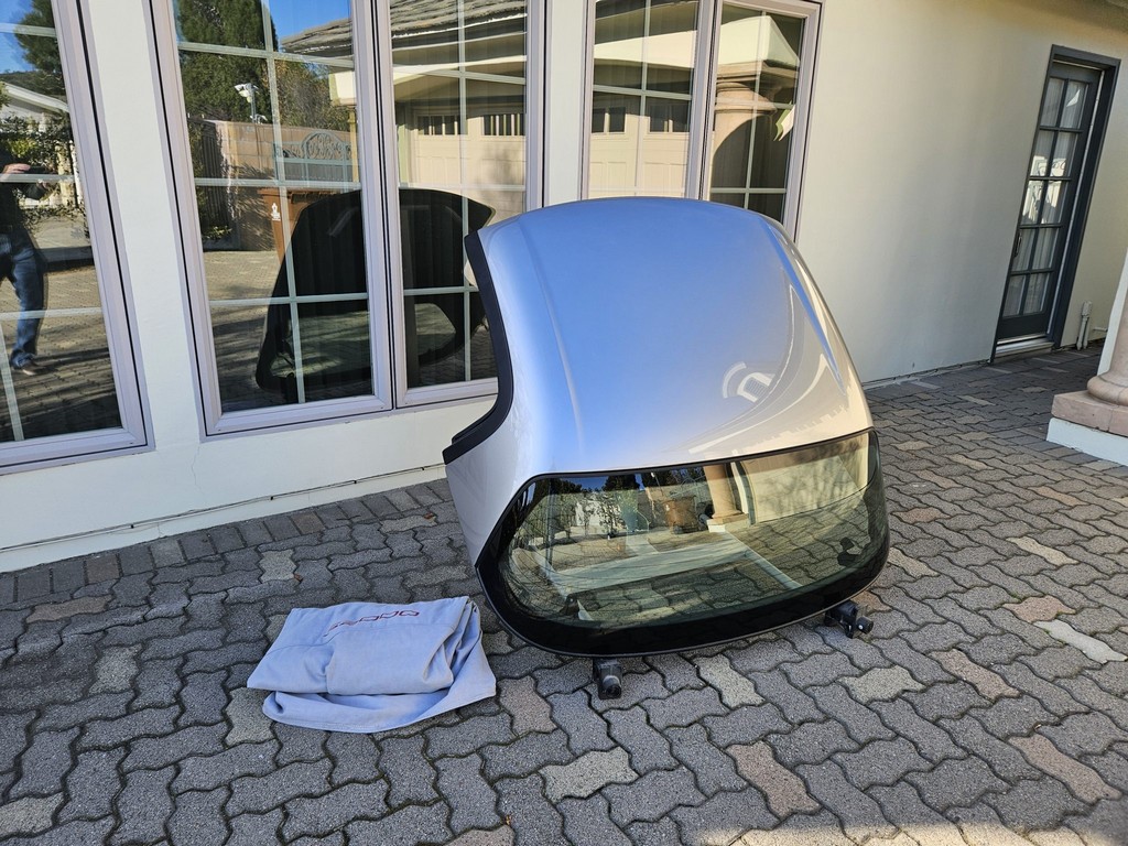 Features a power-operated replacement black soft top with glass rear window, plus a body-color removable hardtop with stand.