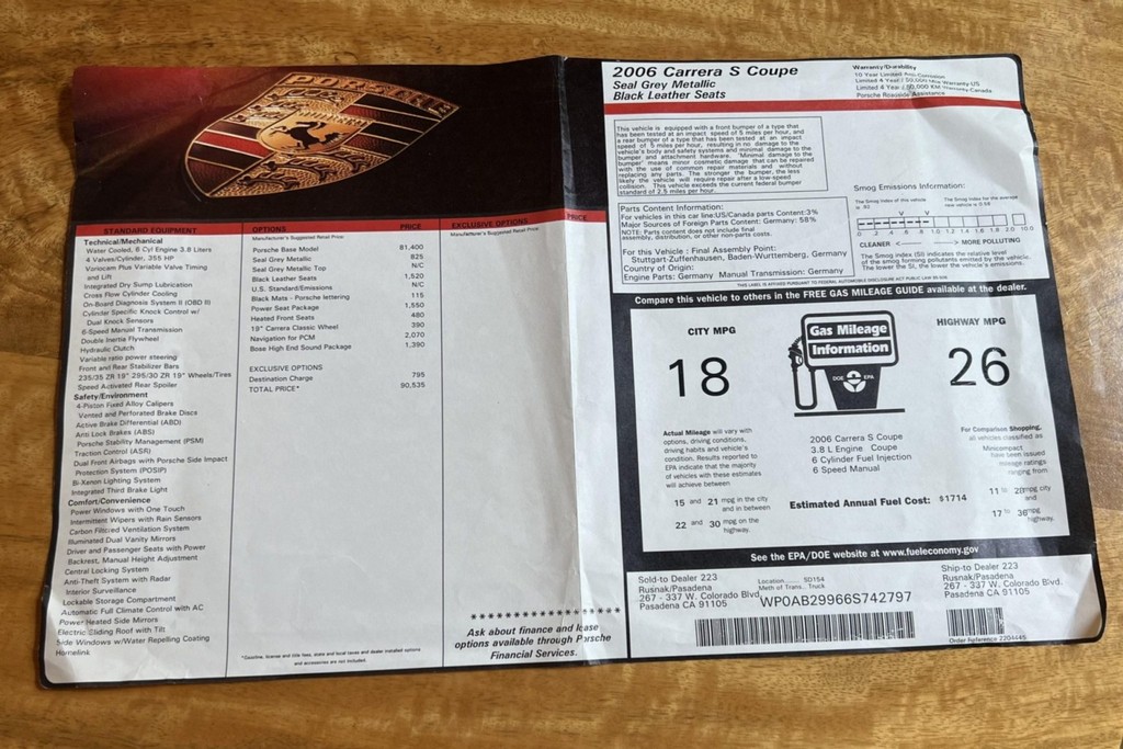This 2006 Porsche 911 Carrera S Coupe is powered by a 3.8-liter flat-six engine paired with a six-speed manual transaxle, delivering an engaging and dynamic driving experience true to Porsche’s heritage. Finished in Seal Gray Metallic over a black leather interior, this 997-generation Carrera S combines timeless styling with performance-oriented features.