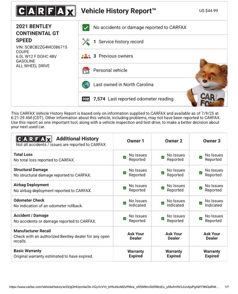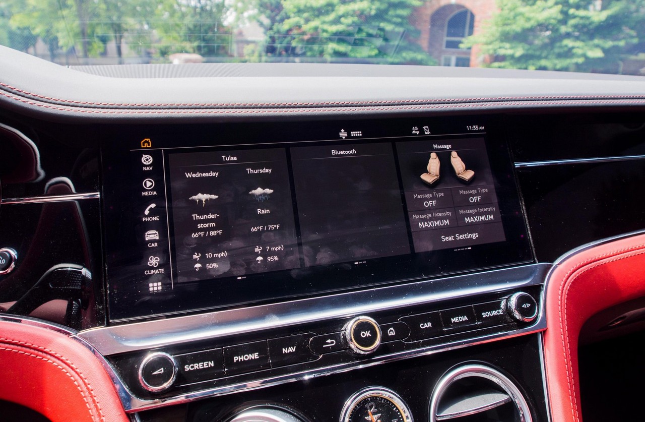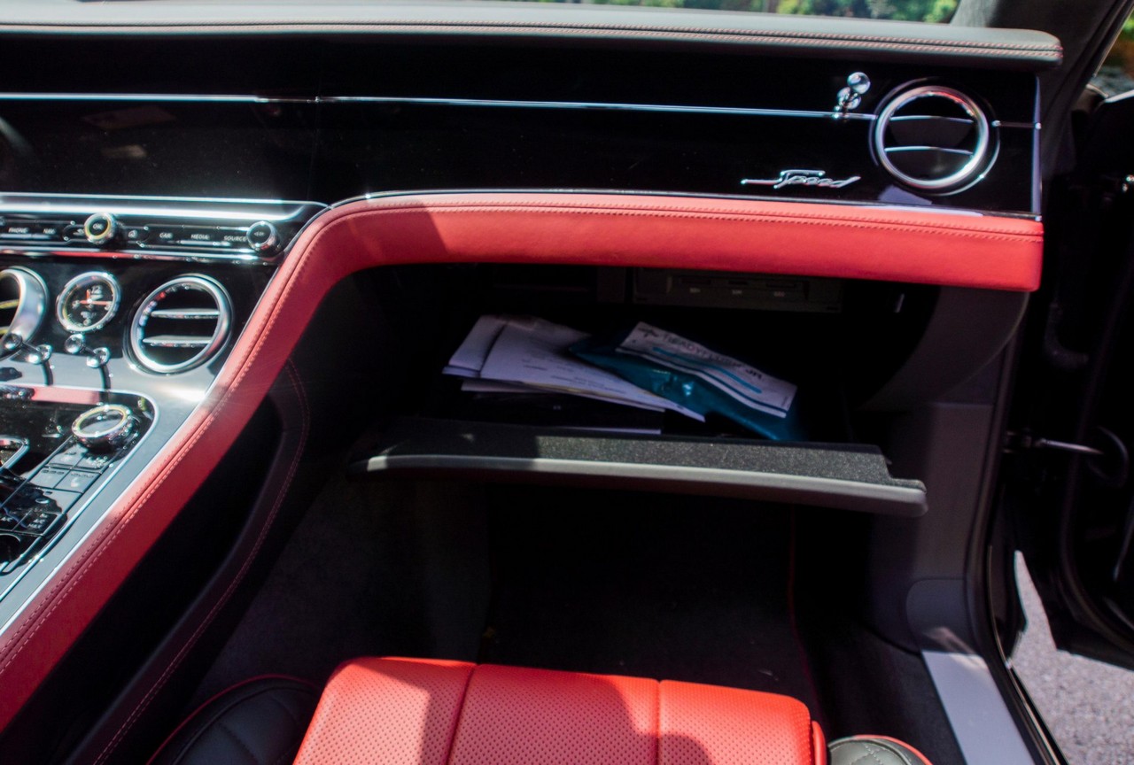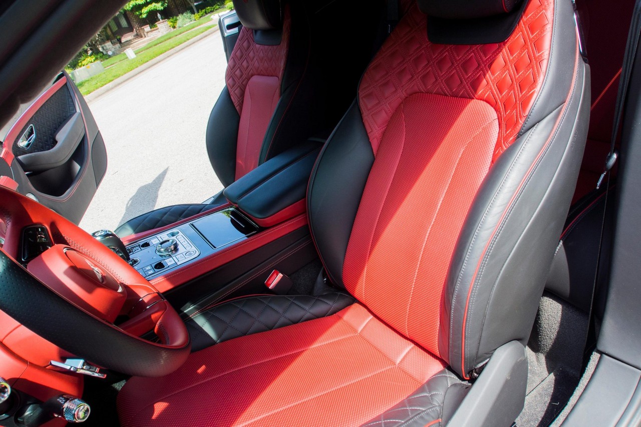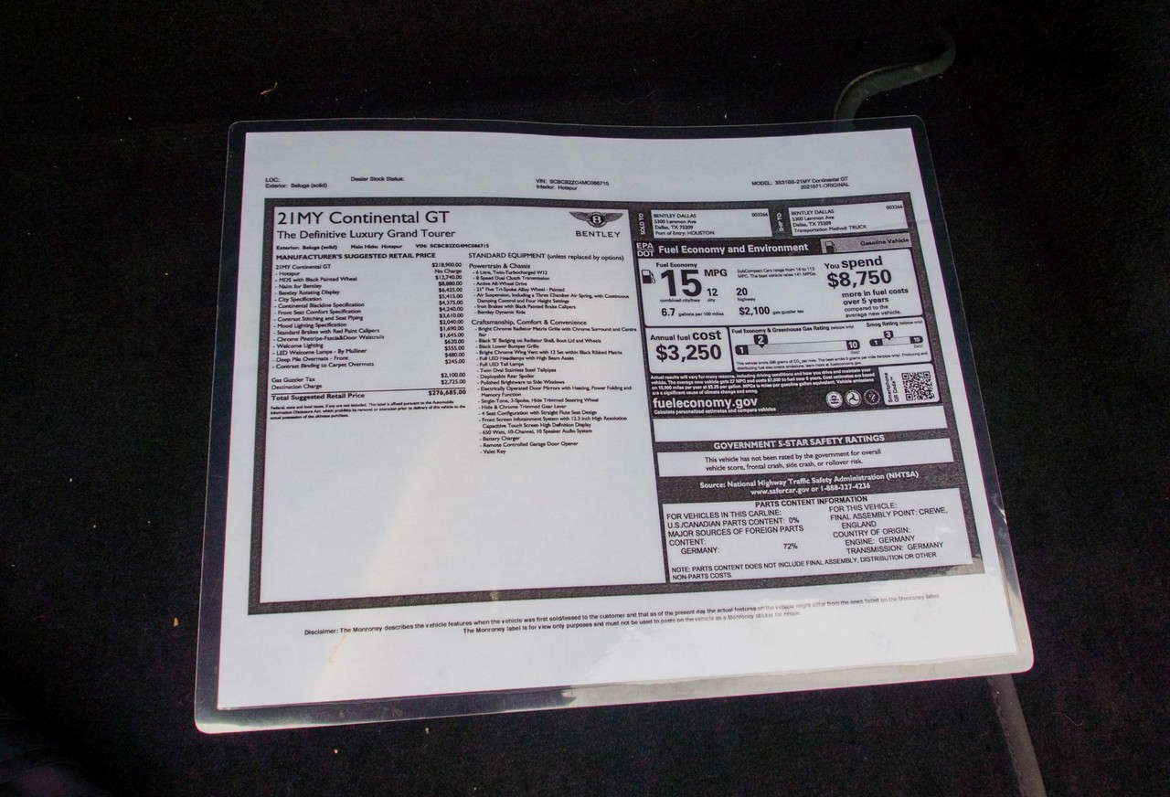 Inside, the cabin showcases heated and ventilated power-adjustable front seats, a head-up display, navigation, and Bentley’s signature rotating infotainment display. The premium Naim for Bentley sound system provides exceptional clarity, further enhanced by professionally installed aftermarket audio components. A radar detector has also been discreetly integrated. The vehicle retains its original window sticker and is accompanied by a clean Carfax report for added peace of mind.