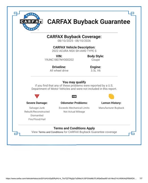 This 2022 Acura NSX Type S represents the ultimate evolution of Acura’s hybrid supercar and is one of the final, most desirable versions produced. Finished in Casino White over an Ebony semi-aniline full leather interior, it combines striking design with cutting-edge performance technology. Power is provided by a twin-turbocharged 3.5-liter V6 working in harmony with three electric motors, delivering instant torque, razor-sharp response, and exceptional all-wheel-drive traction through a nine-speed dual-clutch transaxle.
