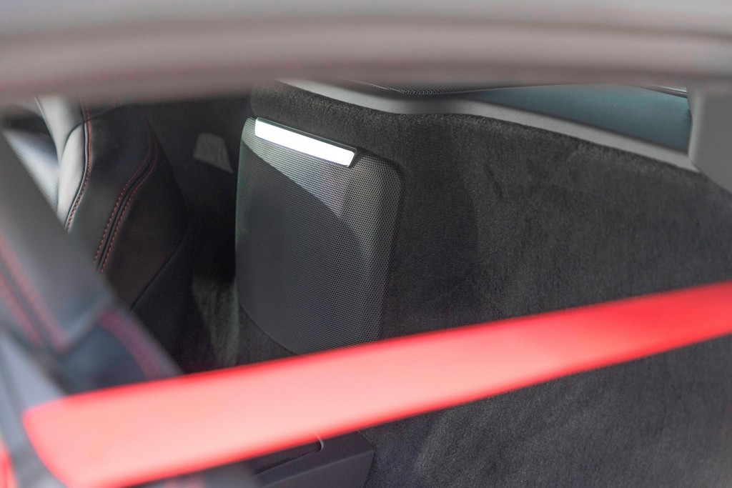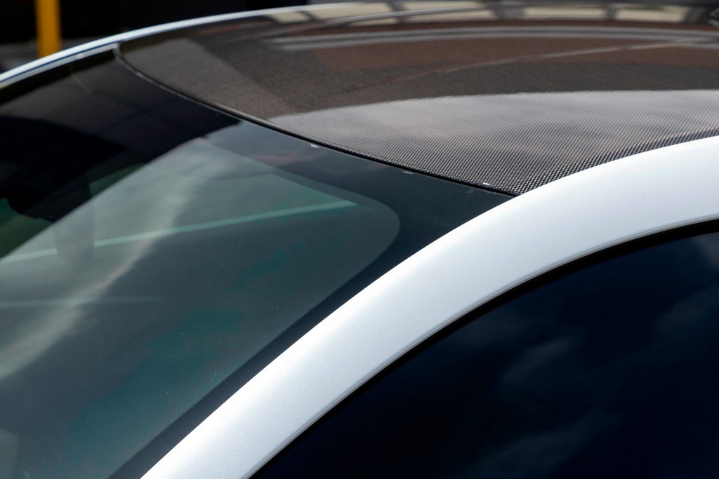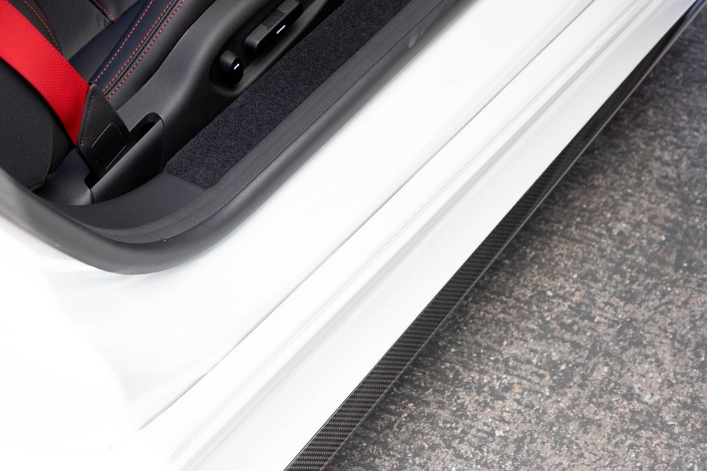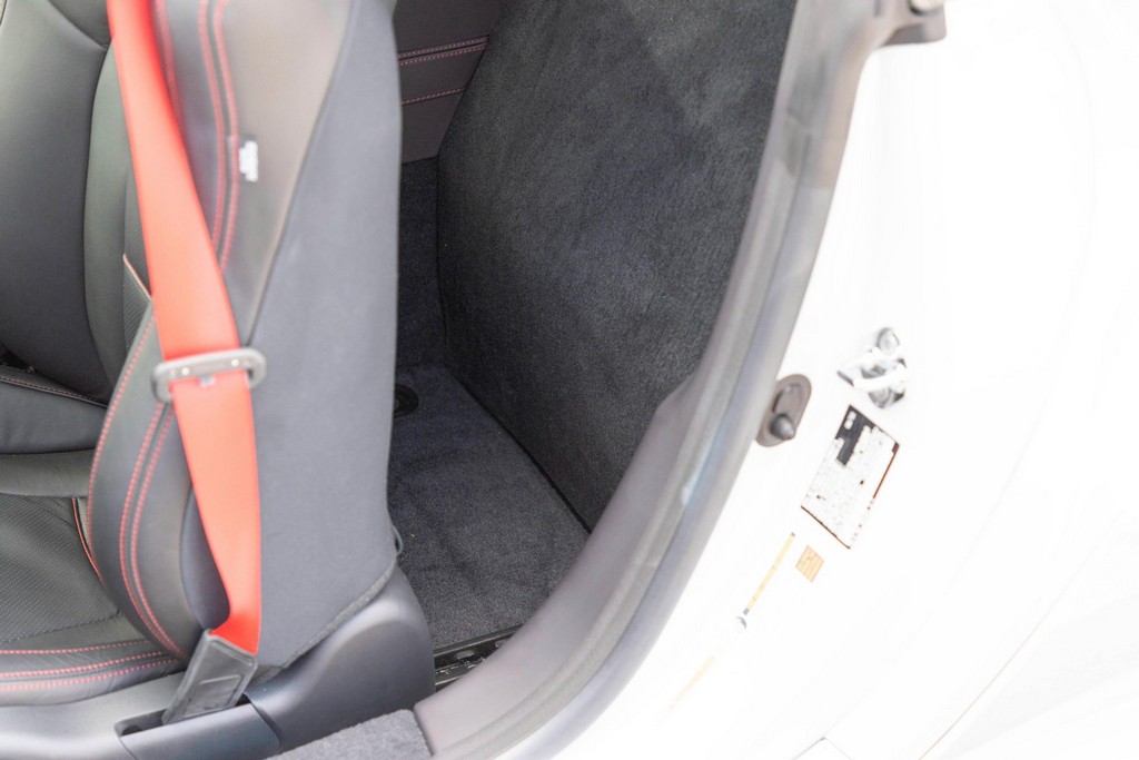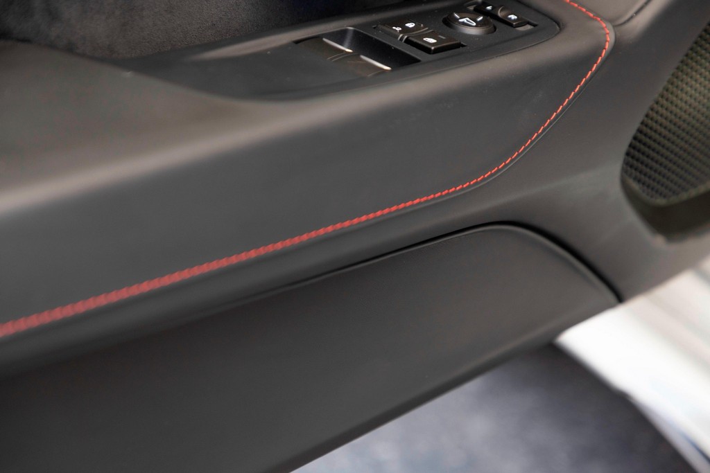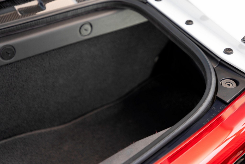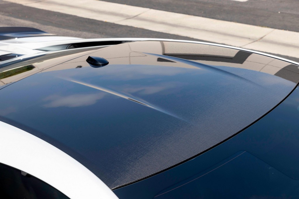 This example was factory-optioned with the $13,000 Lightweight Package, which adds Brembo carbon-ceramic brakes with red calipers and a carbon-fiber engine cover, reducing unsprung weight and enhancing braking performance. Extensive carbon-fiber exterior components include the roof, front splitter, side skirts, rear diffuser, and decklid spoiler, giving the car an aggressive and purposeful stance.