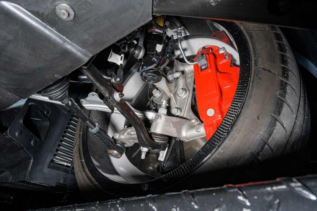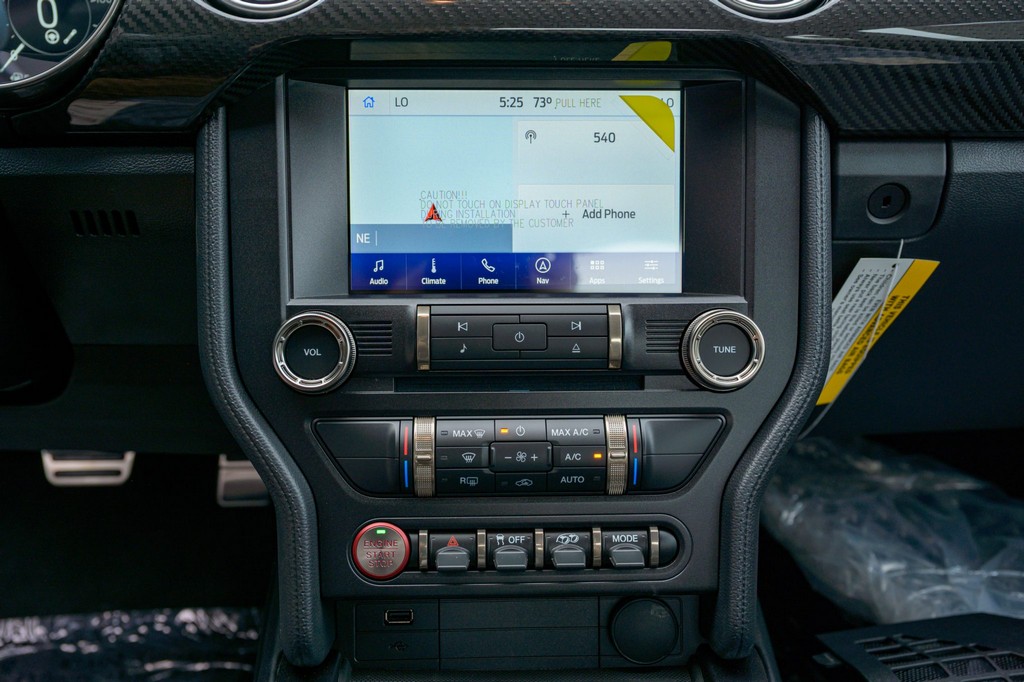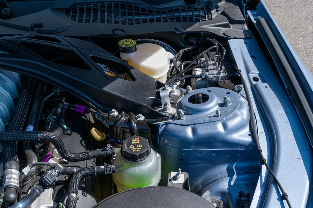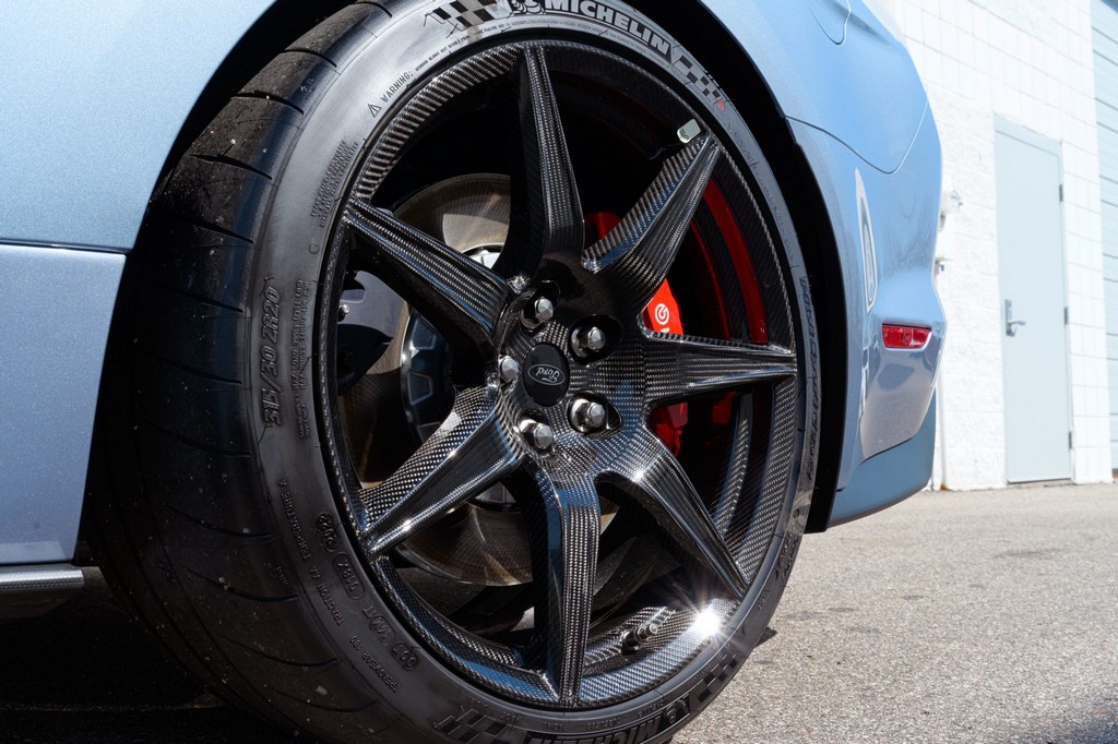 Power comes from a supercharged 5.2-liter V8, delivering brutal performance through a Tremec seven-speed dual-clutch automatic transmission and Torsen limited-slip differential. Performance hardware includes carbon-fiber 20″ seven-spoke wheels, massive Brembo brakes, and aggressive track-focused tuning, while still offering modern refinement.