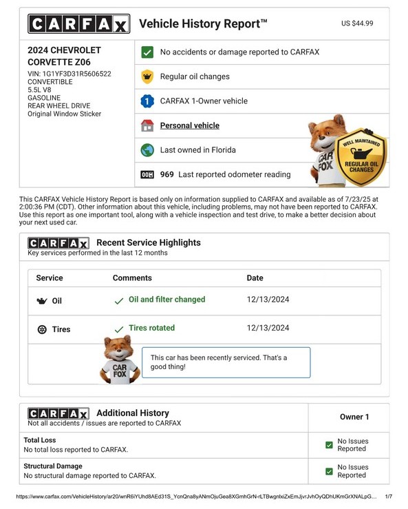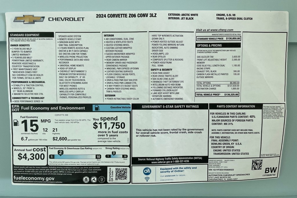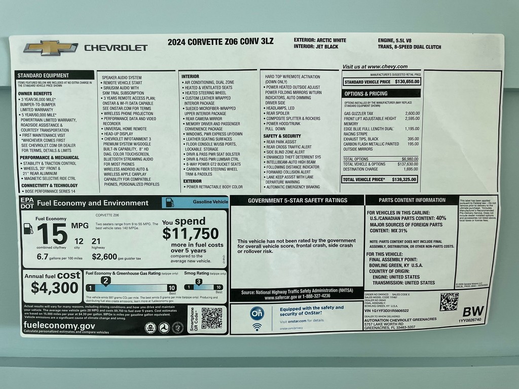 A one-owner 2024 Corvette Z06 Convertible 3LZ finished in Arctic White and powered by the high-revving 5.5-liter LT6 V8. With low mileage, premium equipment, and cutting-edge performance technology, this example delivers supercar-level capability combined with open-top exhilaration.