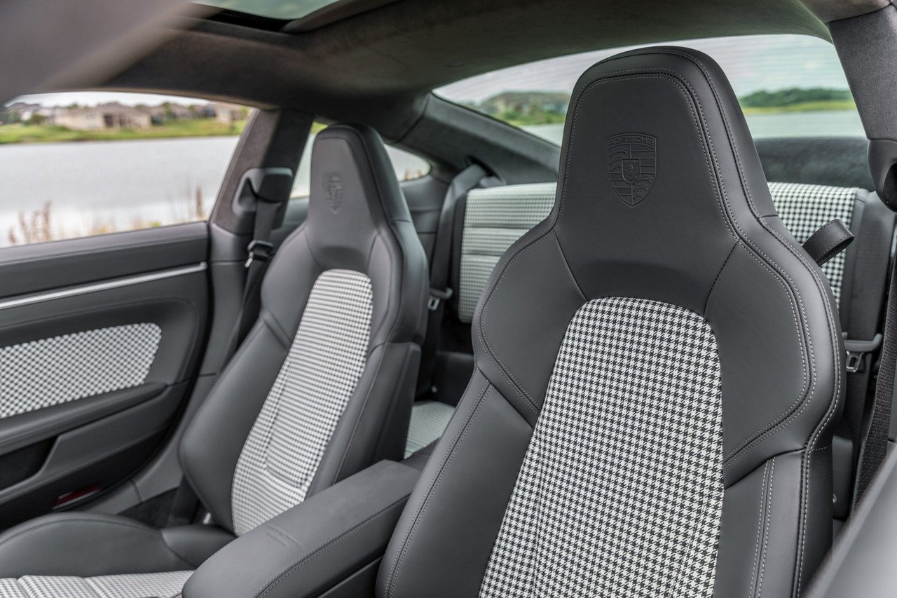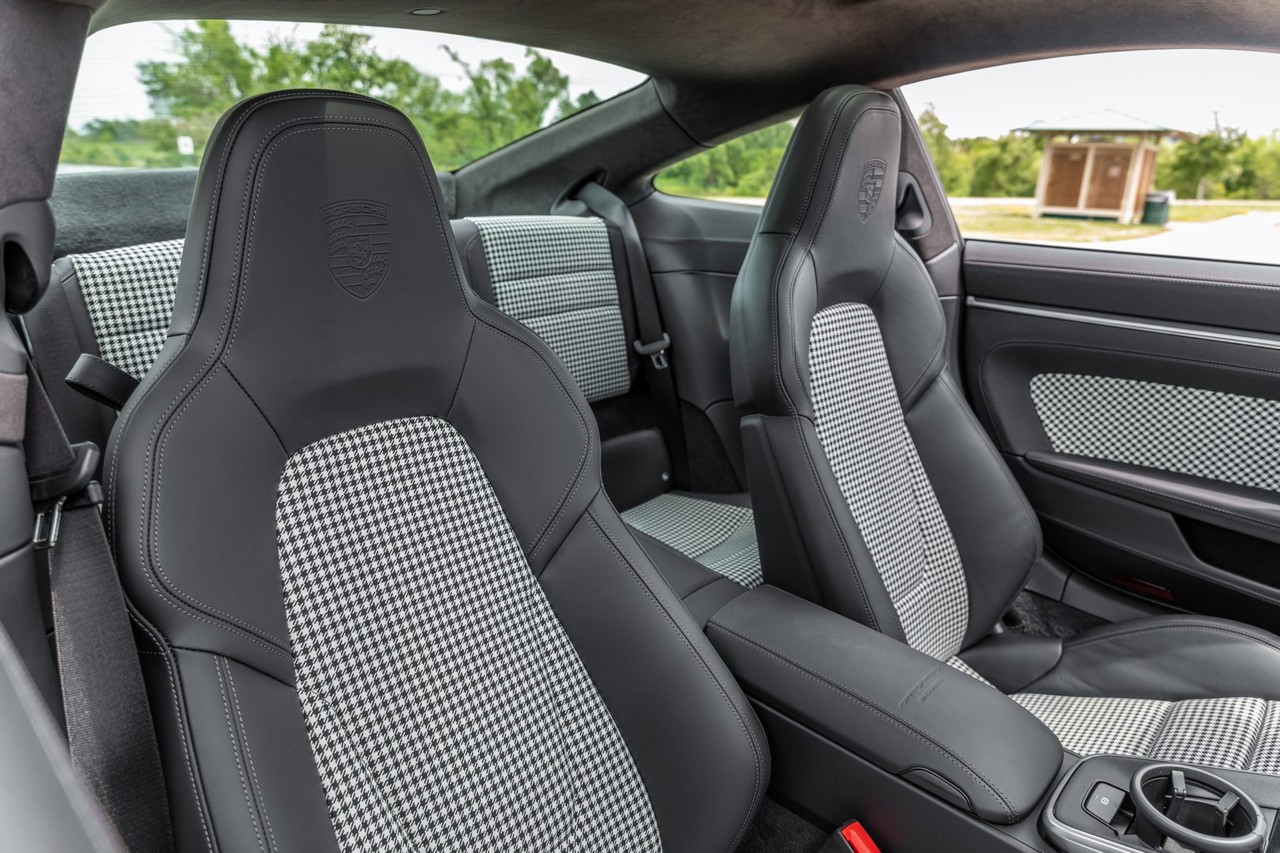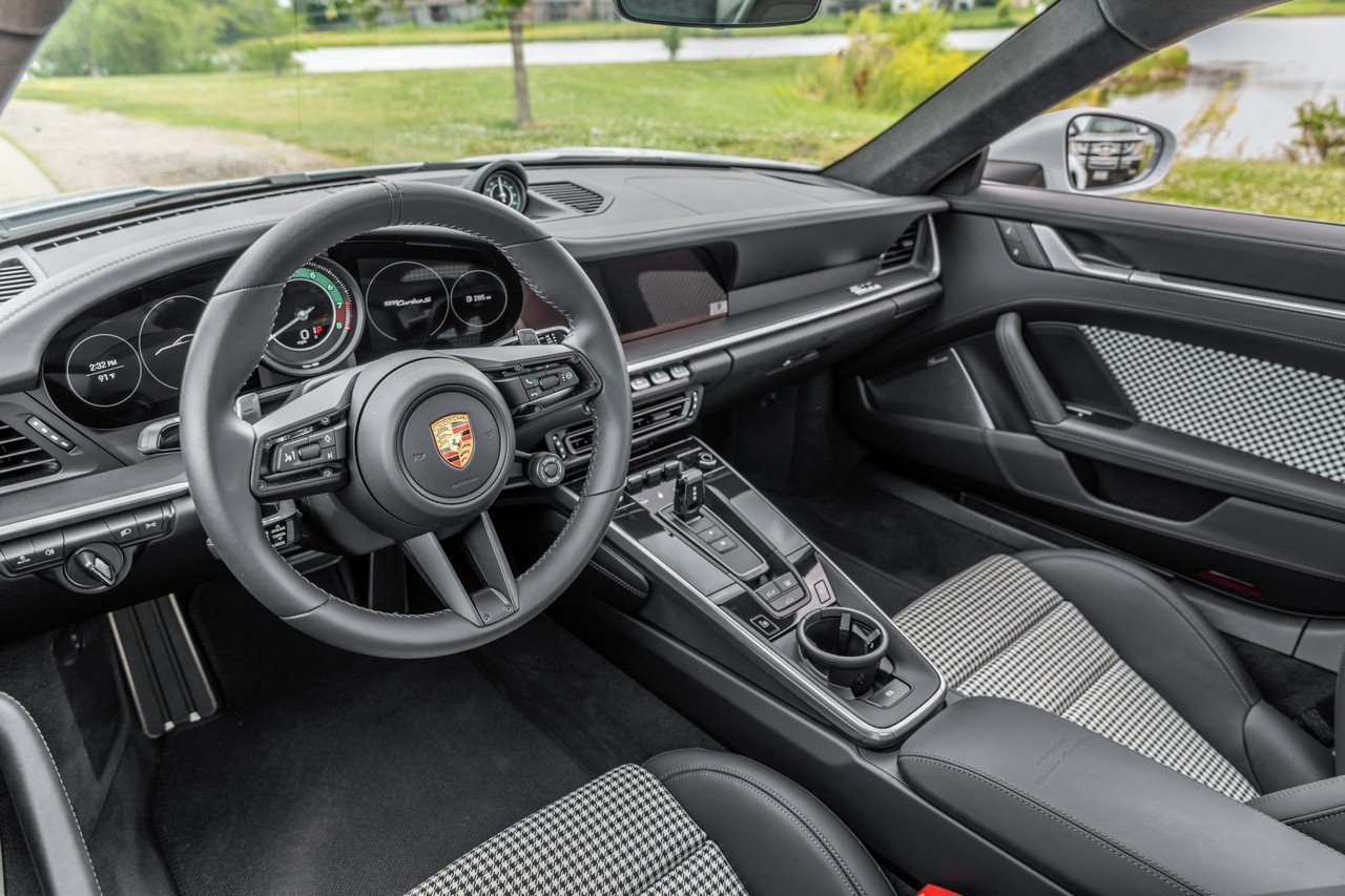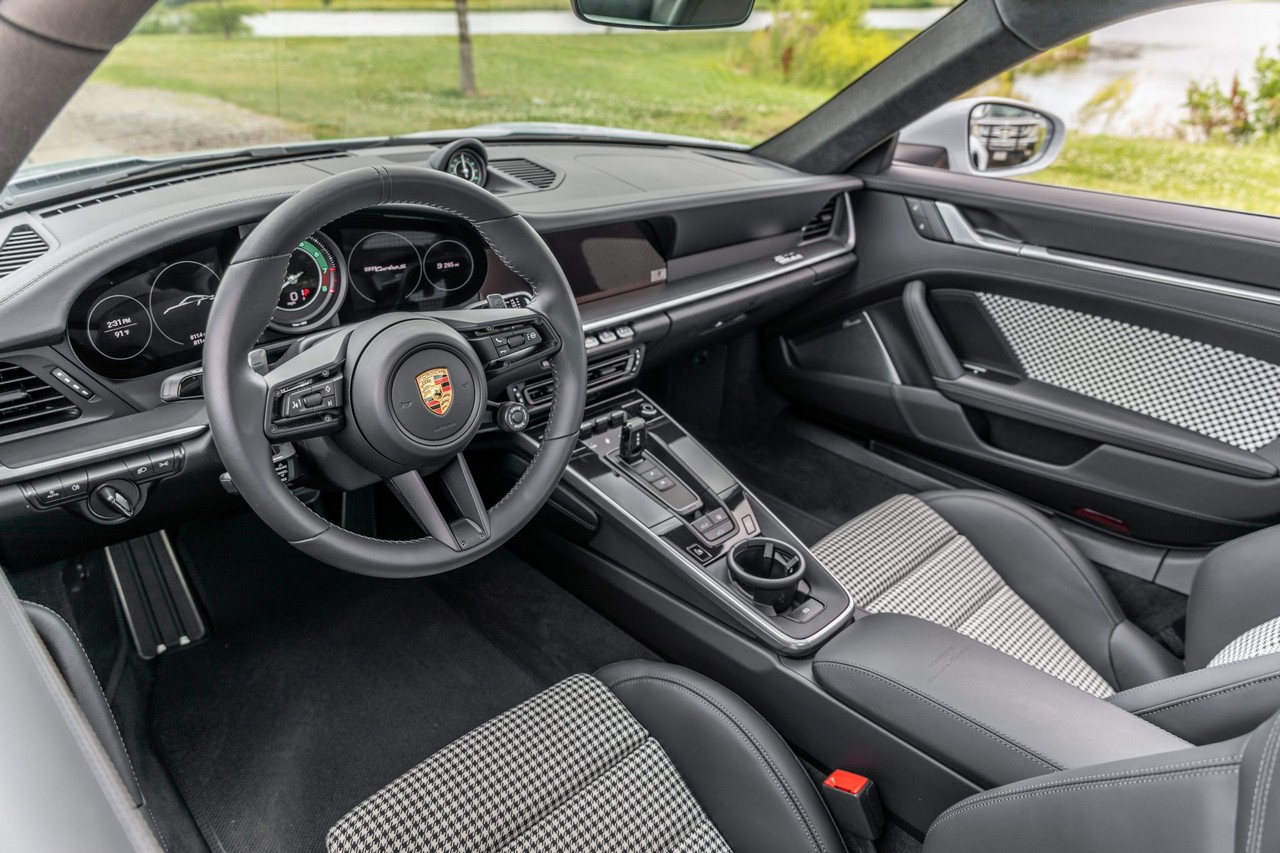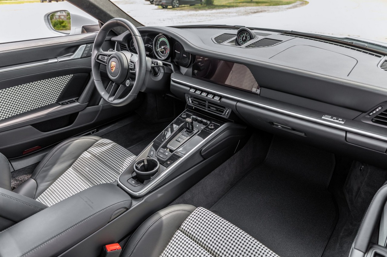 Inside, the cabin is appointed in black leather with Pepita cloth upholstery, combining heritage-inspired styling with contemporary luxury. The Heritage Design, SportDesign, and Sport Chrono Packages elevate both aesthetics and performance character. Advanced driver assistance features include Porsche InnoDrive with adaptive cruise control and active lane-keeping assist, offering refined long-distance comfort without compromising performance DNA.