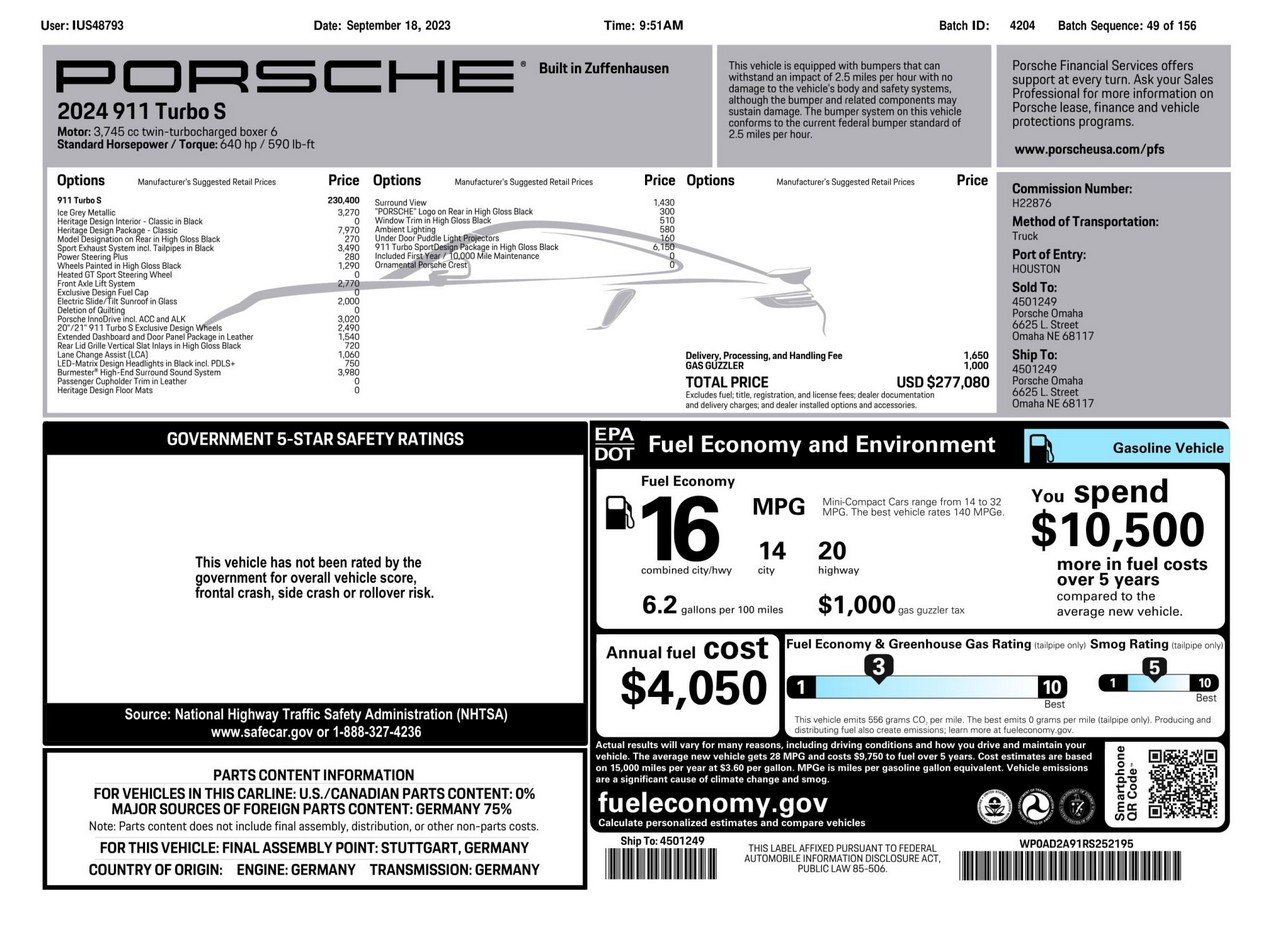 A meticulously optioned 2024 Porsche 911 Turbo S Coupe finished in Ice Gray Metallic over a distinctive black leather and Pepita interior. With its twin-turbocharged flat-six, PDK transmission, ceramic brakes, and extensive factory performance packages, this two-owner example represents a compelling opportunity to acquire one of the most complete and capable modern 911s available today.