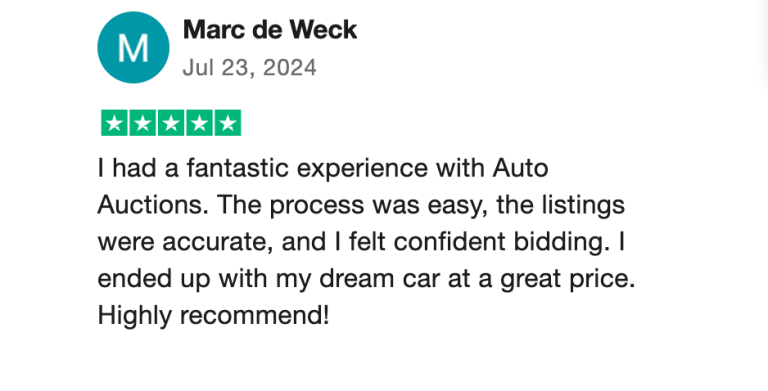 Highly recommend this platform for anyone looking for classic cars!” I’ve had a great experience with the auction! The process was smooth, and my vehicle arrived in perfect condition. I couldn’t be happier.